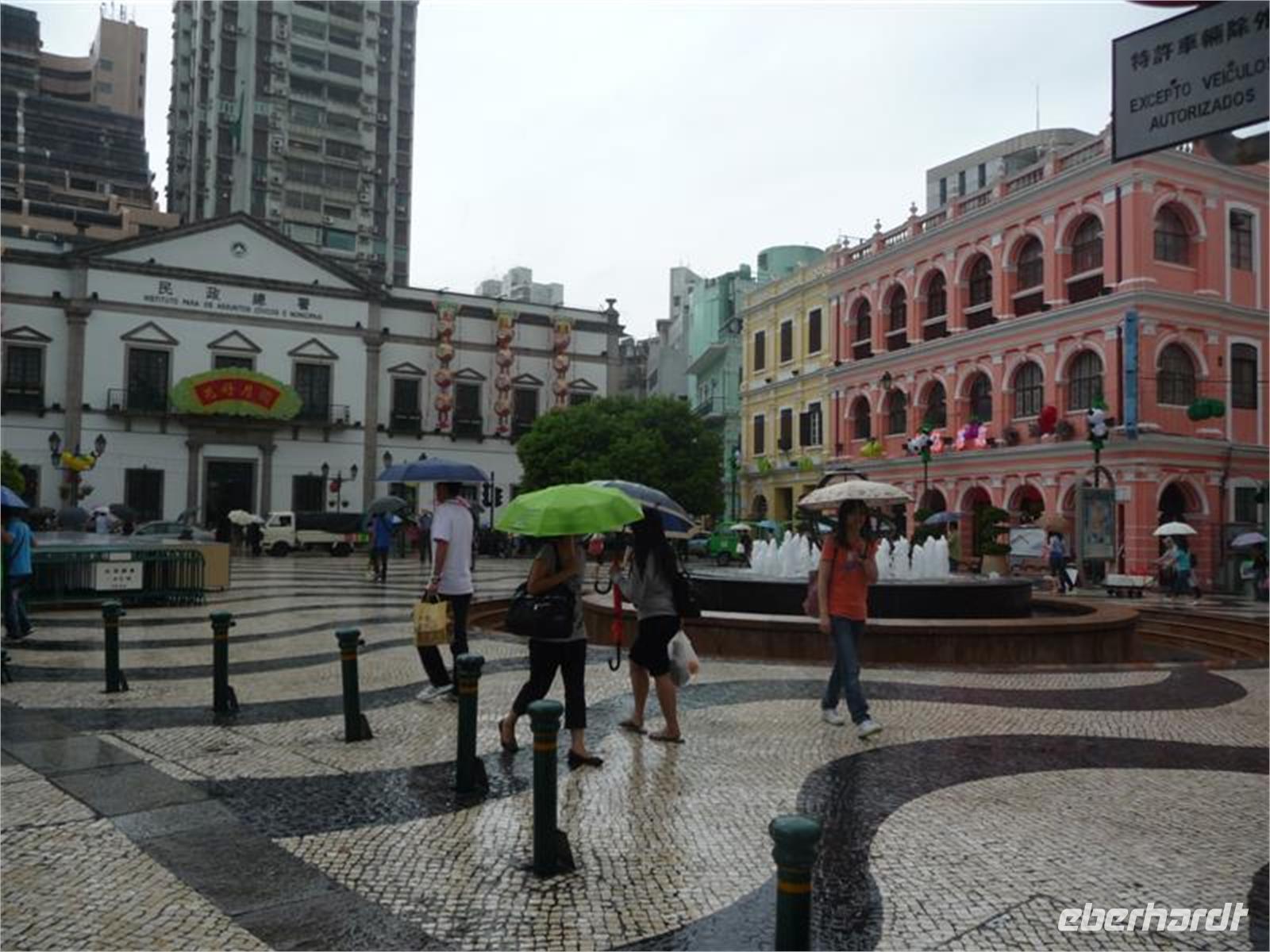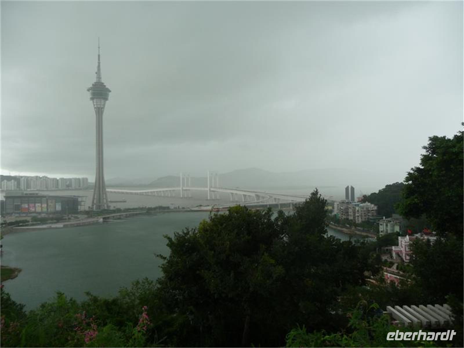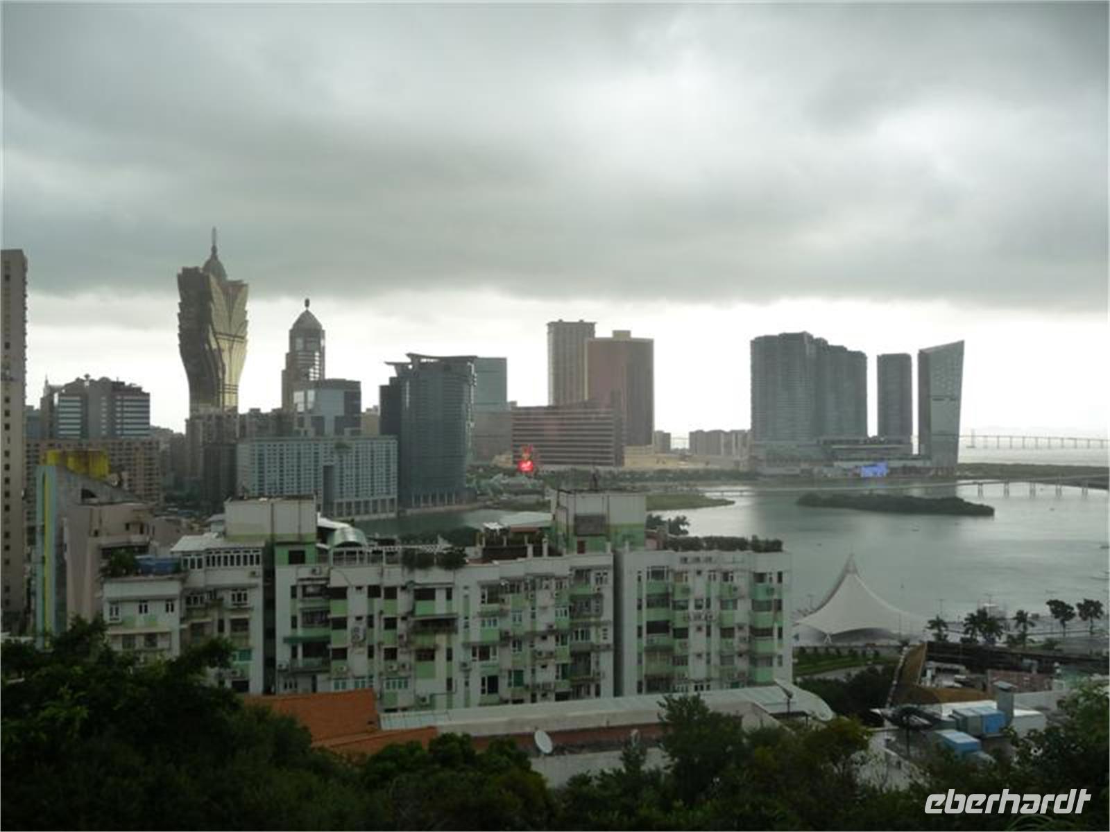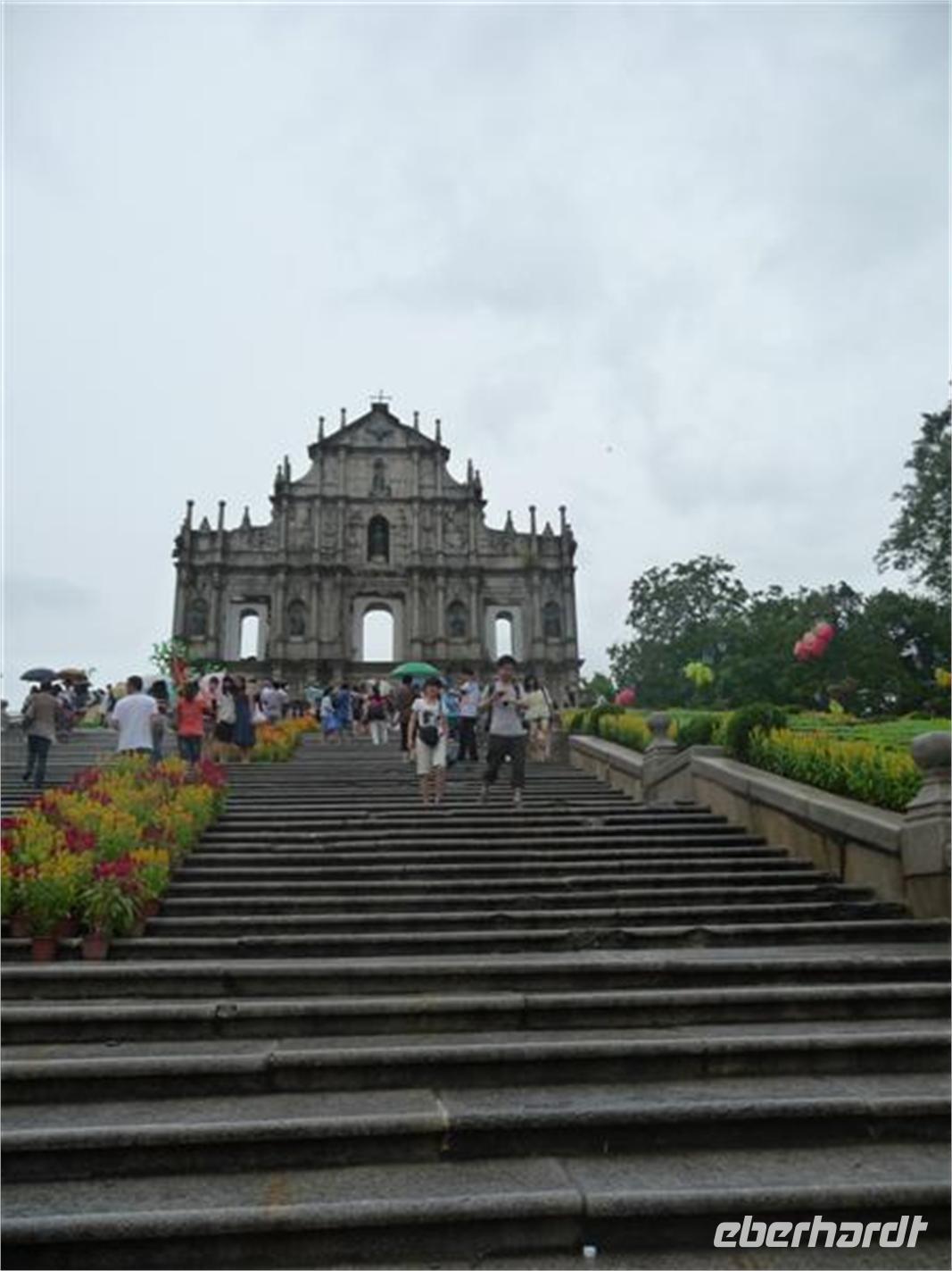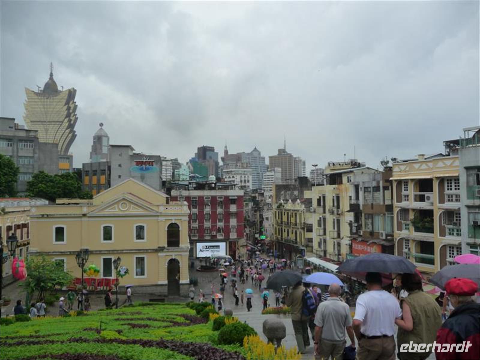 Der neue örtliche Reiseleiter für Macau und Hong Kong, Henry, holt uns auf der chinesischen Seite der Grenze ab und hilft uns bei der Einreiseprozedur nach Macau (Passkontrollen und Einreiseformular ausfüllen usw.). Diese nimmt eine ganze Weile in Anspruch, doch als wir endlich damit fertig sind, können wir mit den Besichtigungen in Macau beginnen - Kirche Ermida da Penha und Aussichtspunkt, A-Ma-Tempel, Casino und Einkaufszentrum „The Venetian" und Altstadt mit den Ruinen der Kirche St. Paul's. Mit dem Luftkissenboot fahren wir am Nachmittag von Macau nach Hong Kong und der recht starke Seegang schlägt einigen Gästen und mir ganz schön auf den Magen.