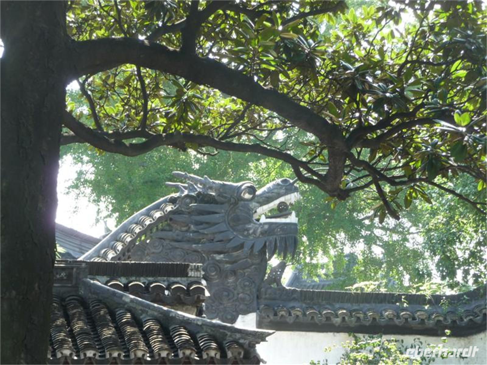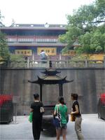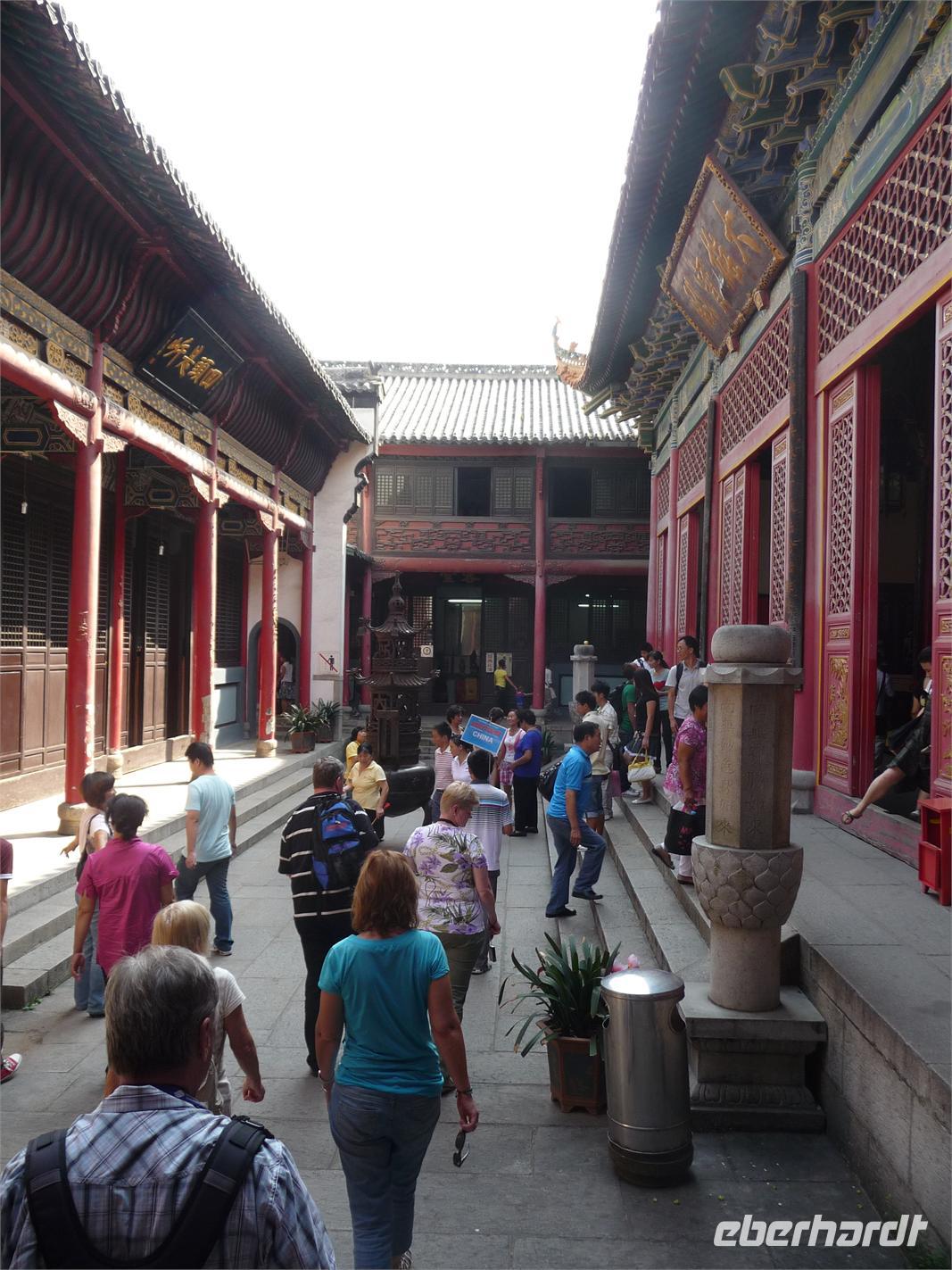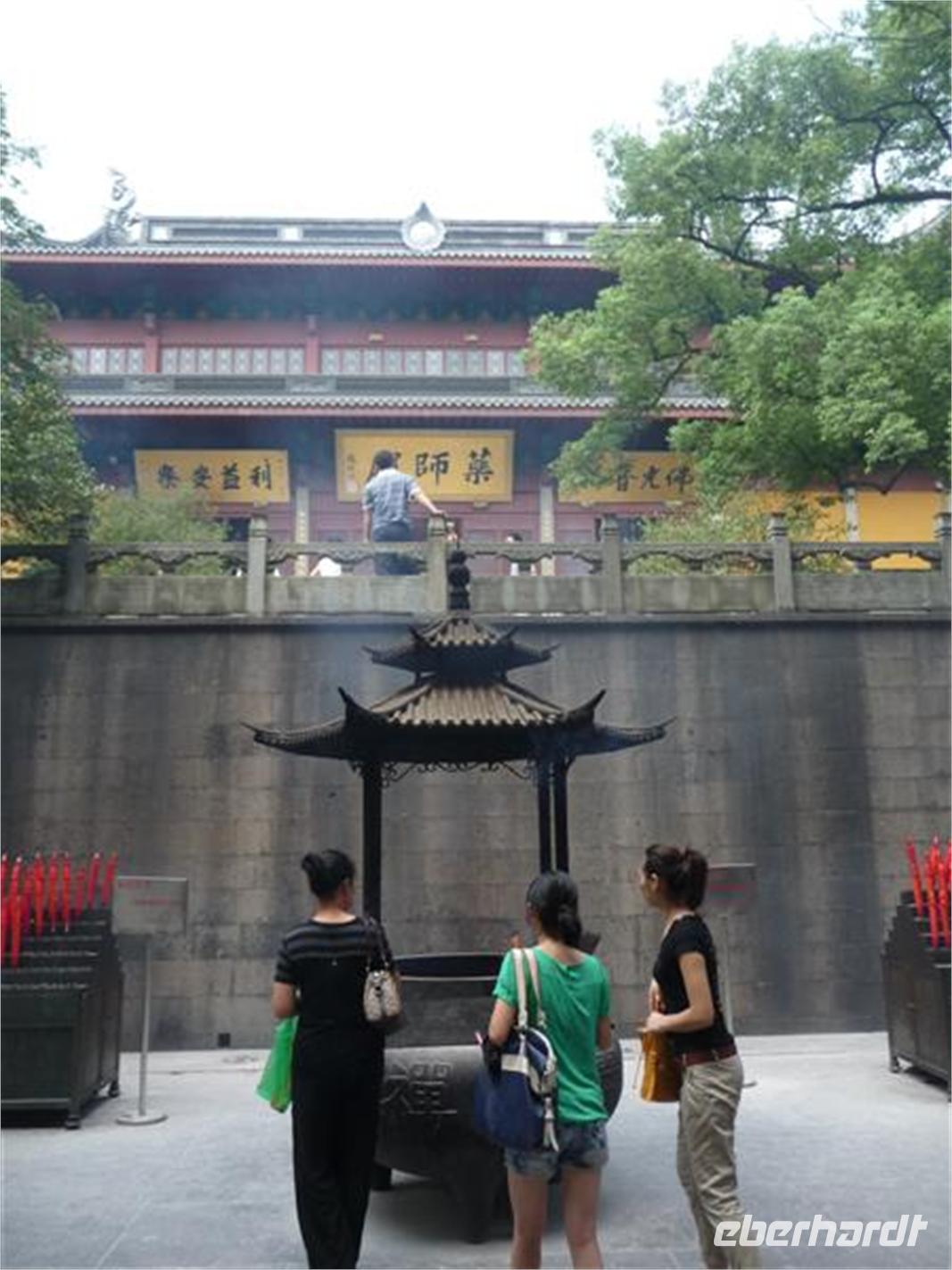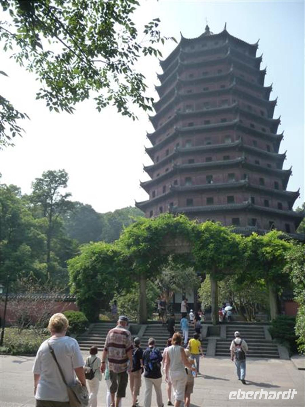Es folgt eine weitere Tempelbesichtigung. Doch der Lingyin-Tempel ist wieder ein wenig anders als die Tempel, die wir bisher besichtigt haben. Die Anlage ist sehr groß, schön schattig und es gibt viel zu entdecken. Besonders die 20 Meter hohe Buddha-Figur und die Halle mit den hunderten von Arhats - überlebensgroße Figuren der 500 heiligen Mönche - versetzen uns in Staunen. Anschließend fahren wir zur Sechs-Harmonien-Pagode. Es ist einfach zu heiß - keiner verspürt den Drang, auf die Pagode zu steigen und sei der Blick von oben noch so überwältigend.