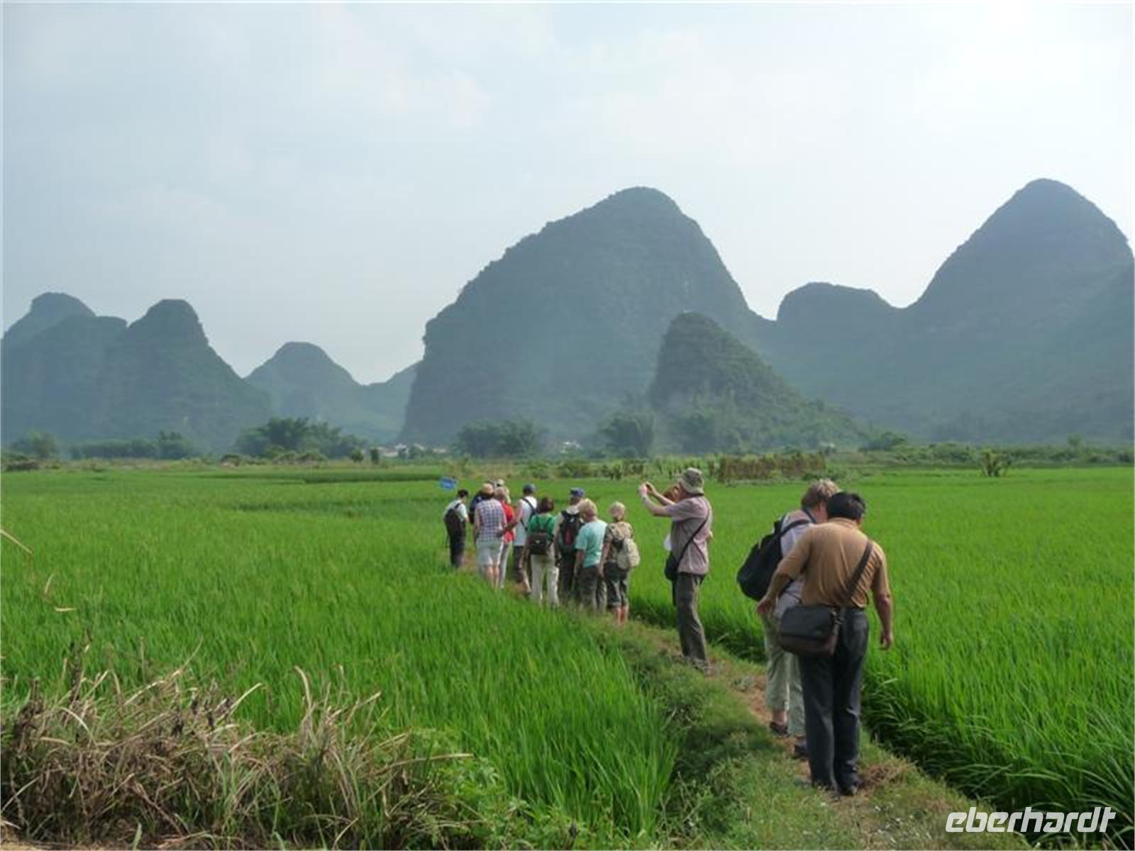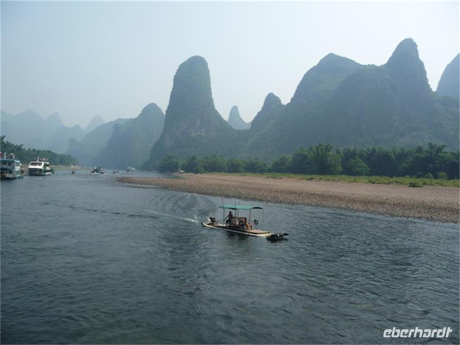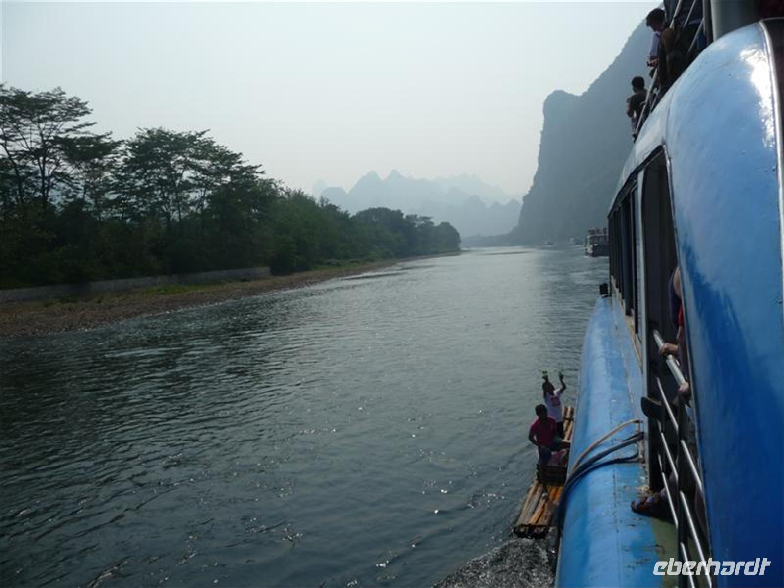 Auch heute scheint wieder die Sonne und es ist wahnsinnig heiß. Wir haben Hoffnung, dass während der Bootsfahrt auf dem Li-Fluss ein Lüftchen weht, doch das ist leider nicht der Fall. Zum Glück ist das untere Deck, in dem wir unsere Sitzplätze haben, klimatisiert. Das Mittagessen ist den Umständen entsprechend etwas einfacher, aber dennoch schmackhaft. Trotz der Wärme ist die Schifffahrt auf dem Li-Fluss durch die einzigartige Karst-Landschaft auf jeden Fall ein besonderes Erlebnis. Die Fahrt führt uns bis nach Yangshou, wo wir aussteigen und einen fakultativen Ausflug mit kleinen Elektrofahrzeugen (ca. 8 Personen pro Auto) - Kosten 120 Yuan pro Person - unternehmen. Wir fahren aufs Land, besuchen eine Bauernfamilie und dürfen einen kleinen Rundgang in deren Haus machen, wir halten an einem Reisfeld und außerdem beim Mondberg. Auch wieder ein schöner Ausflug...