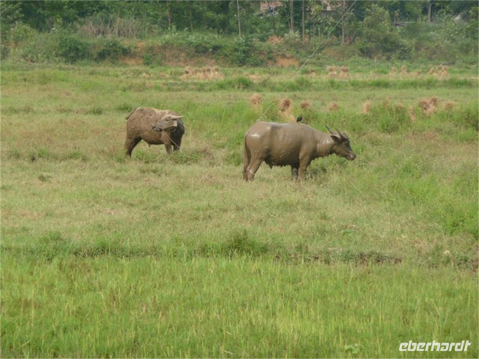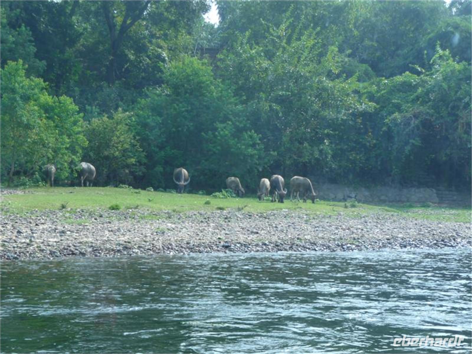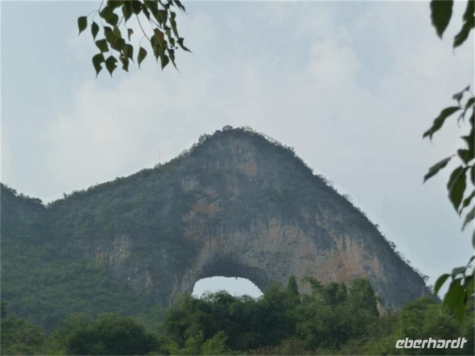 Auch heute scheint wieder die Sonne und es ist wahnsinnig heiß. Wir haben Hoffnung, dass während der Bootsfahrt auf dem Li-Fluss ein Lüftchen weht, doch das ist leider nicht der Fall. Zum Glück ist das untere Deck, in dem wir unsere Sitzplätze haben, klimatisiert. Das Mittagessen ist den Umständen entsprechend etwas einfacher, aber dennoch schmackhaft. Trotz der Wärme ist die Schifffahrt auf dem Li-Fluss durch die einzigartige Karst-Landschaft auf jeden Fall ein besonderes Erlebnis. Die Fahrt führt uns bis nach Yangshou, wo wir aussteigen und einen fakultativen Ausflug mit kleinen Elektrofahrzeugen (ca. 8 Personen pro Auto) - Kosten 120 Yuan pro Person - unternehmen. Wir fahren aufs Land, besuchen eine Bauernfamilie und dürfen einen kleinen Rundgang in deren Haus machen, wir halten an einem Reisfeld und außerdem beim Mondberg. Auch wieder ein schöner Ausflug...
