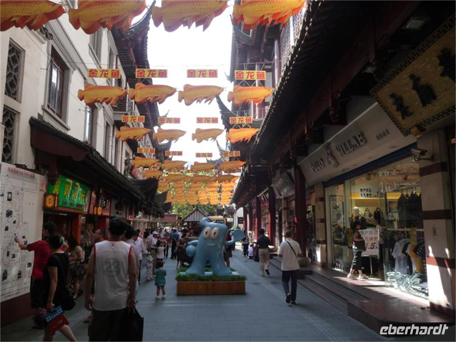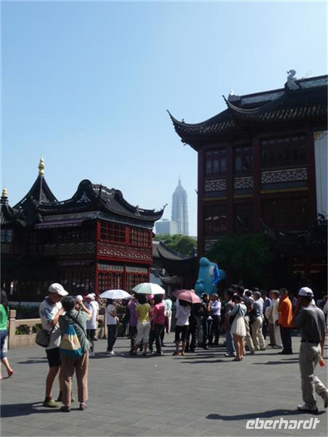 Zuerst machen wir den Yu-Garten und die Altstadt unsicher (mit Freizeit zum Bummeln), danach unternehmen wir eine Schifffahrt auf dem Huangpu-Fluss und sind sprachlos angesichts der Mega-Skyline von Shanghai. Anschließend bummeln wir ein wenig den Bund entlang und statten außerdem noch dem Volksplatz einen Besuch ab. Eigentlich sollte heute Abend ja das mongolische Abendessen stattfinden. Während der Fahrt zum Restaurant teilt uns die örtliche Reiseleiterin Christine jedoch mit, dass dies leider nicht möglich sei und wir in einem anderen, normalen chinesischen Restaurant zu Abend essen werden. Wir hatten uns alle schon sehr auf diese Abwechslung des mongolischen Essens gefreut und sind dementsprechend enttäuscht. Ein Telefonat mit dem Restaurant ergibt dann aber, dass es sich um einen Stromkurzschluss in der Küche handelte, alles repariert werden würde und wir dort am nächsten Tag zu Mittag essen könnten.