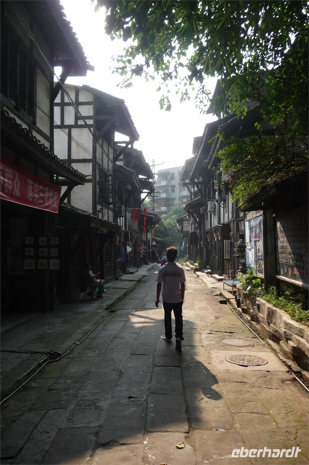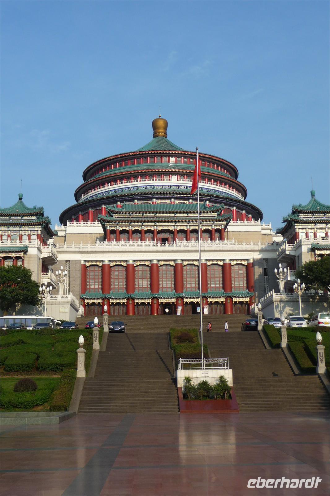In der Backofenstadt Chongqing spazieren wir durch die Gassen der Altstadt, sehen die Volkskongresshalle (in der Bauweise ähnelt diese sehr dem Himmelstempel in Peking). In dem kleinen Park auf dem Platz vor der Halle kommen wir gerade richtig zur "Opa-Oma-Disco" - viele ältere Leute tanzen, singen und machen Musik.
