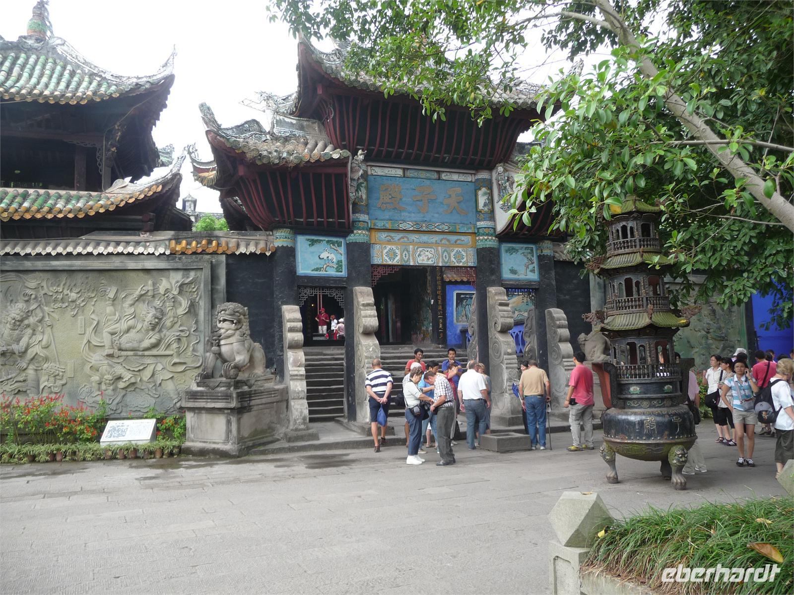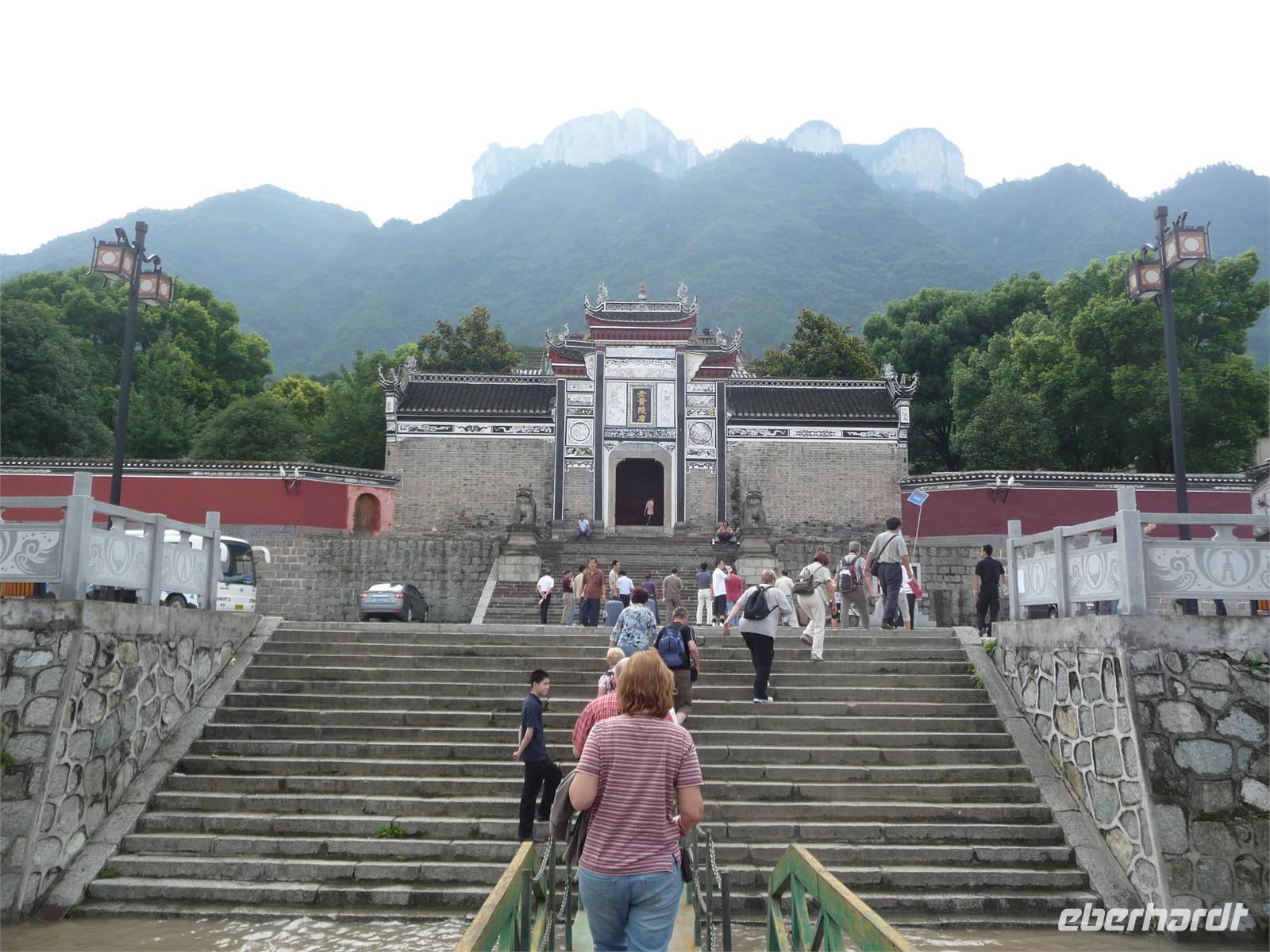 Heute steht ein Landausflug zur Geisterstadt Fengdu auf dem Programm. Da es sehr schwül-warm ist, nutzen einige Gäste die Möglichkeit, mit dem Sessellift hinaufzufahren. Die Hin- und Rückfahrt kostet zusammen nur 20 Yuan. Gemeinsam mit unserem chinesischen Reiseleiter Josef besichtigen wir die Tempelanlage, die die Heimat verstorbener Seelen sein soll.