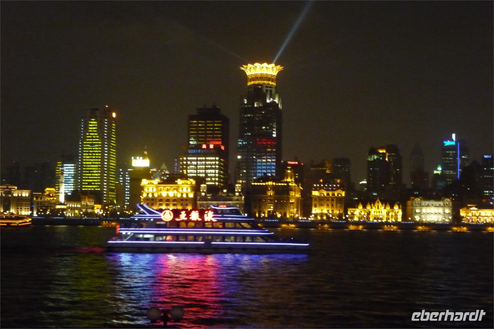 Anschließend fahren wir zum Hotel und nach dem Check-In haben wir Zeit zum Frischmachen und Ausruhen. Das Abendessen lassen wir uns heute so richtig schmecken und einige Mutige probieren sogar einen Schluck vom Schlangenschnaps. Nach dem Abendessen unternehmen wir eine Lichterfahrt durch Shanghai (fakultativ) mit Stopp in Pudong, Fahrt durch das Expo-Gelände, kleinem Bummel über die Nanjing-Straße und durch das Xintiandi-Kneipen-und-Barviertel. Ein sehr schöner Abschluss des Tages - Shanghai bei Nacht ist einfach der „helle Wahnhsinn"!