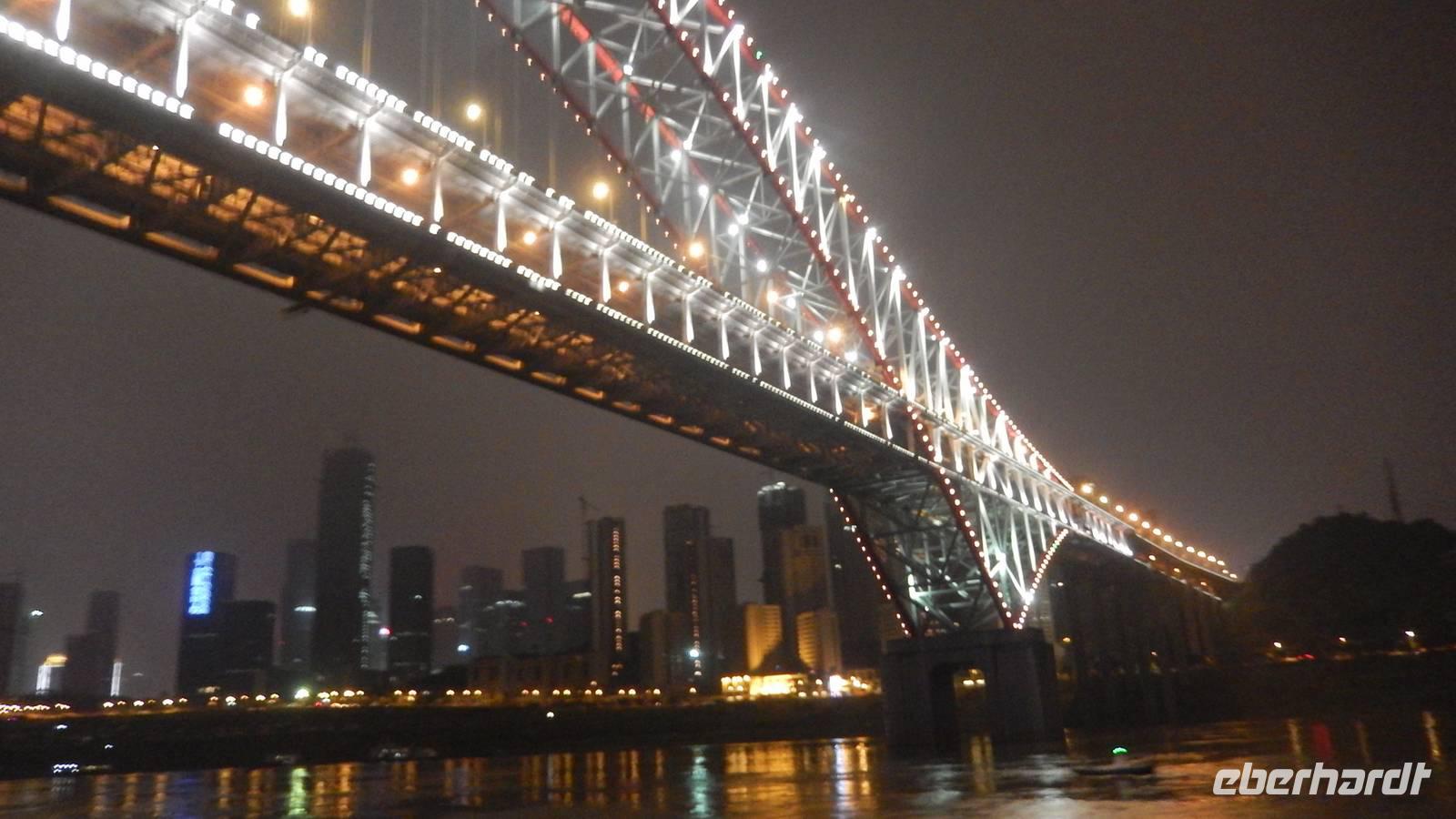 Bereits zur Abfahrt hatten wir unser Gepäck schon für den heutigen Inlandsflug zurecht gemacht. Zuerst besuchten wir aber noch die Wildganspagode von Xi'an. Der Aufstieg kostete einen kleinen Eintritt, wer nicht nach oben wollte, konnte sich aber auch die Zeit in den umliegenden kleinen Tempeln und Geschäften vertreiben. Weiter ging es in eine kleine Jadeschleiferei, wo wir die verschiedenen Qualitätsstufen der chinesischen Jade erklärt bekamen und sogar lernten, wie man echte und gefälschte Jade unterscheidet. Wer wollte, konnte sich ein kleines Schmuckstück als Andenken kaufen, wir erhielten sogar Gruppenrabatt. Unsere letzte Station in Xi'an sollte das muslimische Viertel sein. Rund um den Glockenturm gab es zahlreiche Einkaufsstraßen, wir schlenderten vor allem auf dem Basar herum und bestaunten die vielen exotischen Auslagen, wie Tintenfisch am Spieß oder gekochte Ziegenfüße. Schließlich fuhren wir zum Mittagessen und danach zum Flughafen, wo wir den Flieger nach Chongqing nahmen. Dort angekommen wurden wir zuerst von der opulenten Stadtbeleuchtung begrüßt. Wir erreichten den Hafen und mussten uns - bedingt durch einen Stau - nun beeilen, denn unser Hotel für die nächsten Tage war ein Schiff und dieses musste pünktlich ablegen. Trotzdem ging noch alles gut und an Bord der „Victoria Grace" konnten wir unsere gemütlichen Kabinen für die nächsten Nächte beziehen.