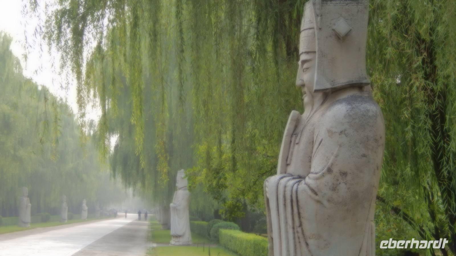 Ausgeschlafen und erholt erwartete uns heute etwas körperliche Ertüchtigung. Außerhalb von Peking besuchten wir die Große Mauer, die nicht nur von außen schwer zu erklimmen ist. Auf den vielen unterschiedlich hohen, relativ schmalen Stufen kraxelten wir Stück für Stück zu den zahlreichen Aussichtstürmchen. Natürlich konnte jeder selbst entscheiden, wie hoch er klettern möchte, oder einfach am Fuß der Treppe bei Eis, Kaffee oder Nudelsuppe verweilen. Nachdem wir uns sportlich aufgewärmt hatten, ging es weiter zum nächsten Ziel des Tages: Der Ming-Grabanlage. Wir betrachteten die weitläufige Anlage auf einer großen Karte und konnten schließlich individuell die Gedenkstätte und den Aussichtsturm erkunden. Ein kleines Stück entfernt lag dann die wunderschöne Geisterallee, gesäumt von herabhängenden Weiden und vielen gewaltigen Statuen verschiedener Kriegshelden und Nutztiere. Nach eunem ruhigen Spaziergang entlang der geschmückten Allee machten wir uns auf den Rückweg und legten einen Zwischenstopp am Olympiagelände ein. Hier konnten wir Fotos von den verschiedenen Stadien und dem Fackelturm schießen, bevor wir schließlich wieder unser Hotel erreichten. Zum Abendessen gab es natürlich wieder chinesische Kost von der Drehplatte, ob mit Gabel oder Stäbchen konnte jeder selbst entscheiden. Am Abend trafen wir uns noch einmal in der Lobby zum Besuch der Peking-Oper, praktischerweise direkt im Hotel gelegen. Die opulenten Kostüme begeisterten zwar, die „Musik" ist für die meisten Europäer dann doch eher gewöhnungbedürftig. Natürlich wurden verschiedene Stücke nur angespielt, sodass es viel für das Auge gab und schon nach 45 Minuten endete die Vorführung, die speziell auf uns ausländische Besucher zugeschnitten war.