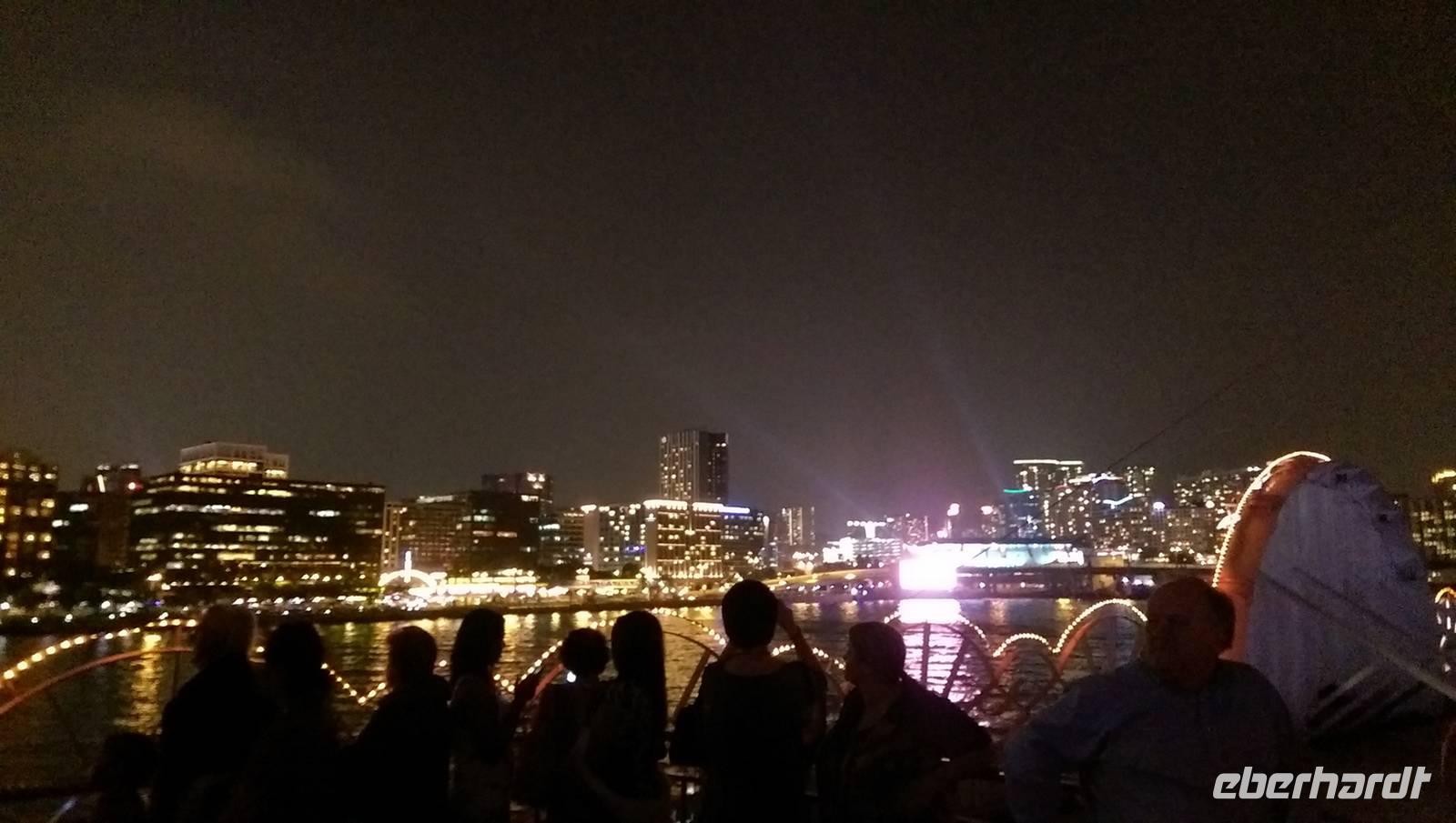Nach einer Nacht in Makau ging es heute wieder einmal weiter zur nächsten und nunmehr letzten Station unserer Reise: Hong Kong. Vom Fährhafen aus fuhren wir mit dem Schnellboot in Windeseile hinüber und auch hier begrüßte uns wieder eine örtliche Reiseleiterin namens May. Mit ihr besuchten wir zuerst die Aussichtsplattform Victoria Peak und konnten den Blick über die riesige Stadt schweifen lassen. Anschließend machten wir Halt in der Repulse-Bucht und gingen bei strahlendem Sonnenschein ein wenig am Strand spazieren. Zum letzten gemeinsamen Abendessen fuhren wir dann an Abend mit einem Schiff durch die Bucht innderhalb der Stadt und konnten ein leckeres Buffet genießen und auf dem oberen Deck die Lasershow zwischen den Wolkenkratzern bestaunen.