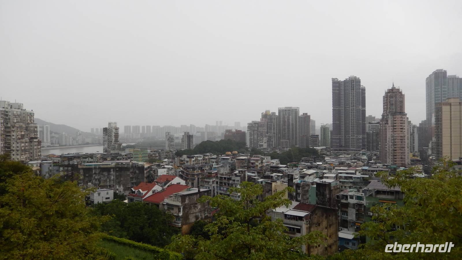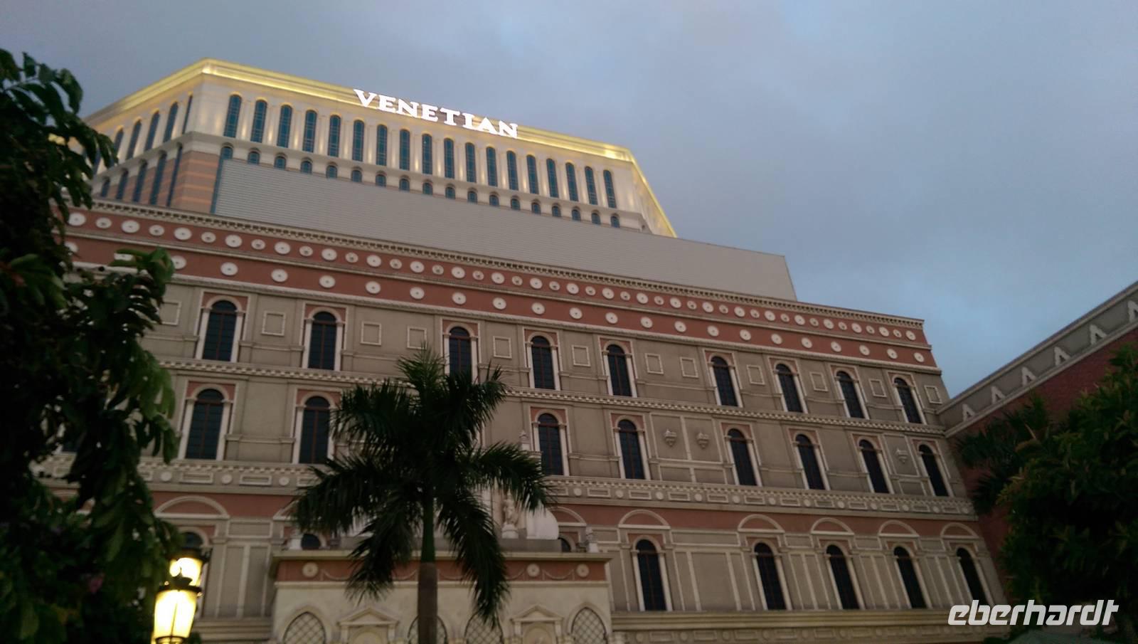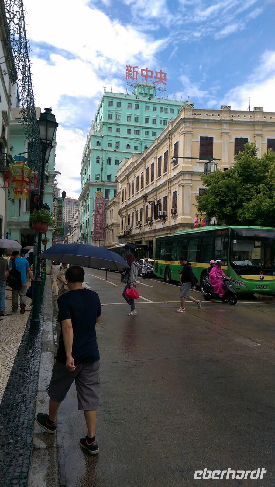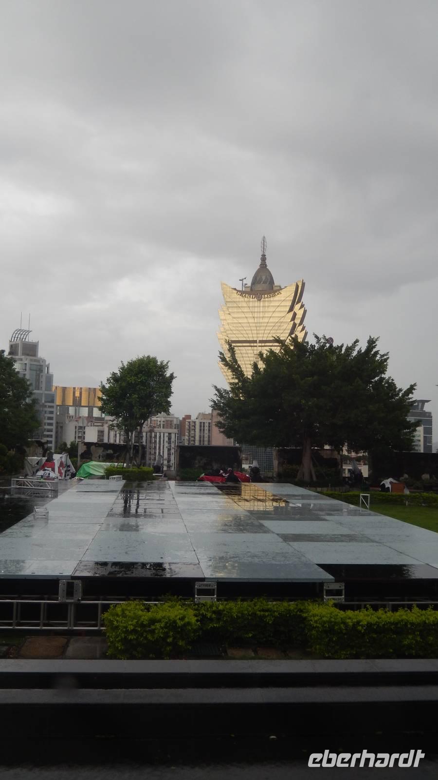 Gemeinsam mit Herr Chen fuhren wir heute zur Grenze nach Makau und verabschiedeten uns dort von ihm und auch vom Sozialismus, denn nun betraten wir ein autonomes Gebiet mit eigener Regierung und natürlich Kapitalismus. Reiseleiter Peter holte uns hinter der Grenze ab und wir begannen gleich mit unserem weiteren Programm. Zuerst besuchten wir das Stadtmuseum und lernten dort kurz und bündig viel über die Geschichte des Stadtstaats und die portugiesischen Einflüsse aus der Kolonialzeit. Vom Aussichtspunkt draußen hatten wir anschließend einen umfassenden Blick über die Stadt und gingen weiter zum Senatsplatz. Nach einer abenteuerlichen Geldtauschaktion im strömenden Regen stimmten wir uns darüber ab, das Programm voerst zu verkürzen, da es immer stärker regnete. Wir warfen einen kurzen Blick in die dominikanische Kirche und traten dann den Weg zum Hotel an. Dass nun plötzlich die Sonne strahlte, brachte uns leider wenig, da wir bereits alle durchnässt waren. Nach der Ruhepause im Hotel fuhren wir noch einmal hinaus und besuchten den Hotelkomplex „The Venetian". Im Inneren konnten wir durch das riesige Casino schlendern und anschließend den prunkvollen Einkaufskomplex bewundern. Wie in Las Vegas wurde hier eine komplette Etage in eine venetianische Landschaft verwandelt, stilecht mit Fluss, Gondeln und real anmutendem Himmel. Bei Abendessen erhielten wir schließlich viele portugiesische Spezialitäten, ganz anders als unsere bisherigen Mahlzeiten.