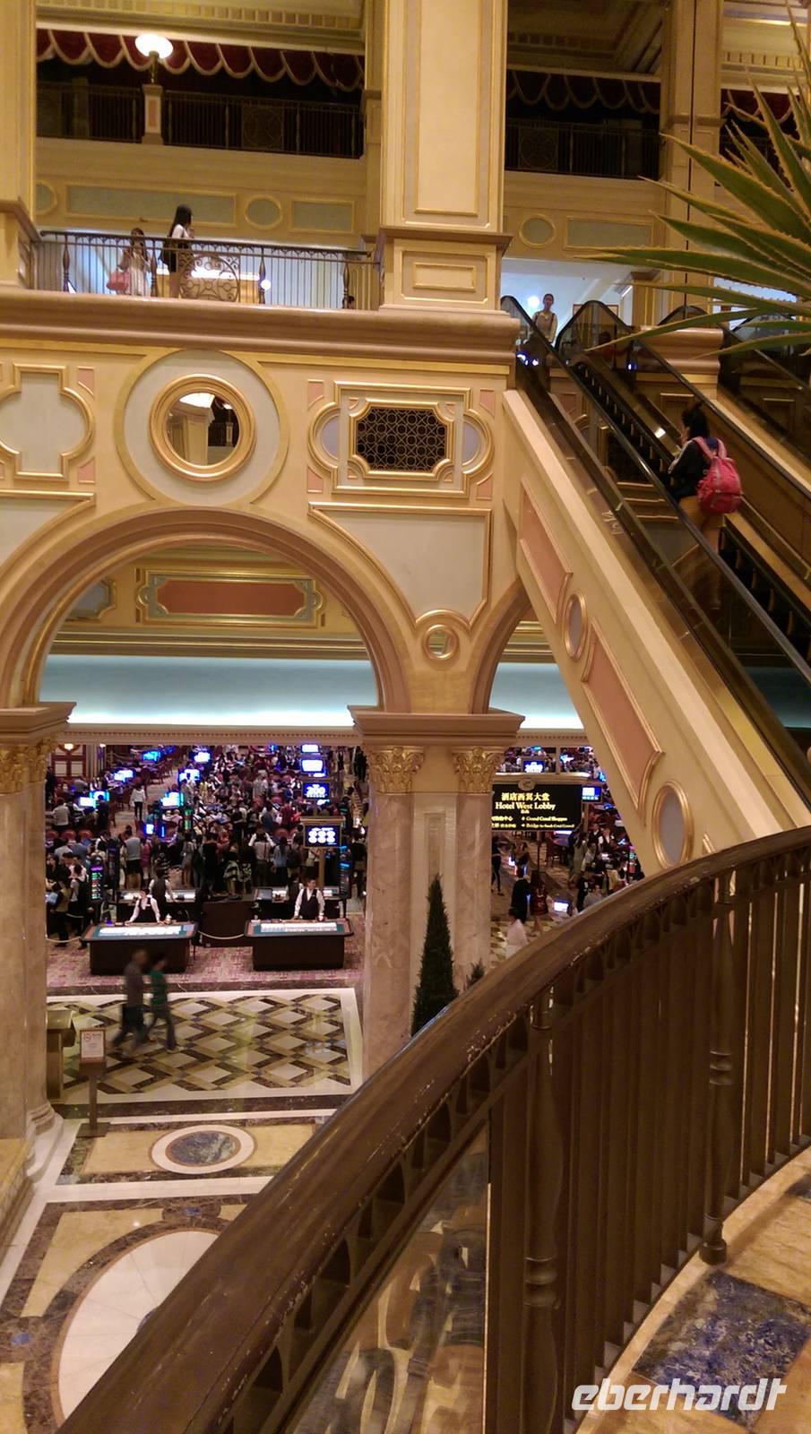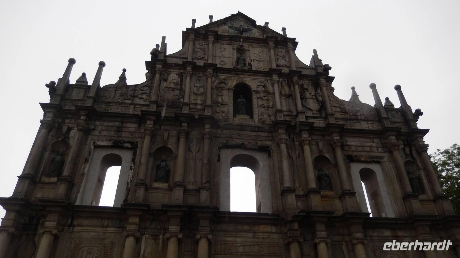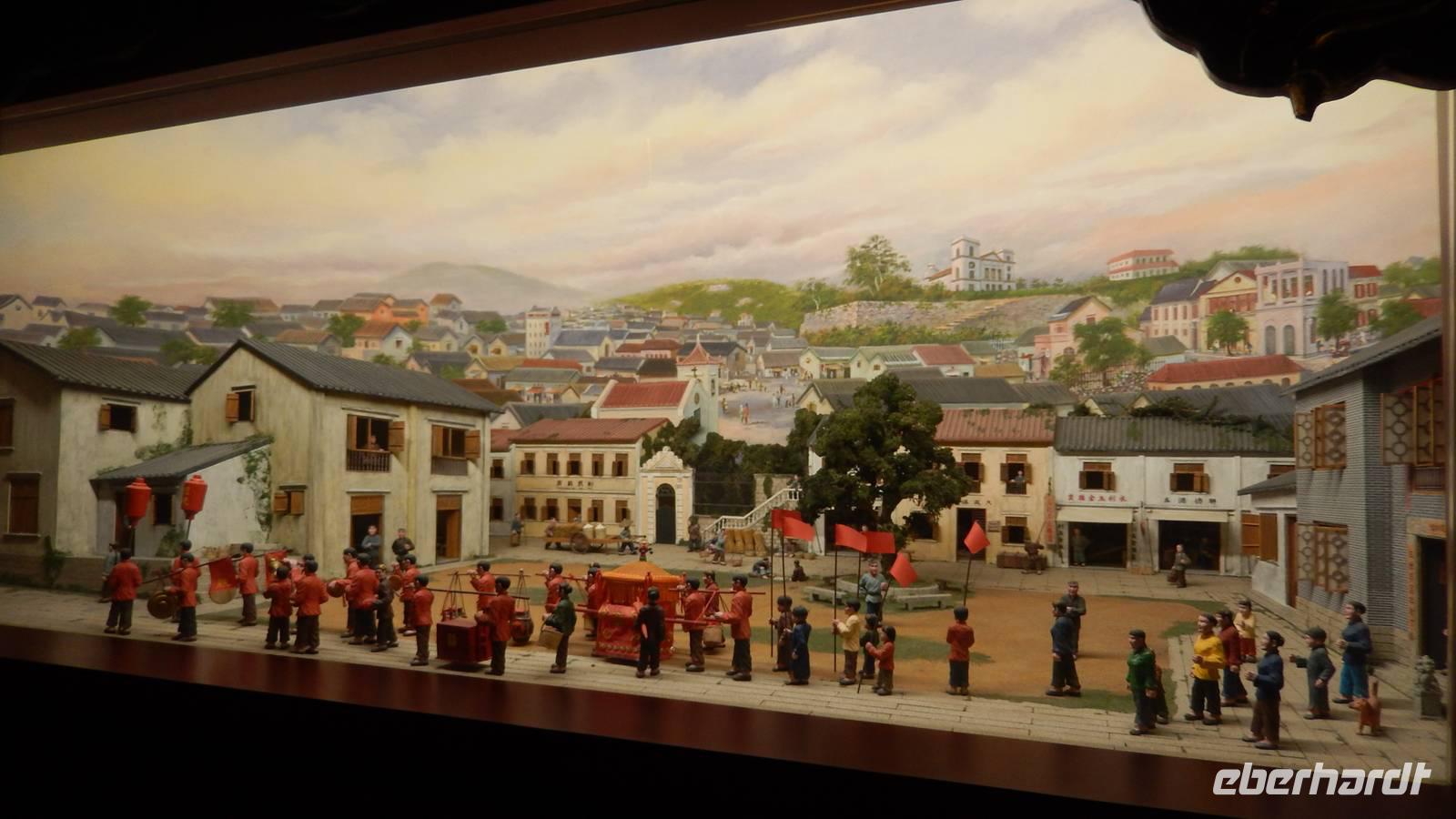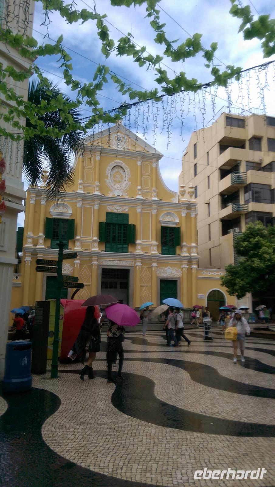 Gemeinsam mit Herr Chen fuhren wir heute zur Grenze nach Makau und verabschiedeten uns dort von ihm und auch vom Sozialismus, denn nun betraten wir ein autonomes Gebiet mit eigener Regierung und natürlich Kapitalismus. Reiseleiter Peter holte uns hinter der Grenze ab und wir begannen gleich mit unserem weiteren Programm. Zuerst besuchten wir das Stadtmuseum und lernten dort kurz und bündig viel über die Geschichte des Stadtstaats und die portugiesischen Einflüsse aus der Kolonialzeit. Vom Aussichtspunkt draußen hatten wir anschließend einen umfassenden Blick über die Stadt und gingen weiter zum Senatsplatz. Nach einer abenteuerlichen Geldtauschaktion im strömenden Regen stimmten wir uns darüber ab, das Programm voerst zu verkürzen, da es immer stärker regnete. Wir warfen einen kurzen Blick in die dominikanische Kirche und traten dann den Weg zum Hotel an. Dass nun plötzlich die Sonne strahlte, brachte uns leider wenig, da wir bereits alle durchnässt waren. Nach der Ruhepause im Hotel fuhren wir noch einmal hinaus und besuchten den Hotelkomplex „The Venetian". Im Inneren konnten wir durch das riesige Casino schlendern und anschließend den prunkvollen Einkaufskomplex bewundern. Wie in Las Vegas wurde hier eine komplette Etage in eine venetianische Landschaft verwandelt, stilecht mit Fluss, Gondeln und real anmutendem Himmel. Bei Abendessen erhielten wir schließlich viele portugiesische Spezialitäten, ganz anders als unsere bisherigen Mahlzeiten.