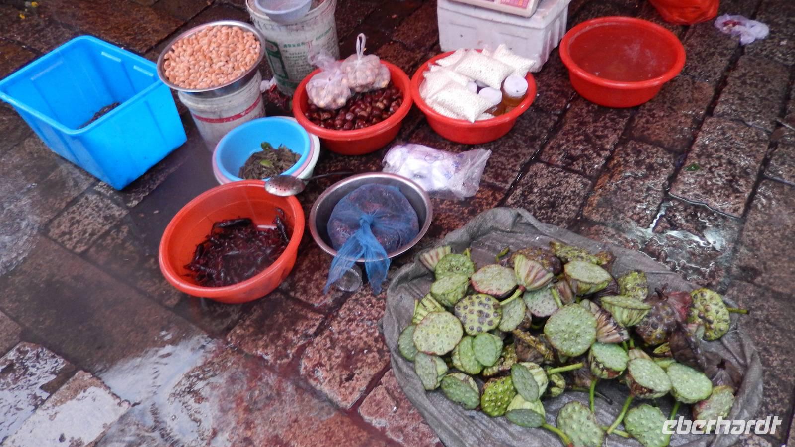 Wieder sollten wir heute China von Bord eines Schiffes aus erleben, nämlich bei einer mehrstündigen Fahrt auf dem Li-Fluss. Vom Wasser aus konnten wir besonders gut die imposanten Karstberge sehen, die ringsum den Horizont bedecken. Auch große, wild wachsende Bambuswälder und schwimmende Wasserbüffel konnten wir unterwegs beobachten. Nach dem Mittag legten wir schließlich in Yangshou an, wo wir tapfer durch den Taifun-Regen die große Ladenstraße besuchten. Wer wollte, konnte schon eher in der Lobby des Hotels warten, in dem wir uns später alle treffen wollten, oder ein wenig Bummeln gehen. Auch der Bus hatte durch das Wetter und den Feiertagsverkehr heute Probleme, durchzukommen, erreichte uns aber schließlich doch und brachte uns zurück in unser Hotel in Guilin.