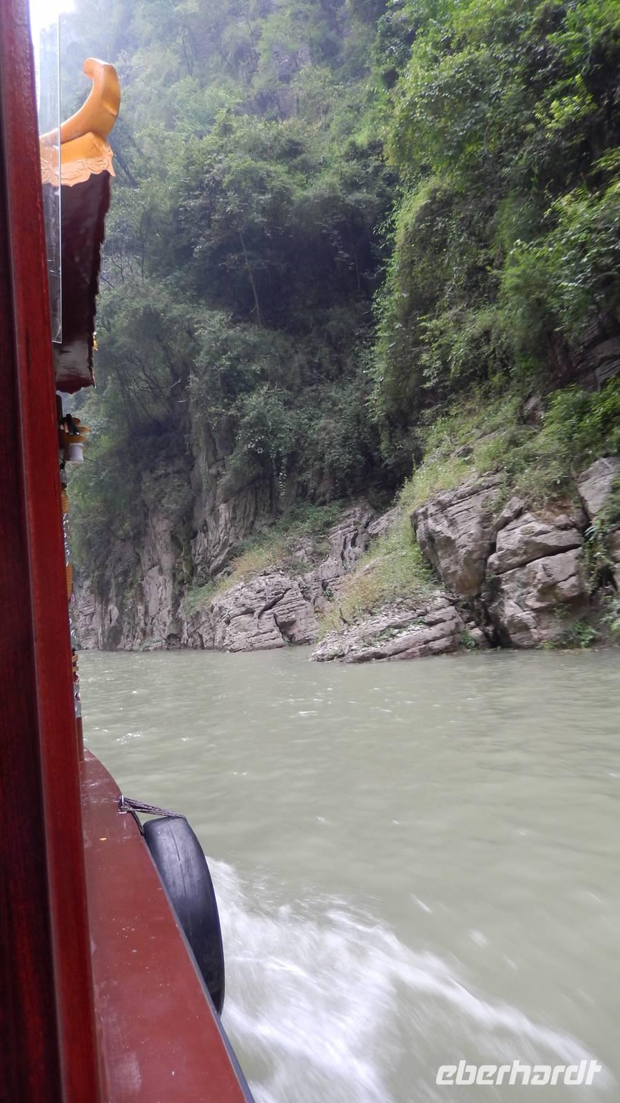 Weiter ging heute unsere Yangtze-Kreuzfahrt und wir erreichten endlich die drei berühmten Schluchten. Zuerst durchquerten wir heute die Qutang-Schlucht, die sich auch auf den chinesischen Geldscheinen findet, danach die Wu-Schlucht. Nach dem Mittagessen gingen wir gemeinsam von Bord und machten eine Fahrt in einem kleineren Boot durch zahlreiche nahegelgene Schluchten, die mit dem großen Schiff nicht befahrbar sind. Hier konnten wir besonders gut die steilen Felsen und die Pflanzen in Ufernähe betrachten. Nach einem Stopp auf einer schwimmenden Plastik-Insel und einer eher unfreiwillig komischen musikalischen Einlage durch die Boot-Guides fuhren wir die gleiche Strecke wieder zurück zum Hafen und gingen zurück an Bord. Heute bekamen wir ein köstliches Abschieds-Abendessen, denn morgen stand bereits die Ausschiffung an. Zuvor sollten wir aber noch in der Nacht den gewaltigen 3-Schluchten-Staudamm passieren, der über 5 gewaltige Schiffsschleusen verfügt. Entweder vom Aussichtsdeck oder direkt vom eigenen Balkon aus konnte jeder das Spektakel bestaunen.