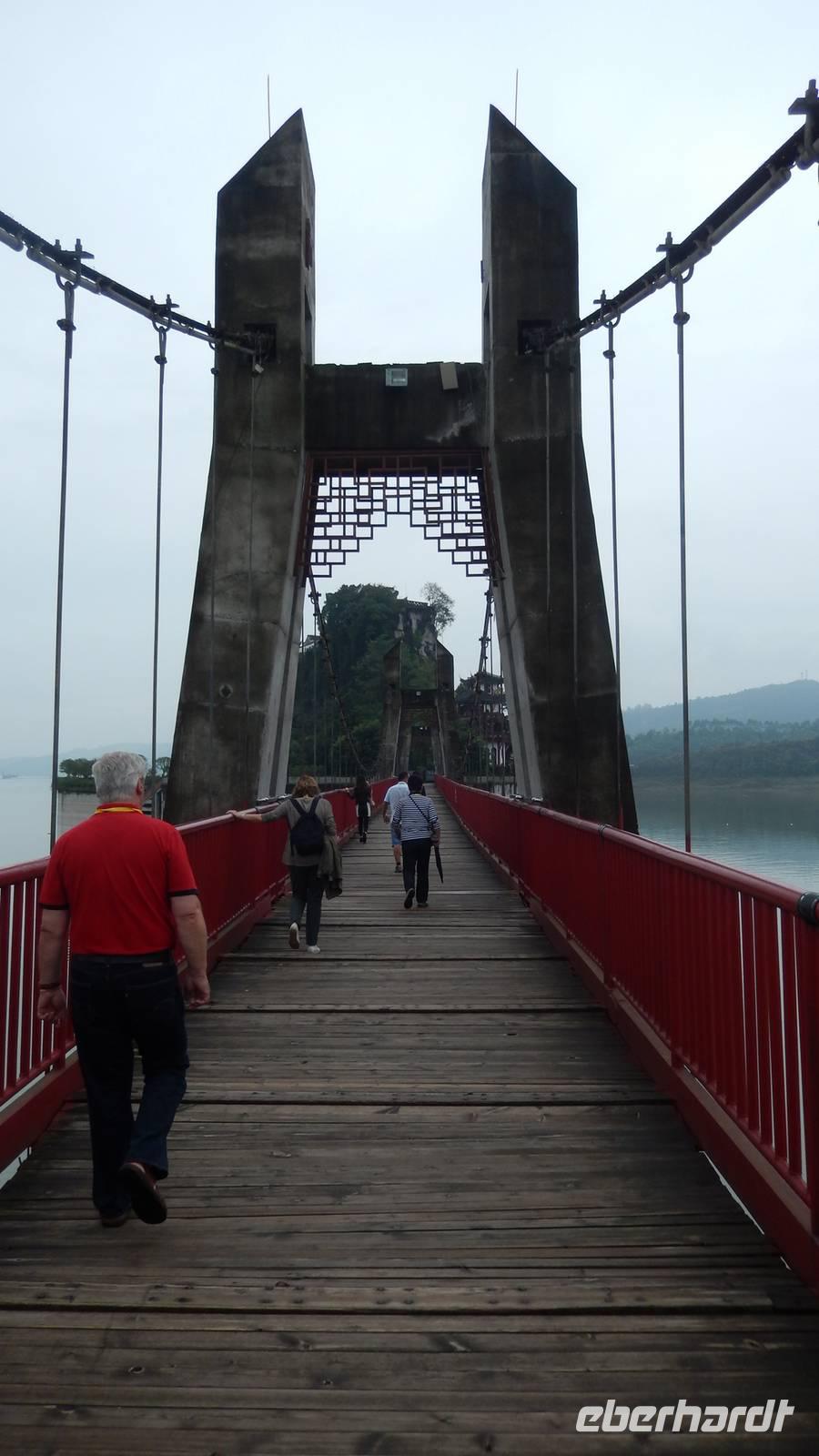 An Bord unseres Schiffes hatten wir heute erst einmal Zeit, uns etwas an Bord zu entspannen und uns einen Vortrag über den Yangtze-Fluss anzuschauen. Nach dem Mittagessen unternahmen wir einen Ausflug zur Shibaozhai-Pagode und erklommen die verwinkelten Holztreppen bis nach oben, allerdings erst nachdem wir die schaukelnde Hängebrücke überquert hatten. Anschließend besuchten wir mit Michael das nahegelegene Dorf, welches eher die Ausmaße einer deutschen Kleinstadt hatte, jedoch hier mit einigen tausend Einwohnern eher ein winziger Ort war. Wir wurden von den Einheimischen begrüßt und nahmen zum Andenken noch etwas Hirseschnaps für die nächsten Tage mit. Zurück an Bord konnten wir noch etwas die umliegende Landschaft von unseren Kabinen-Balkonen genießen. Vor dem Abendessen gab es einen Kapitänsempfang und schließlich unser erstes richtiges Abendessen im Schiffsrestaurant. Anschließend stießen wir mit unserem Hirseschnaps an und schauten uns die Kostüm-Show auf dem Bar-Deck an, in der die Crew traditionelle Kleidung und Tänze vorführte.