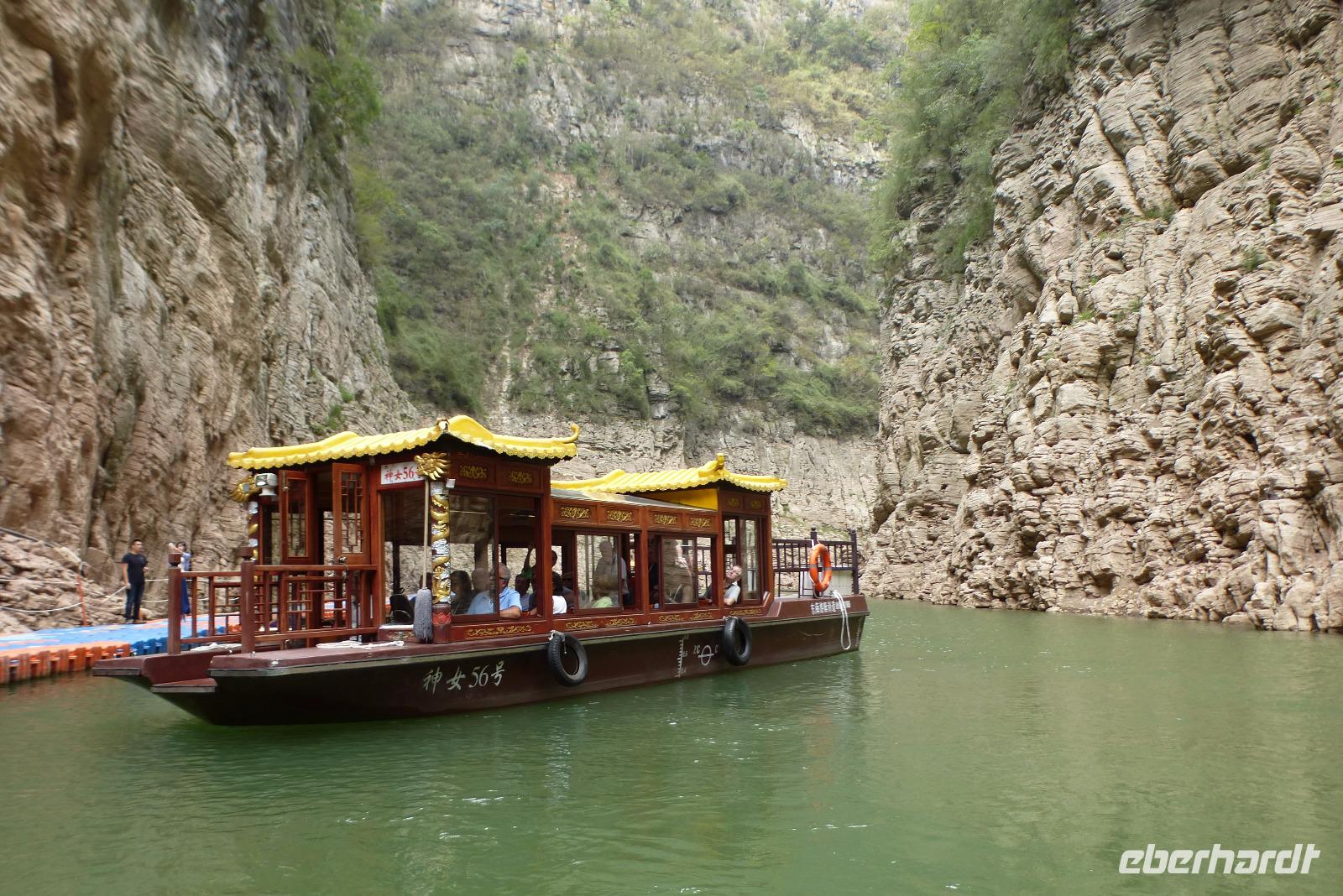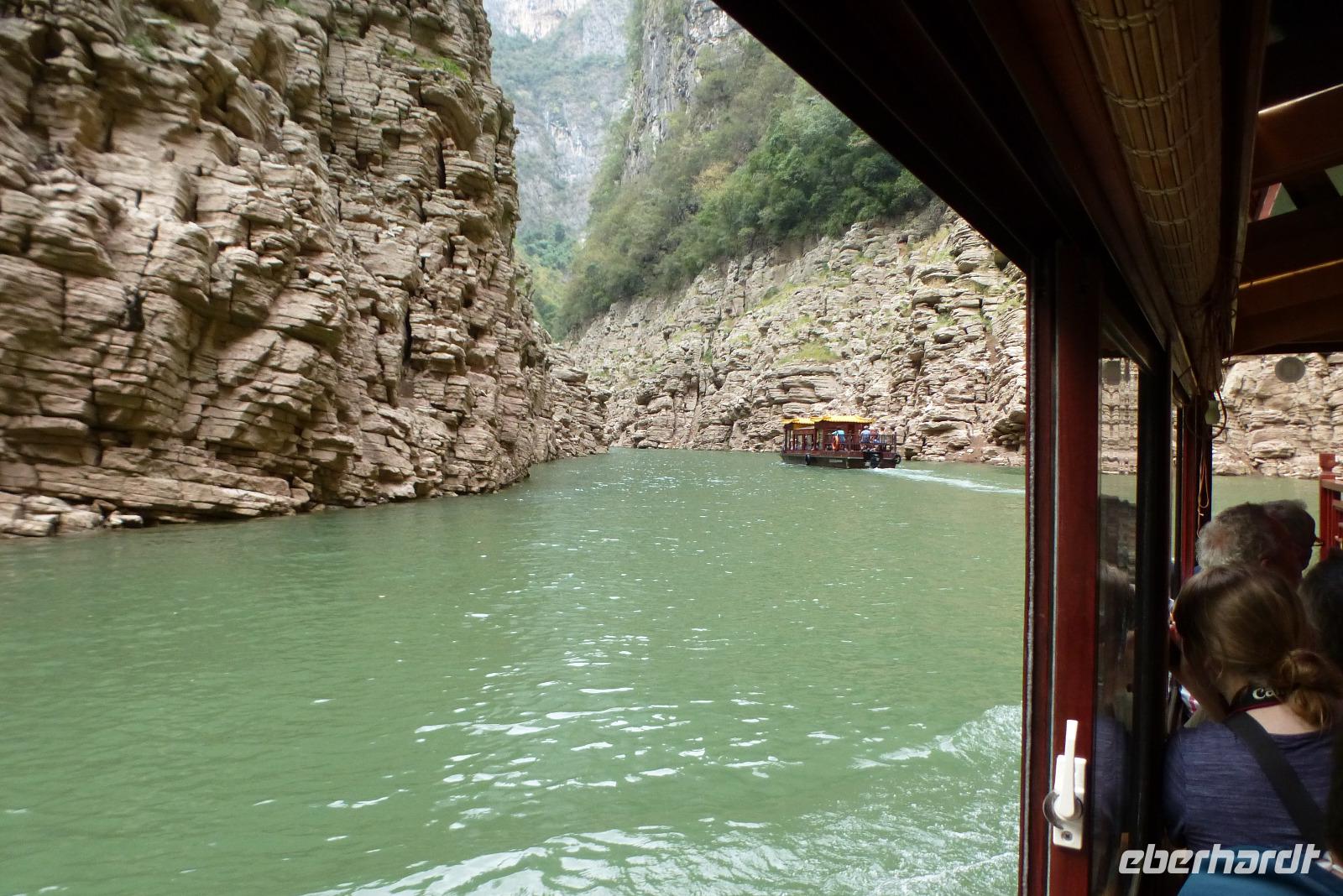 Am Nachmittag fuhren wir mit kleinen Booten in einen Seitenfluss des Jangtse, vorbei am Gipfel der Göttin, hinein in eine zauberhafte Landschaft. Rechts und links von uns ragten gewaltige Felsen senkrecht in den Himmel. Über einen schwimmenden Weg aus Plastik, der mit Sicherheit durch keine deutsche TÜV Prüfung käme, schwankten wir tief hinein in die Schlucht, wo Farne und Moose von den Felsen hingen. Die chinesische Begleiterin der kleinen Schiffchen erzählte uns vom Leben in den Tälern, bevor der Jangtse gestaut wurde. Die Menschen lebten von Süßkartoffel- und Maisanbau, hatten ein paar Ziegen und führten ein einfaches aber gesundes Leben. Fünf Millionen Menschen mussten für dieses ehrgeizige Bauprojekt des Staudammes ihre angestammte Heimat verlassen. Dafür haben heute selbst die hochgelegenen Bauernhöfe Elektrizität; frisches Wasser jedoch ist nach wie vor ein Problem. Viele leben heute auch schon vom Tourismus. Eine kleine Darbietung traditioneller Flötensmusik mit Gesang und ein Tanz, der in einer Art Polonaise für alle endete, machte einen eher hilflosen Eindruck, den Touristen die Kultur der Bergvölker näher zu bringen. Wieder zurück auf unserem Schiff ging die Reise weiter Richtung Drei Schluchten Damm, den wir mitten in der Nacht passieren werden.