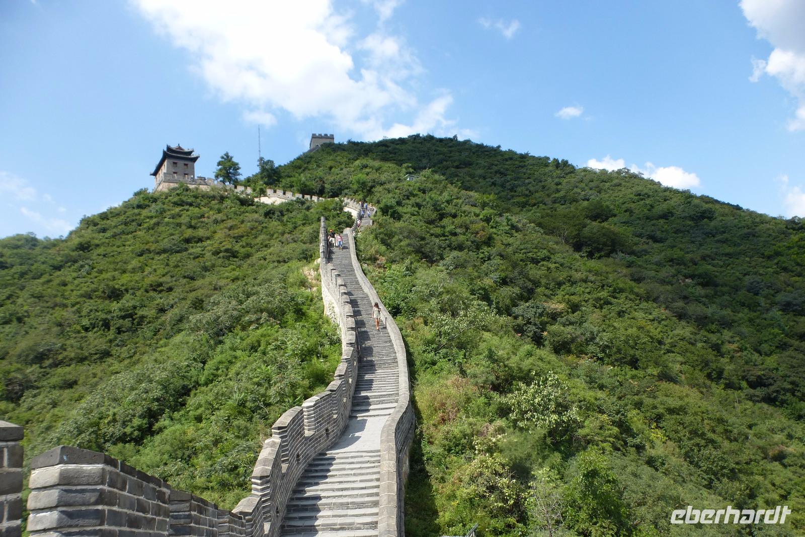 Schon zum Frühstück überraschte uns Peking mit herrlichem Wetter und blauem Himmel!! Nachdem wir uns am köstlichen Buffet gestärkt hatten, ging es mit dem Bus quer durch Peking, hinaus in die Berge zur großen Chinesischen Mauer. Die Landschaft ist überwältigend! Die Mauer schlängelt sich über die Höhen und überrascht uns mit unregelmäßigen Treppenstufen mit bis zu 40 Zentimeter Höhe. Eine sportliche Herausforderung war es, den zehnten Wachturm zu erreichen. Natürlich gibt es auch schon gleich nach dem Eingang die Möglichkeit, bei einem kleinen Imbiss, die gewaltige Anlage vom Fuße der Treppen aus durch das Teleobjektiv zu betrachten!
