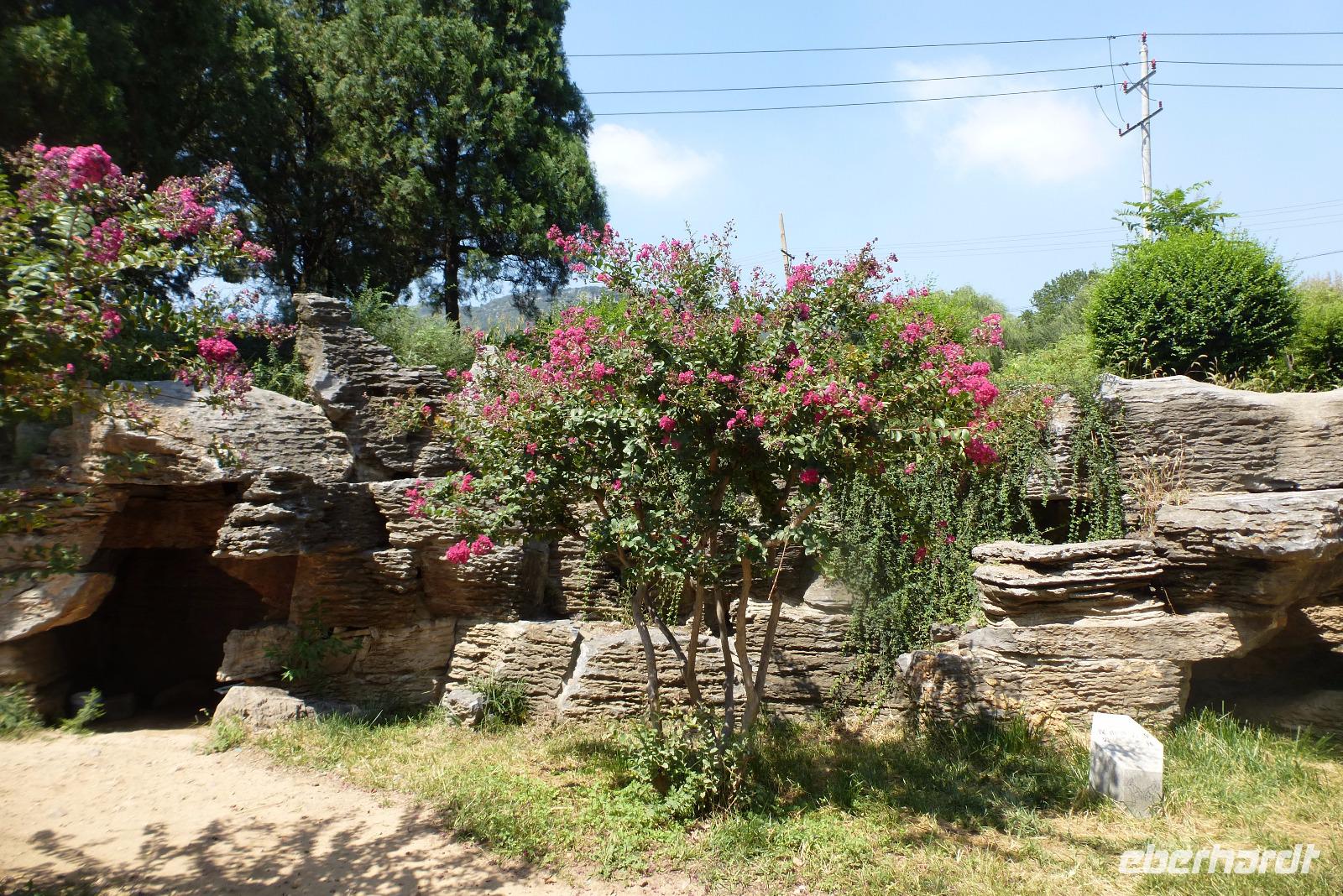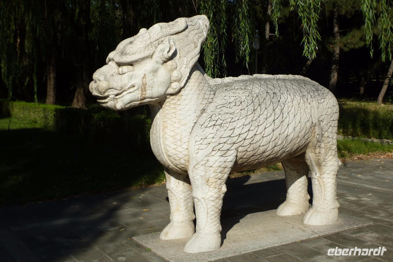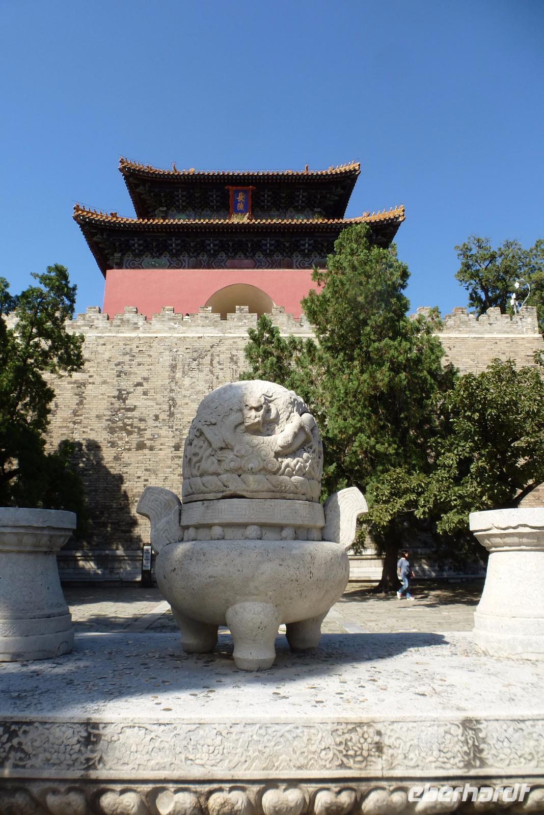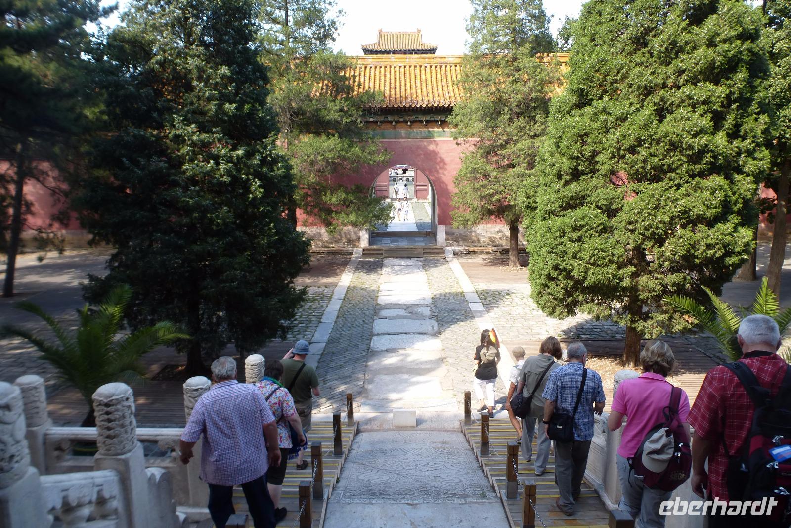 Unser nächstes Ziel, die Grabanlage der Ming Kaiser, verblüffte uns alle durch ihre herrliche Lage: eingebettet in die Berge, in einer fruchtbaren Ebene gelegen, wo saftige Pfirsiche, gelbe Birnen, Datteln und Pflaumen angebaut und angeboten werden. Versorgt mit einer köstlichen Birne ging es dann zum nächsten Ziel, der berühmten Geisterallee mit ihren tierischen und menschlichen Wächtern. Unser Spaziergang wurde begleitet von einem herrlichen Konzert der Zikaden.