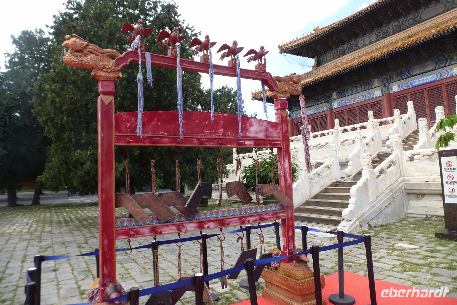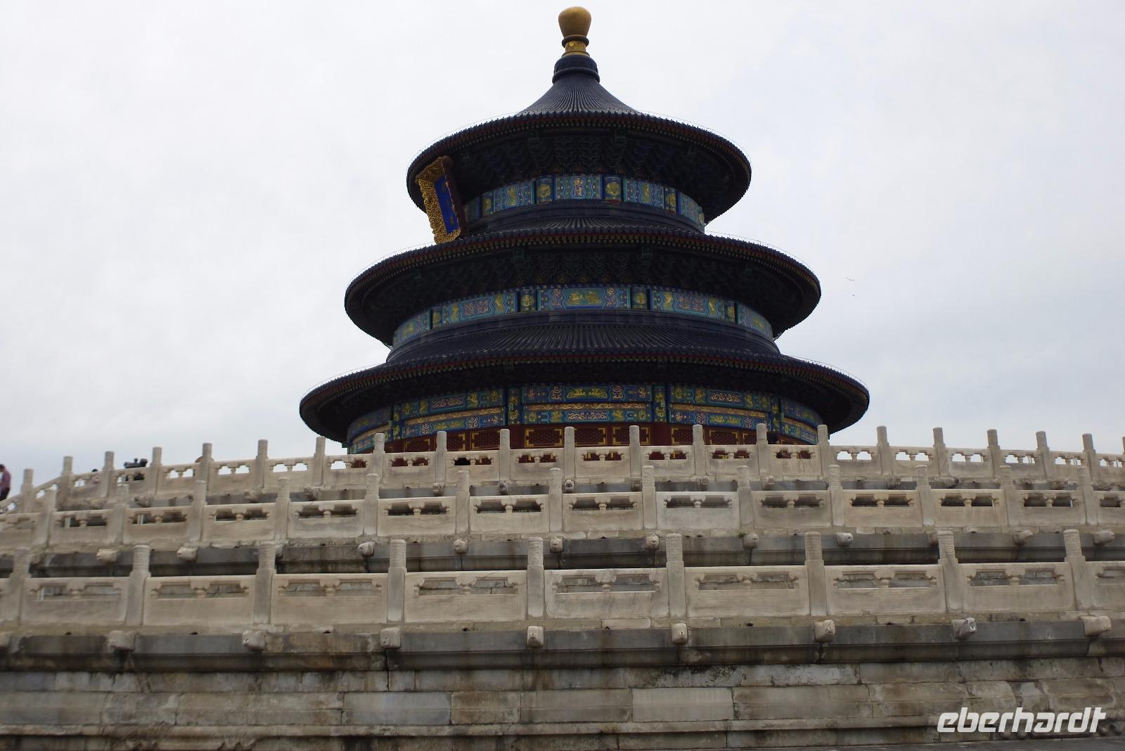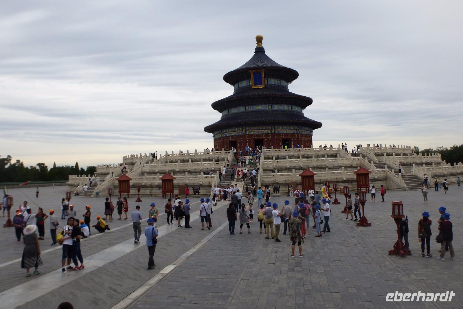 Weiter ging es dann zum Himmelstempel, der weit im Süden der Stadt liegt. Wie der Kaiserpalast ist auch diese Anlage 1421 gebaut worden. Im zentralen Bau, der Halle des Ernteopfers, überraschten die perfekten Proportionen zwischen den drei Terrassen, der Rundhalle und dem dreistufigen Dach aus blauen glasierten Ziegeln. Erst dahinter ist in einer kleinen Rundhalle, die das Himmelsgewölbe genannt wird, der eigentliche Altar. Die Zahl 9 spielt in der Zahlensymbolik der Chinesen eine große Rolle. Die oberste Plattform hat einen Durchmesser von neun zhang, das entspricht ungefähr 27 Metern. Die innere runde Platte wird von neuen Platten geben und mit jedem Ring werden es neun Platten mehr bis es dann außen 9 × 9 Platten sind. Die runde Form des Altars steht symbolisch für den Himmel, mit dem der Kaiser hier in Verbindung getreten ist.