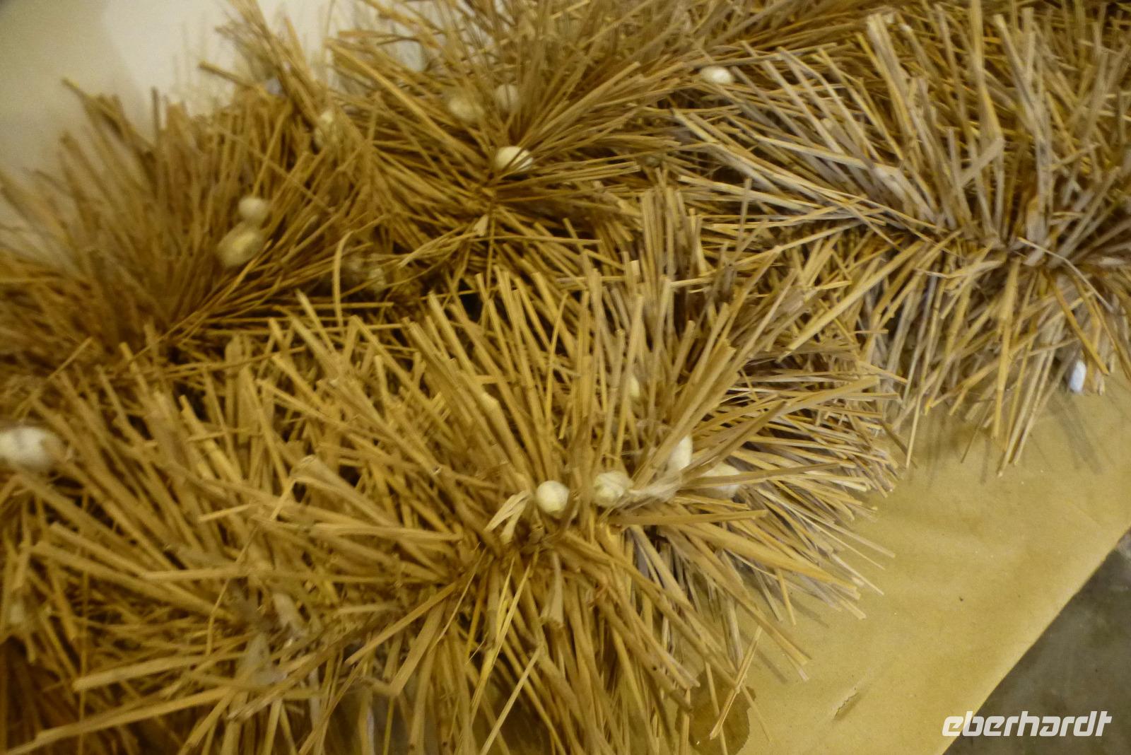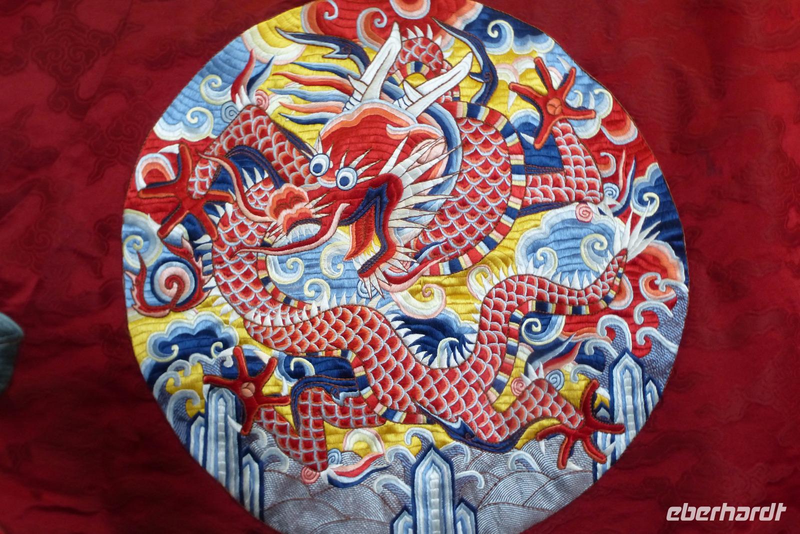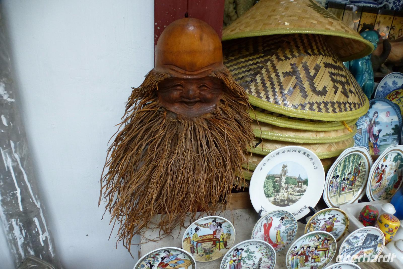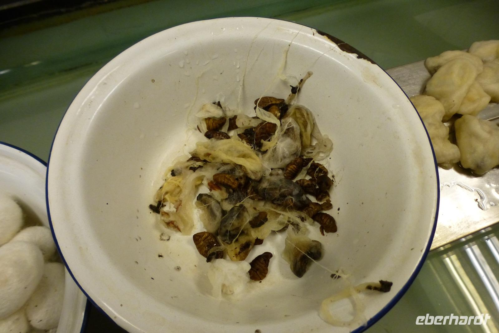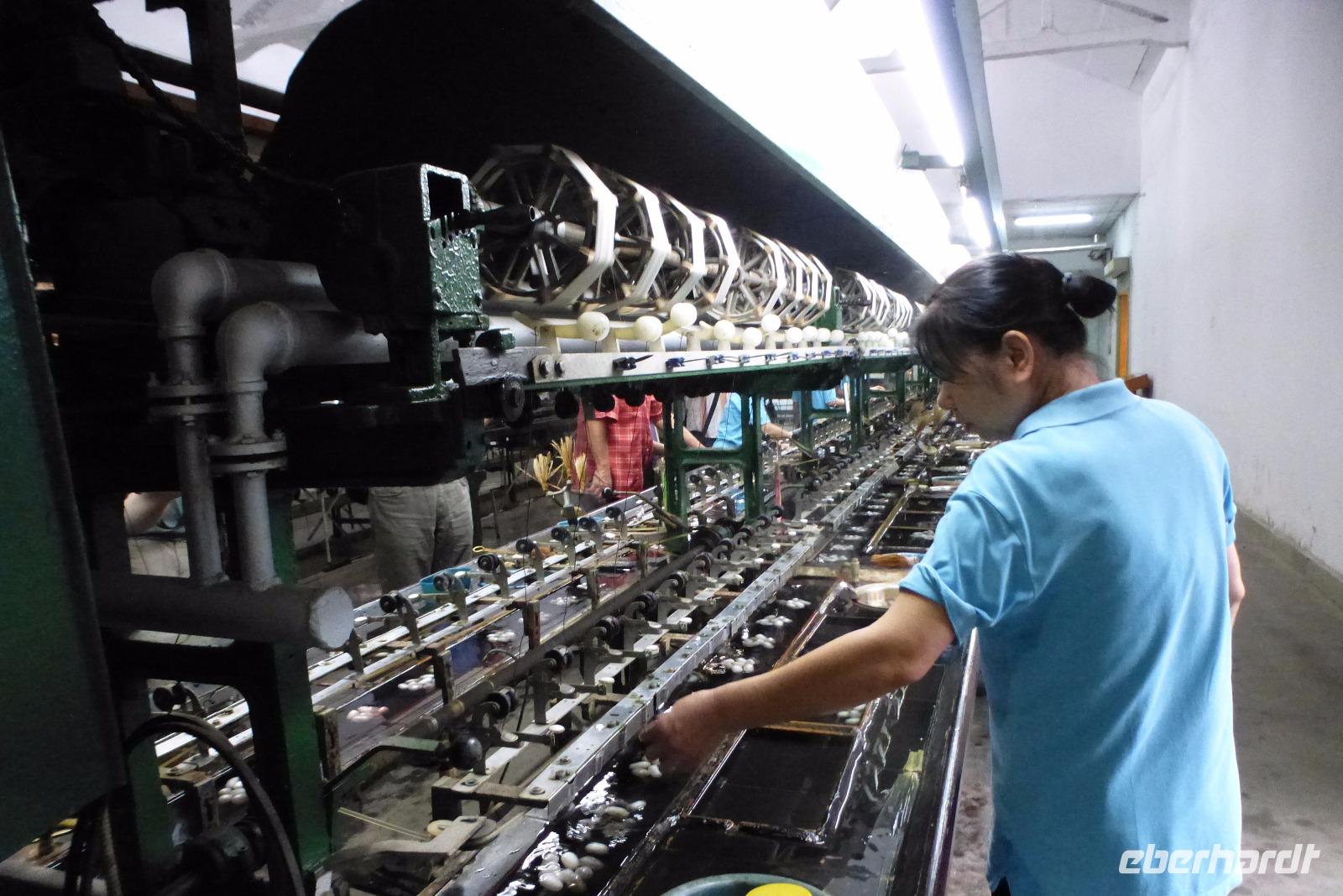 Und schon ging es wieder weiter: der Besuch in der Seidenspinnerei Suzhou 1 stand auf dem Programm. Wir bewunderten Maulbeersträucher und erfuhren einiges über das Leben einer Seidenraupe. Zu Hunderten lagen sie auf großen Matten mit Maulbeerblättern, bereit sich in ihrem Kokon mit einem 1000 Meter langen Faden zu verpuppen. Im Museum bestaunten wir die alten Webstühle und konnten in der Fabrik den Arbeiterinnen bei der Verarbeitung der dünnen Seidenfäden an großen Maschinen über die Schulter schauen. Die Fabrik stellt hauptsächlich Bettdecken aus Seide her, die man, wie viele andere Produkte aus Seide auch, im angeschlossenen Verkaufsraum nicht nur bewundern, sondern auch kaufen konnte. Kaum einer aus unserer Gruppe konnte der Versuchung widerstehen, nicht doch einen Schal oder eine Krawatte direkt aus dem Ursprungsland zu erwerben.