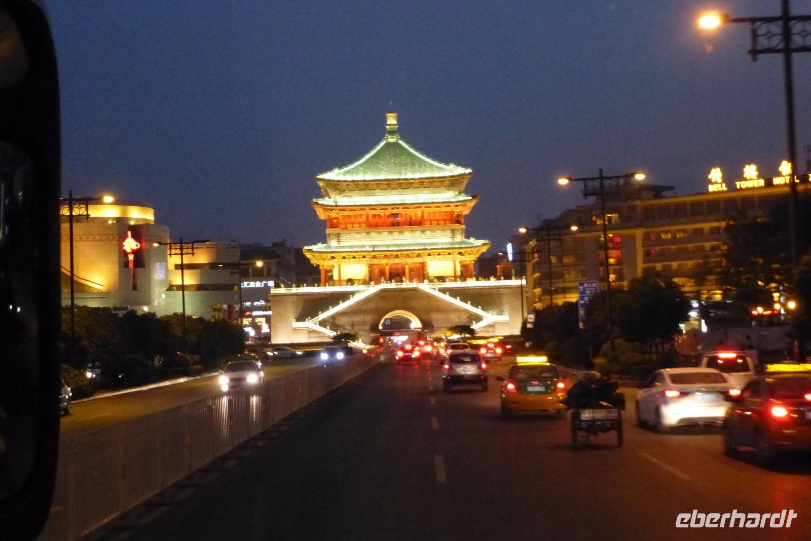 Nach guten zwei Stunden hatten wir unser Ziel erreicht und saßen wieder im Bus, der uns durch die Neon glänzende Stadt Xi´an zu einem tollen Restaurant in der Mitte der Altstadt brachte. Die ganze Stadt glänzte im nächtlichen Lichtermeer und wir wußten gar nicht mehr, wo wir hinschauen sollten. In den letzten zehn Jahren ist die Stadt zu einer internationalen Großstadt geworden, die nicht mit Superlativen geizt. Xi´an , das schon im frühen Mittelalter die größte Stadt der Welt war, hat heute ca. neun Millionen Einwohner. Besonders beeindruckend ist die fast vierzehn Meter lange und zwölf Meter hohe Stadtmauer sowie der 36 Meter hohe Glockenturm und der Trommelturm aus der Zeit der Ming Dynastie. Das alles glänzt in atemberaubender Beleuchtung. Für morgen haben wir uns einen Spaziergang über die Mauerkrone fest vorgenommen. Voller neuer Eindrücke kamen wir müde und rundum gesättigt in unser Hotel.