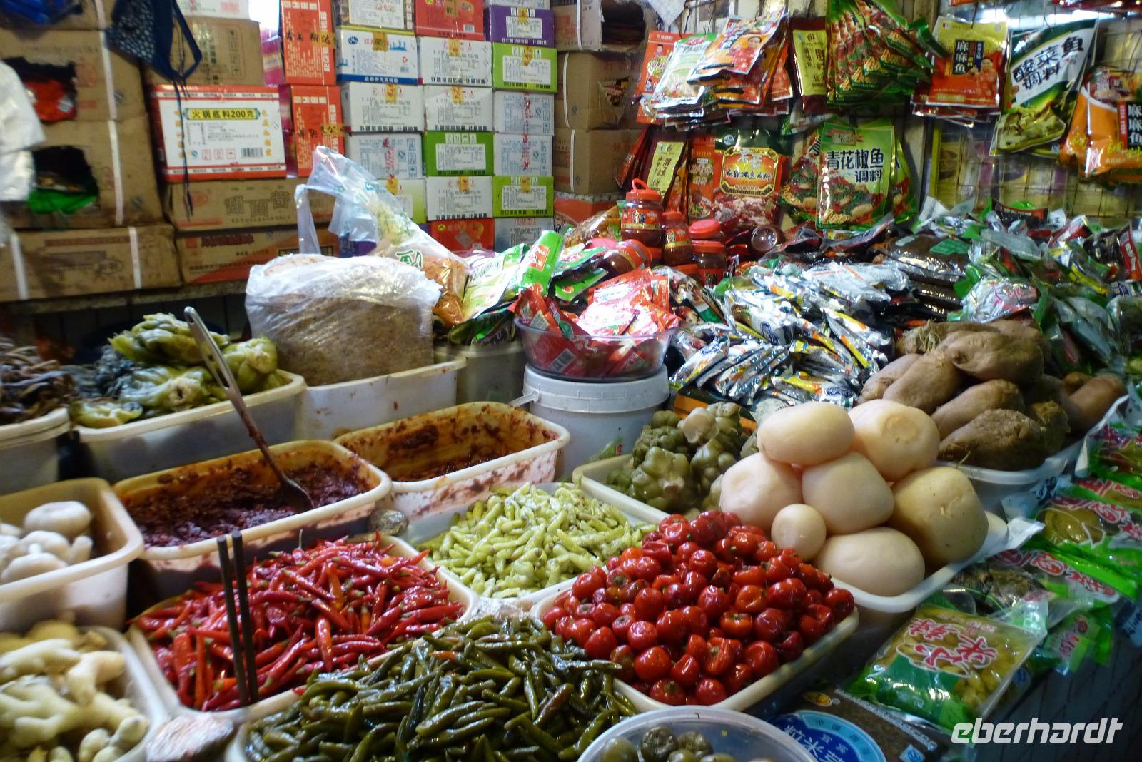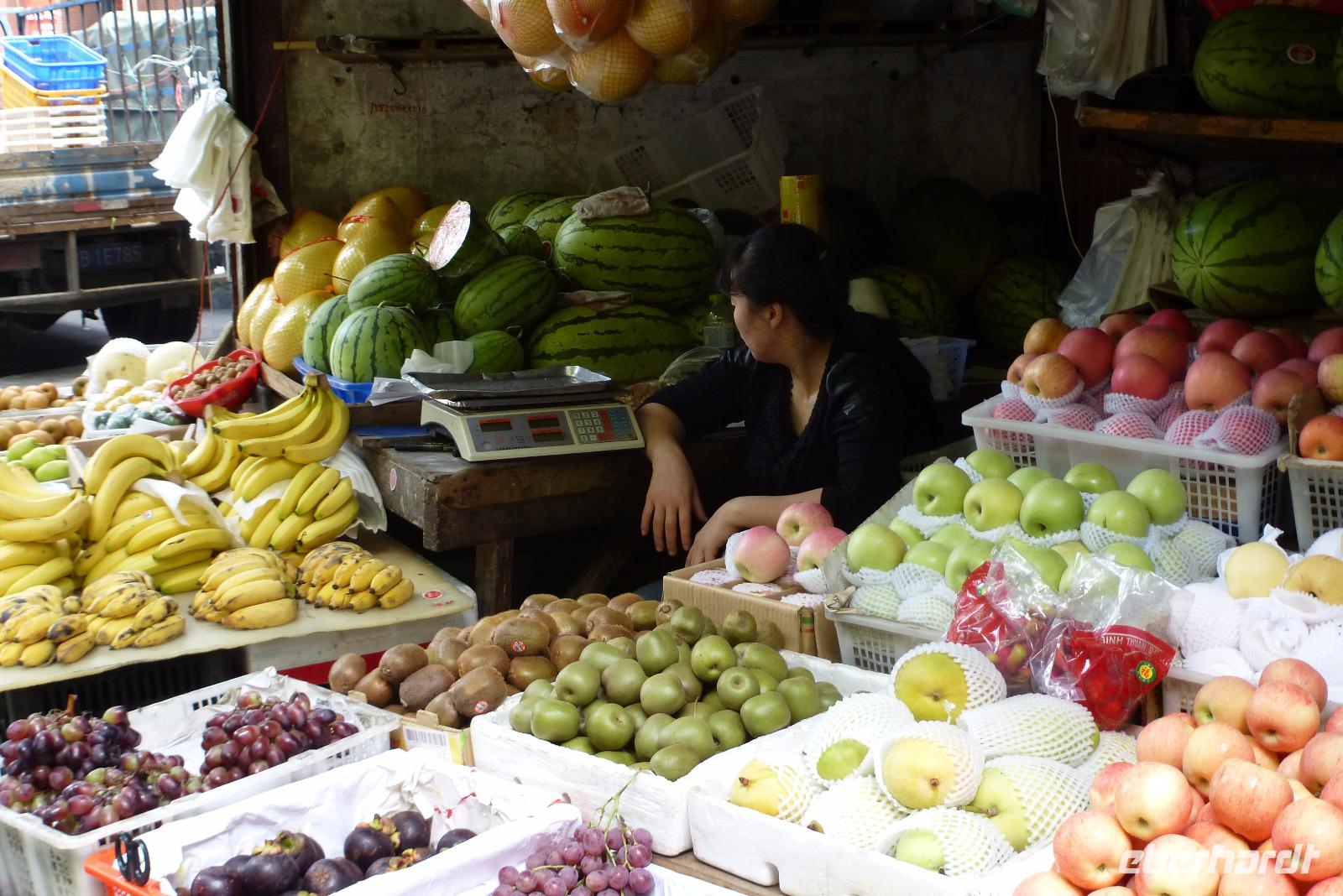 Schließlich sind wir in Yangzhou angekommen, wo wir einen schweißtreibenden Spaziergang durch eine Marktstraße mit vielfältigem Angebot und einen kleinen Gemüsemarkt mit tropischen Früchten gemacht haben.Litschi, Drachenfrucht, Mango, Granatäpfel und die zurecht so genannte Stinkefrucht, Liulien oder Duria, die viel besser schmecken soll, als sie riecht - wir blieben ihr aber den Beweis für ihren guten Geschmack schuldig.