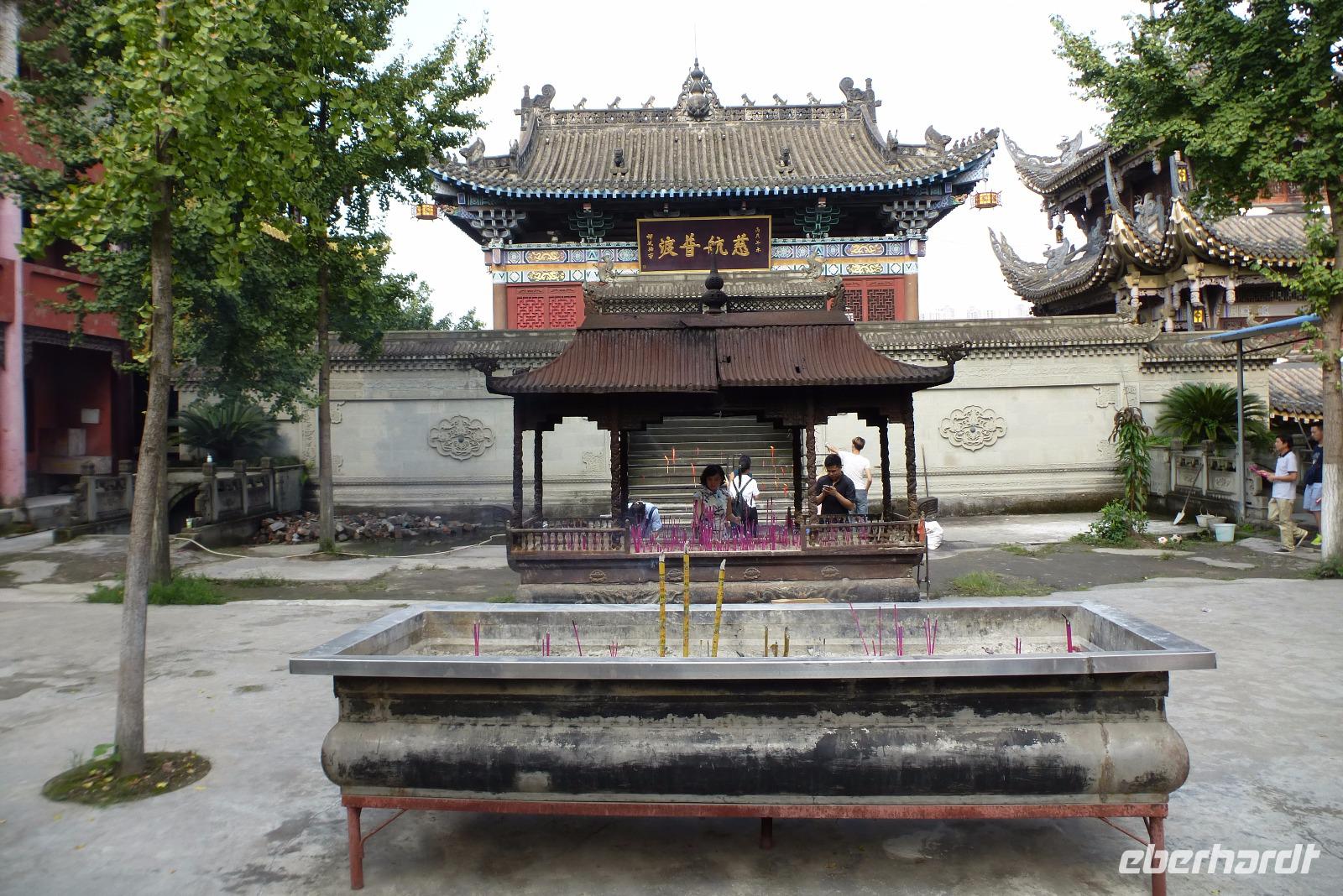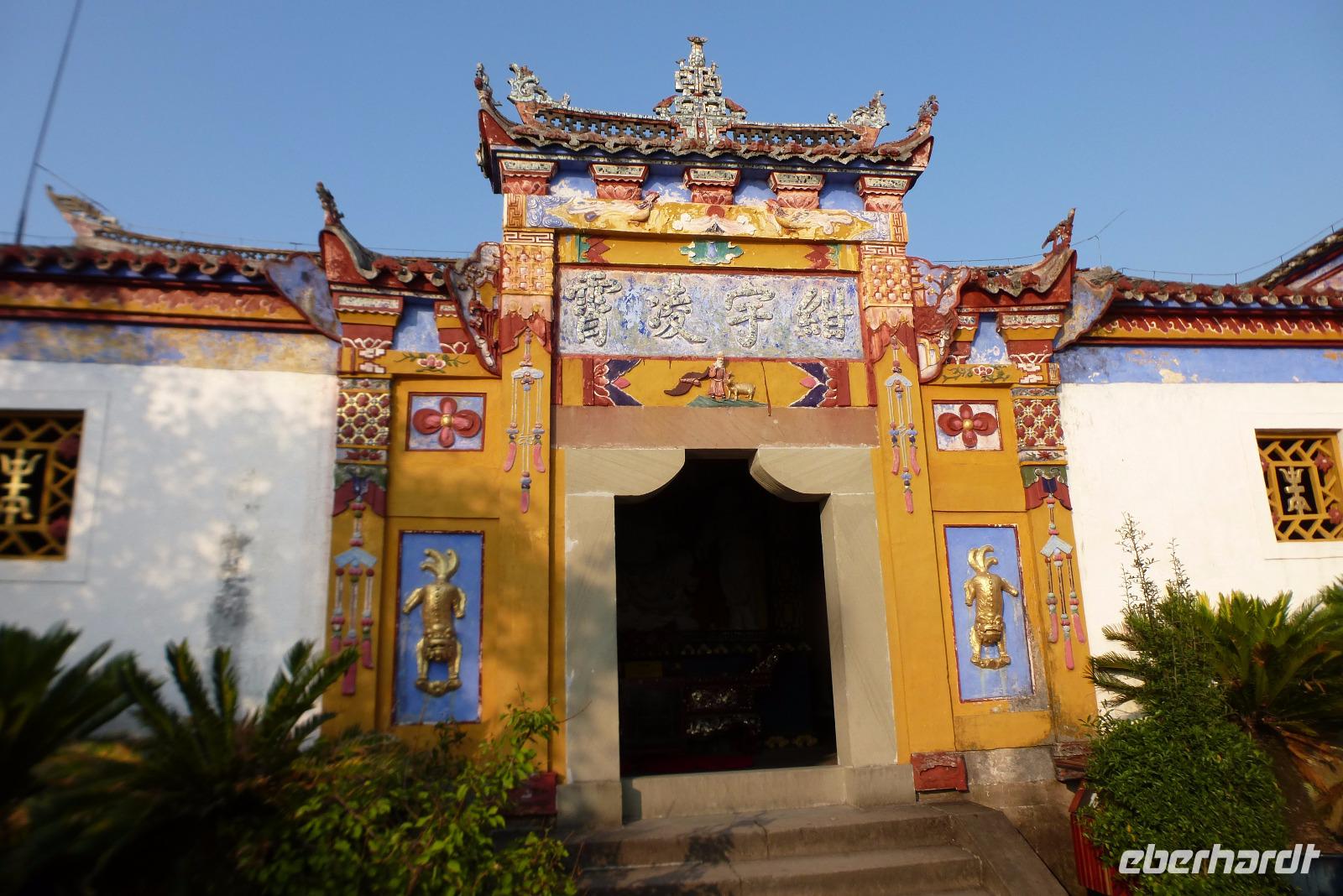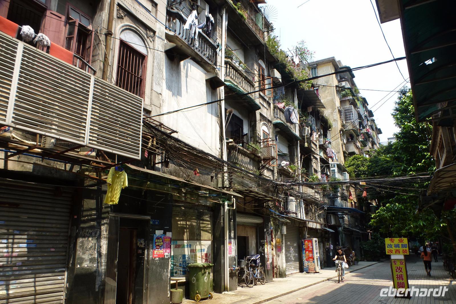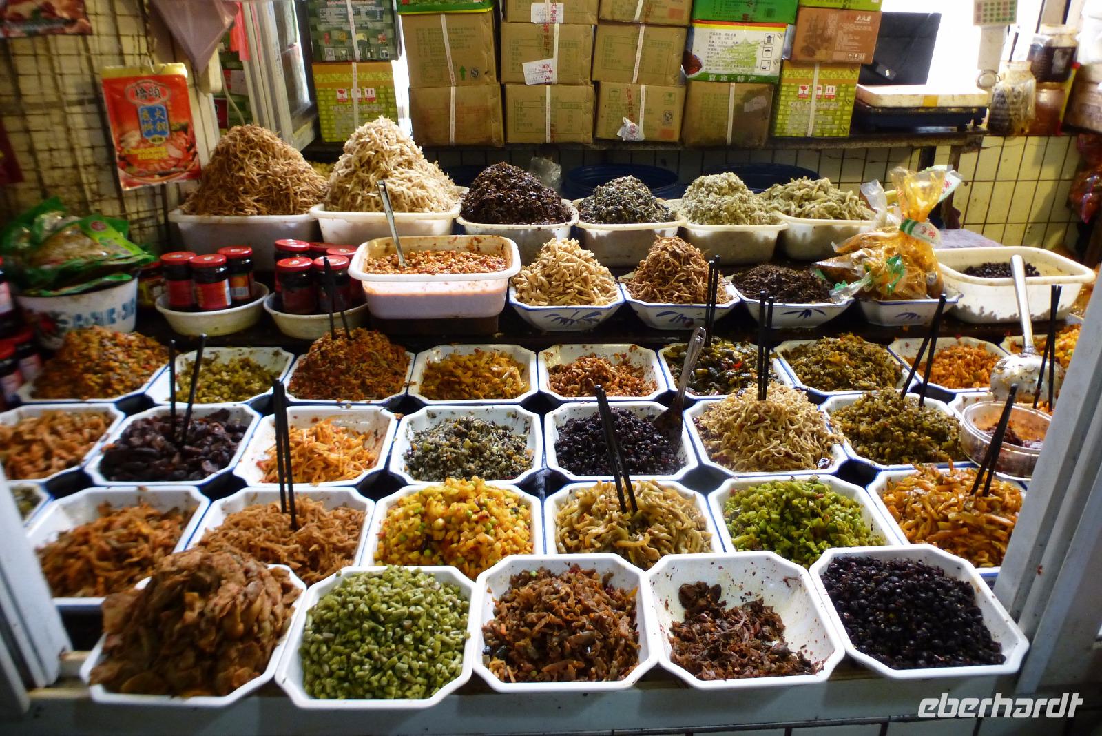 Das pittoreske Altstadtviertel von Chongqing ist ein Sprung in das alte China. Holzhäuser kleben wie Schwalbennester an den Felsen, enge Gassen, steile Treppen und dazwischen großzügige Tempelanlagen. In den Hauptstraßen ist ein Ladengeschäft am anderen mit Kunst, Ramsch, Schmuck aus Gold und Plastik, Kleidern und Nippes und dazwischen wieder eine unglaubliche Vielzahl kleiner Imbissbuden mit allerlei exotischen Gaumenfreuden. Hier drängten sich chinesische und ausländische Touristen dicht an dicht durch die Gassen.