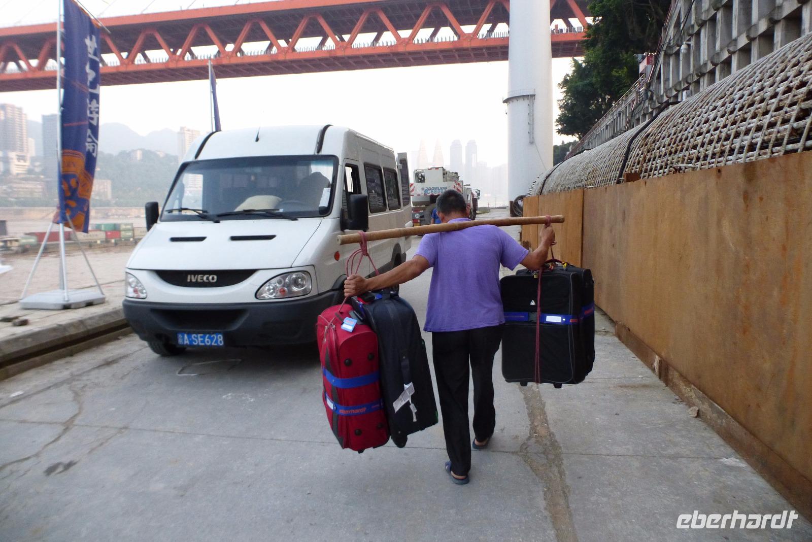 Unsere Koffer wurden von athletischen Kofferträgern, an dünnen Bambusstangen baumelnd, über schwankende Planken bis zum Schiff transportiert! Der Blick auf die hell erleuchtete Skyline von Chongqing begleitete uns in die Nacht!