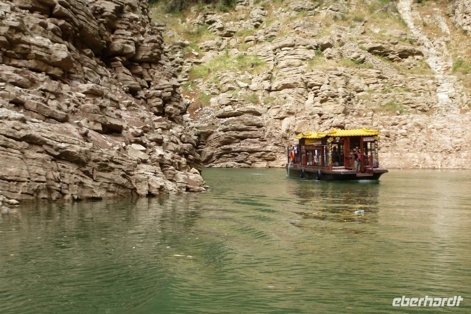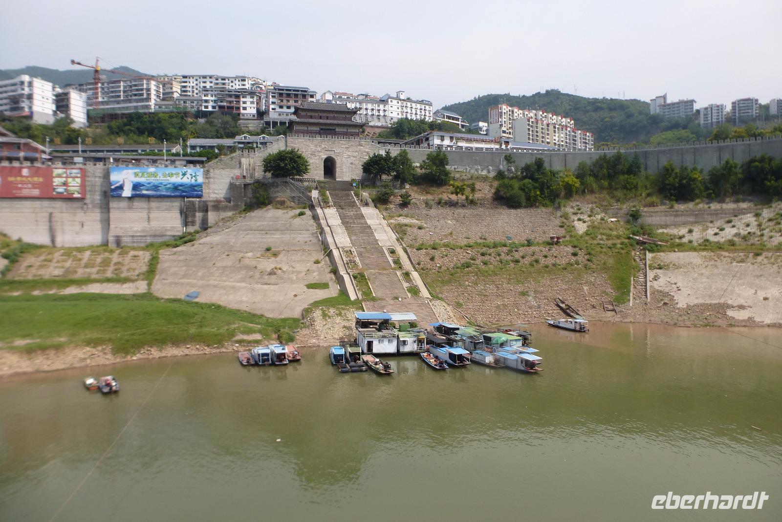 Um Mitternacht fuhren wir mit unserem Schiff in die gewaltige Schleusenanlage des Jangtse am Drei Schluchten Damm ein. Der ganze Vorgang dauerte fast drei Stunden! Am nächsten Morgen ankerten wir in Sandouping und starteten von dort mit dem Bus zu einem Ausflug, wieder zurück zum Drei Schluchten Damm, um uns dieses gewaltige Bauwerk von der Nähe aus anzusehen. Mit militärischer Organisation wurden wir durch die Anlage gefahren, die streng bewachter Sperrbezirk ist. Touristenbusse mit Sonderlizenz dürfen einen Teil der gewaltigen Anlage besuchen. Fotografieren ist nicht überall erlaubt. Wir hatten eine nette junge Gästebegleiterin, die uns charmant die schönen Seiten dieses sehr umstrittenen Bauwerks erklärte! Mit einer Länge von 2335 Metern und einer Höhe von 101 Metern ist dieser Staudamm der größte in der ganzen Welt. Noch immer wird hier gebaut, gerade letzten Monat, im August 2016, wurde ein neues Schiffshebewerk eingeweiht. Das gewaltige Staudamm- und Schleusenprojekt hat die ganze Landschaft gut 600 Kilometer flussaufwärts verändert und viele Schätze des Landes unter den Fluten begraben. Wieder zurück am Schiff ging es noch durch die dritte der drei Schluchten, die Xiling Schlucht, mit herrlichen Aussichten auf alte Dörfer mit pittoresken Holzhäusern und galerieartigen hölzernen Brückenwegen und auf schicke Neubauten, wie man sie auch an Schweizer Alpenseen finden könnte. Nach 660 Kilometern endete unsere Reise auf dem Jangtse in Yichang.