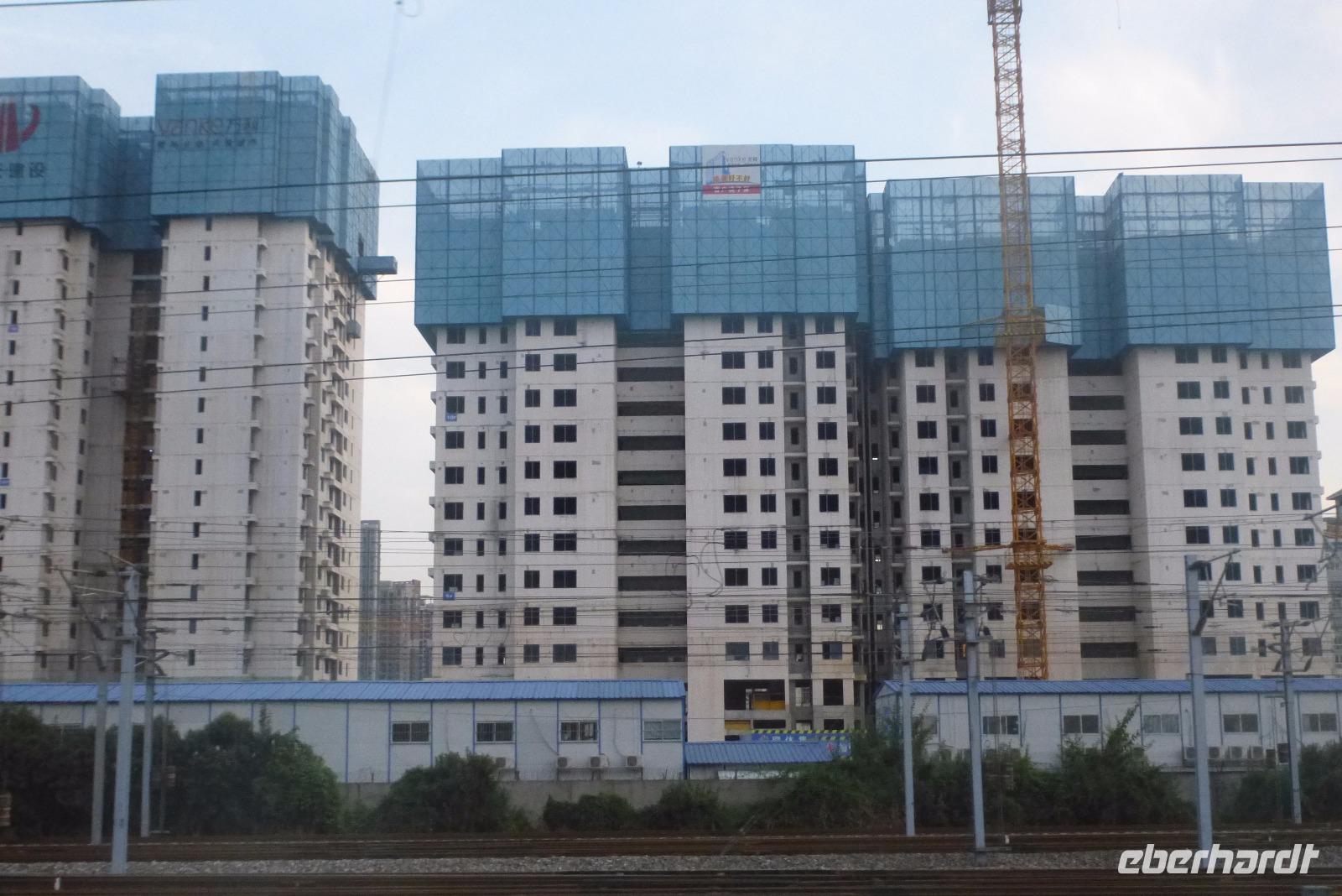 Von dort ging es mit 200 km/h unserem nächsten Ziel Nanjing entgegen. Draußen zogen Reisfelder, Gemüseäcker, Obstplantagen, Fischteiche, Lotusanpflanzungen und kleine Bauernhöfe mit Ziegen, Schweinen, Wasserbüffeln und Laufenten in bunter Folge an uns vorbei. Ein krasser Gegensatz dazu sind die ultramodernen einförmigen Wohnhochhausbauten, die riesigen Fabrikanlagen und Lagerhallen im Einzugsbereich der Städte. Für die gute Stimmung und für den Temperaturausgleich im gut klimatisierten Zug gab es einen Kräuterschnaps und einen kleinen Imbiss mit Erdnüssen, Bananen und chinesischem Gebäck. In Nanjing angekommen konnten wir uns von der gewaltigen Größe eines chinesischen Bahnhofs selbst überzeugen; eine Viertelstunde Fußweg bis zum Ausgang ist in China keine Seltenheit!