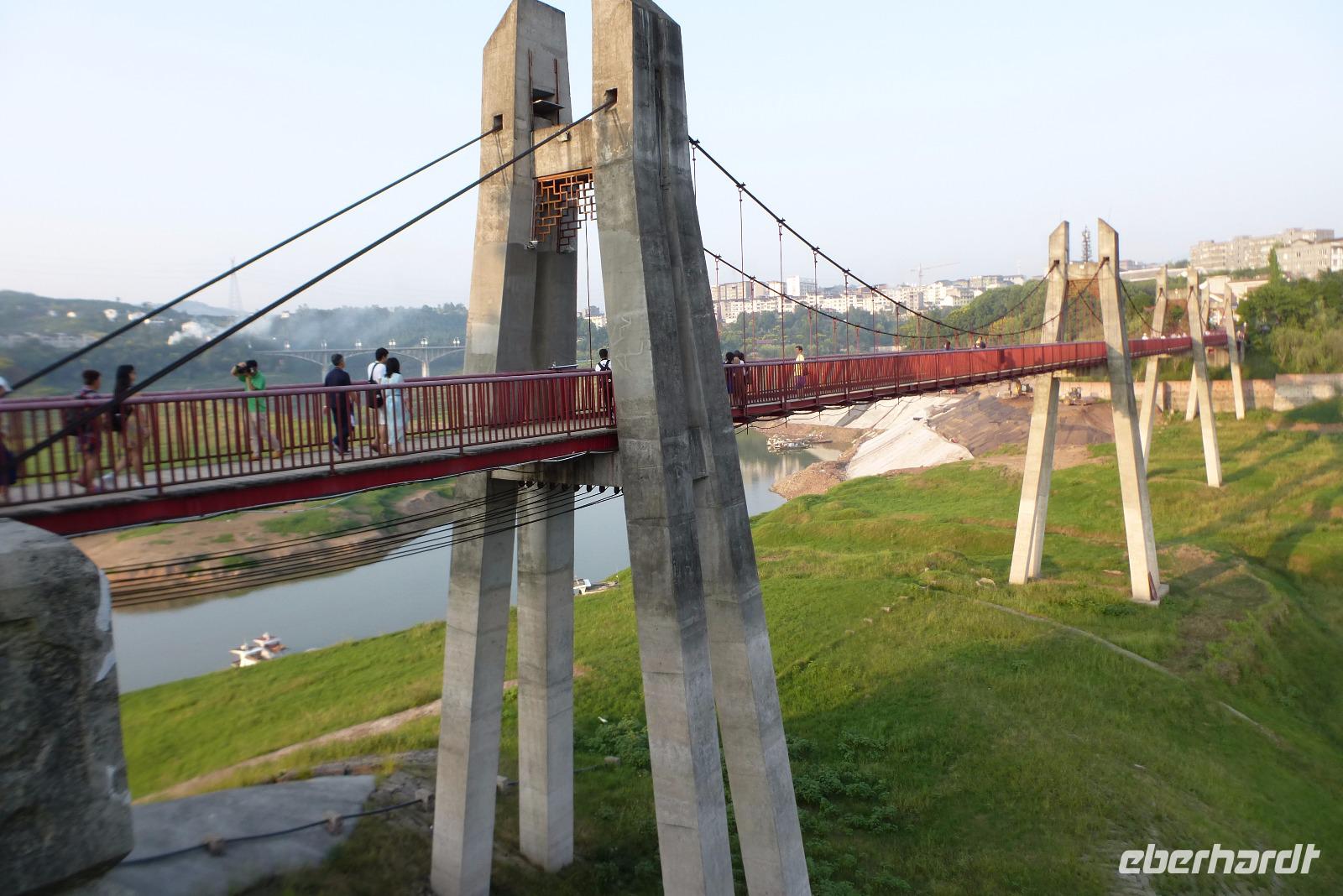 Am frühen Nachmittag legten wir in Shibaozhai an, um die berühmte zwölfstufige hölzerne Shibaozhai Pagode zu besuchen. Bei dem schweißtreibenden Anstieg haben wir unsere Kalorien wieder abgebaut! Eine Vielzahl kunterbunter kleiner Souvenirstände säumte den Weg bis zum Bereich der Pagode. Durch ein gewaltiges Tor ging es hinein - dachten wir - doch zwischen uns und der Pagode lag noch ein gut dreihundert Meter langer Weg über eine schwankende Hängebrücke! Nachdem wir die Pagode von unten betrachtet haben, wollten wir auch hinauf. Über einhundert ausgetretene Holzstufen kletterten wir die ersten neun Stockwerke nach oben zur Plattform vor dem Lanruo Tempel und genossen die herrliche Aussicht über den Jangtse. Die letzten drei Ebenen der Pagode waren dann noch eine echte Herausforderung: nur über eine eiserne Hühnerleiter erreichten wir die höchste Stufe!