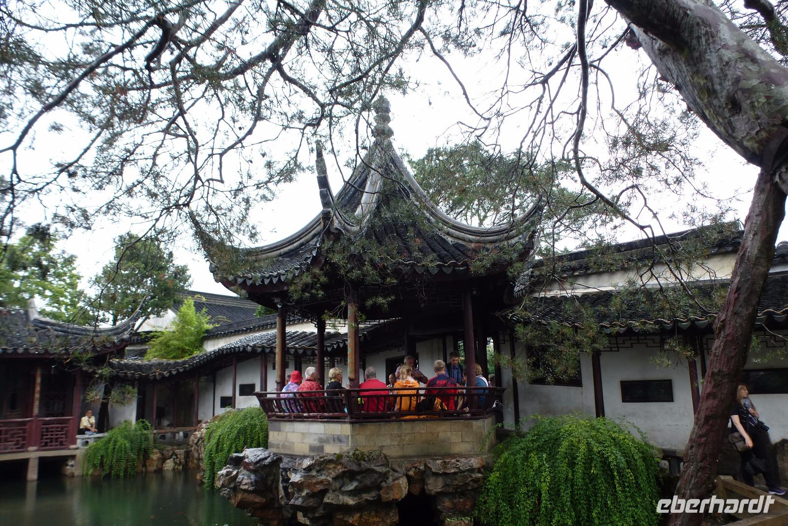 Heute feiern die Chinesen das Mondfest. Und auch wir hatten etwas zu feiern: nach einem ausgiebigen Frühstück in unserem Gartenhotel, versammelten wir uns alle am Fischteich, um unserem Geburtstagskind ein Ständchen zu singen. Danach ging es gleich weiter zum `Garten des Meisters der Fischernetze´. Wieder wunderschön in ihren alten Zustand versetzt, ist diese Anlage typisch für die Gestaltung vornehmer Wohnhäuser im alten China. Die Räume reihen sich aneinander, immer wieder hat man herrliche Aus- und Einblicke in die malerische Gartenarchitektur. Repräsentationszimmer, eine Bibliothek, ein Teehaus und kleine Pavillons bilden ein Labyrinth, das den Schritt und den Blick auf die kunstfertig gestaltete Natur lenkt. An den uralten Bonsaibäumen in ihren winzigen Keramiktöpfen zeigt sich dieser Gestaltungswillen in seiner schönsten Form. In dieser herrlichen Umgebung, am Tage des Mondfestes, in netter Gesellschaft seinen Geburtstag zu feiern, das ist sicher etwas ganz Besonderes, das nicht viele Menschen erleben dürfen! Mit einem kleinen Boot tuckerten wir anschließend über den Kaiserkanal in Suzhou, hinein in die Seitenkanäle, entlang der typischen Häuser der Altstadt. Wir bestaunten bei Tage nun das Viertel, das wir gestern zu Fuß durchwandert haben. Der Kaiserkanal aus der Sui Zeit war als Nord-Süd Verbindung von Peking nach Hangzhou gebaut worden. Mit seiner Länge von über 1800 Kilometern ist er der längste von Menschenhand gebaute Kanal der Welt. Zurecht steht dieses über vierzehnhundert Jahre alte Bauwerk heute als Welterbe unter dem Schutz der UNESCO. Wieder zurück an der Anlegestelle, durften wir leckere in Dampf gegarte Reiskuchen und kandidierte Früchte probieren, die uns allen sehr gut geschmeckt haben.
