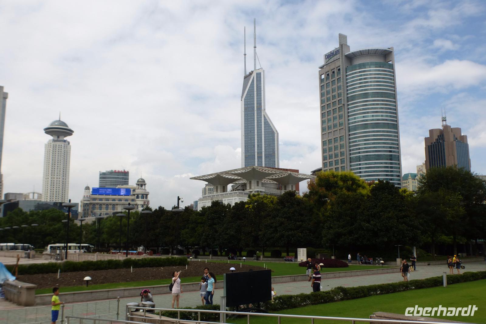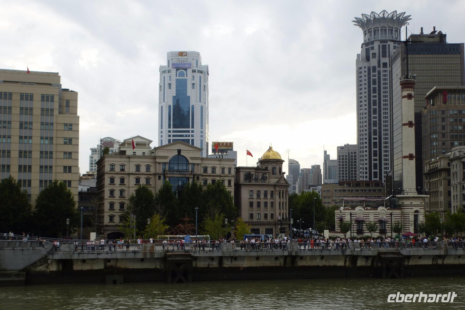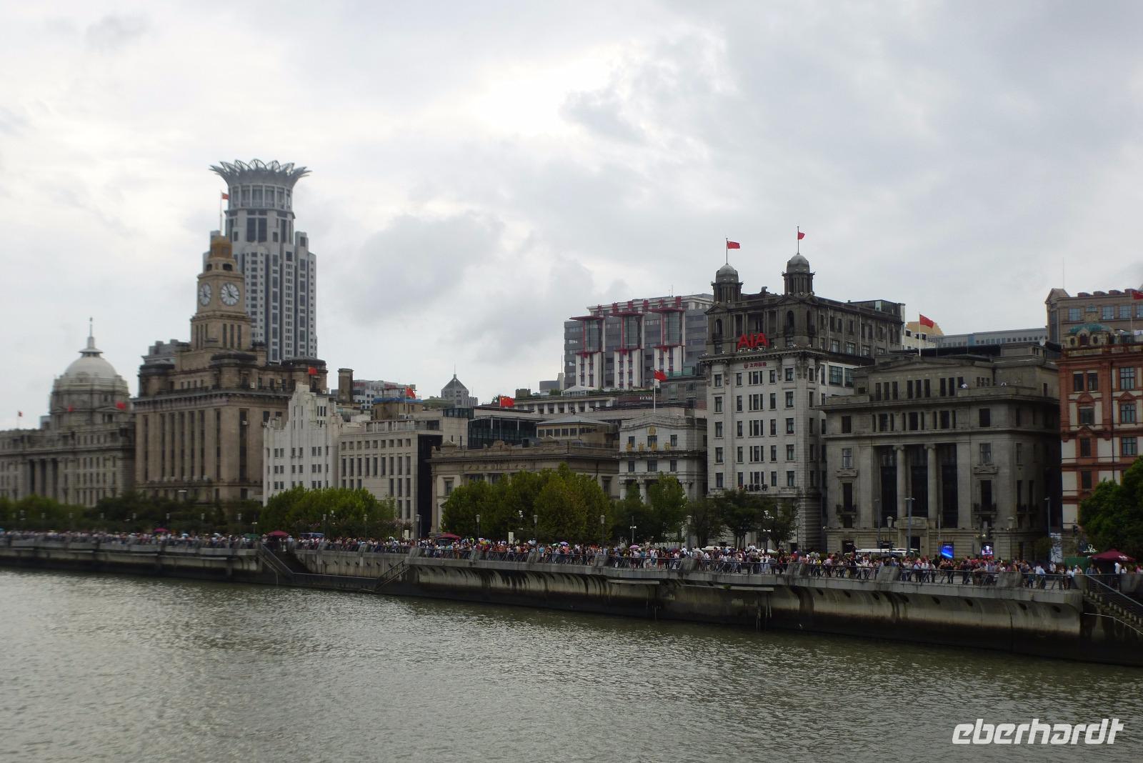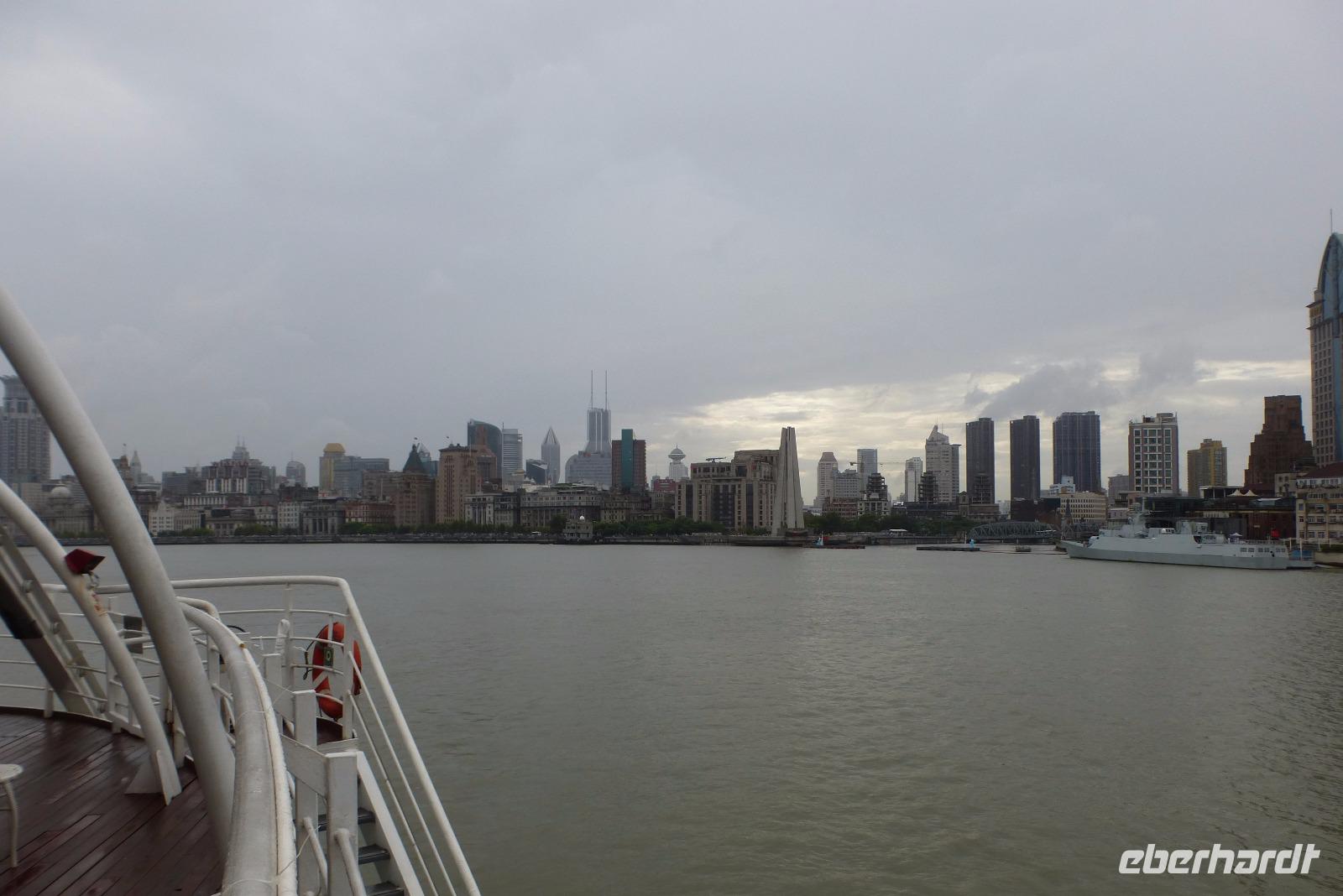 Da man über die genaue Entwicklung des Wetters nicht Bescheid wusste, nutzten wir eine Regenpause für die Hafenrundfahrt über den Huangpu Fluß. Die einst imposanten Gebäude der Kolonialzeit sind heute Relikte aus der Vergangenheit im Schatten gewaltiger Hochhäuser. Am Ostufer des Flusses, südlich des 468 Meter hohen Fernsehturms, ist in den letzten Jahren der Banken- und Geschäftsbezirk Pudong aus dem einstigen Sumpfgebiet in die Höhe geschossen. Und schon greifen neue Bauprojekte in den Himmel und machen dem Shanghai Tower mit 632 Metern Höhe den Titel streitig. Die Skyline von Shanghai verändert sich jährlich und ist eine Ansammlung von Superlativen! Die Promenade am Bund war dicht gefüllt mit einer bunten Menschenmenge in Feiertagsstimmung. Wir ließen den ganzen Trubel und die atemberaubende futuristische Architektur bei einer gemütlichen Hafenrundfahrt an uns vorüber ziehen.
