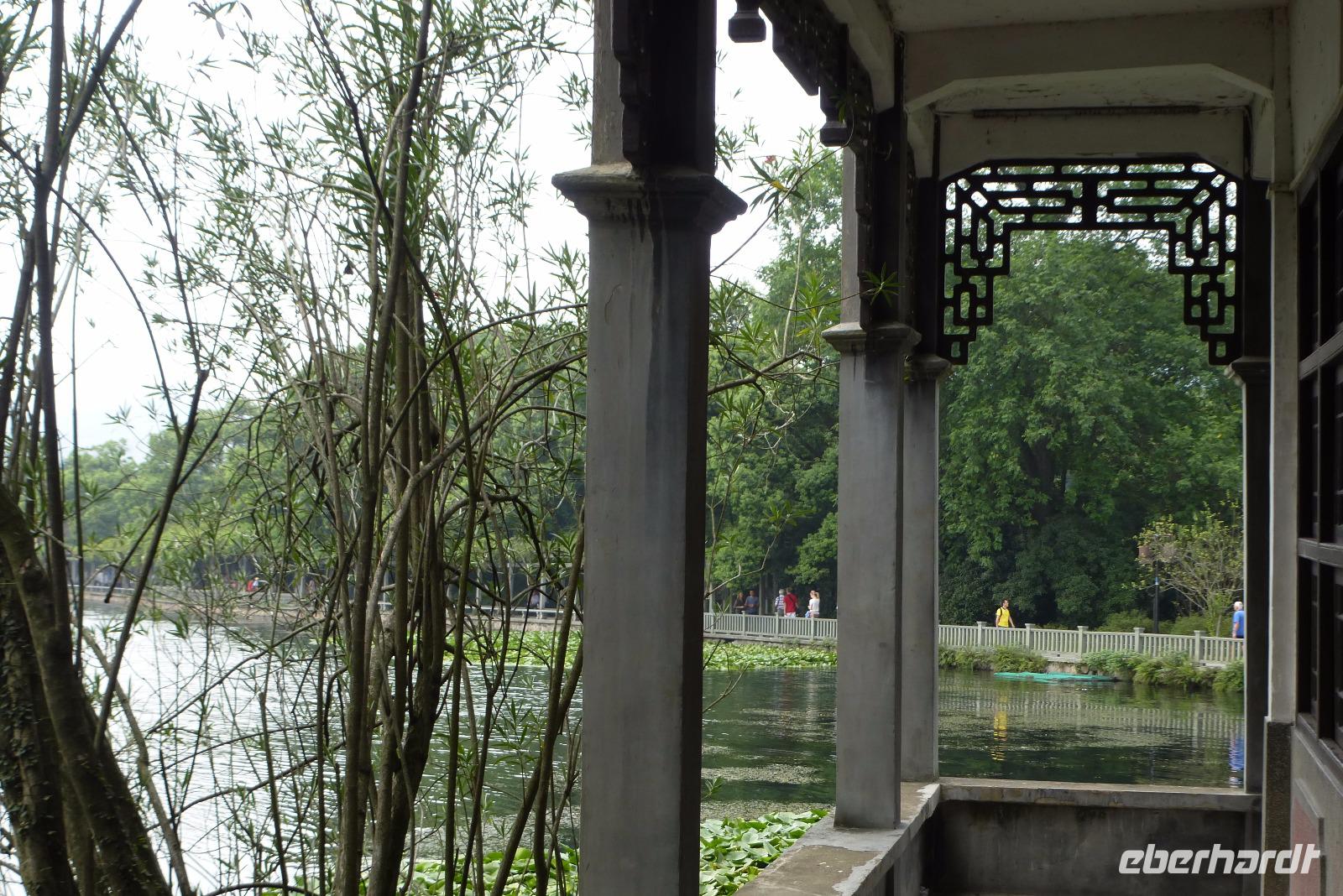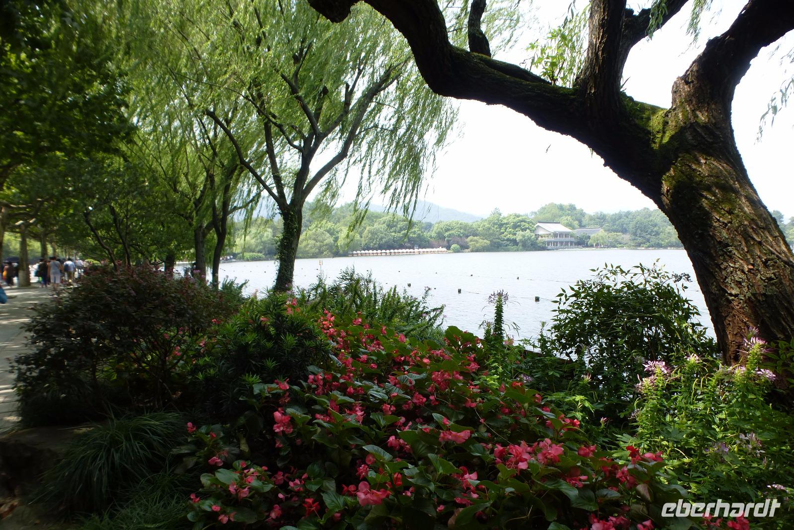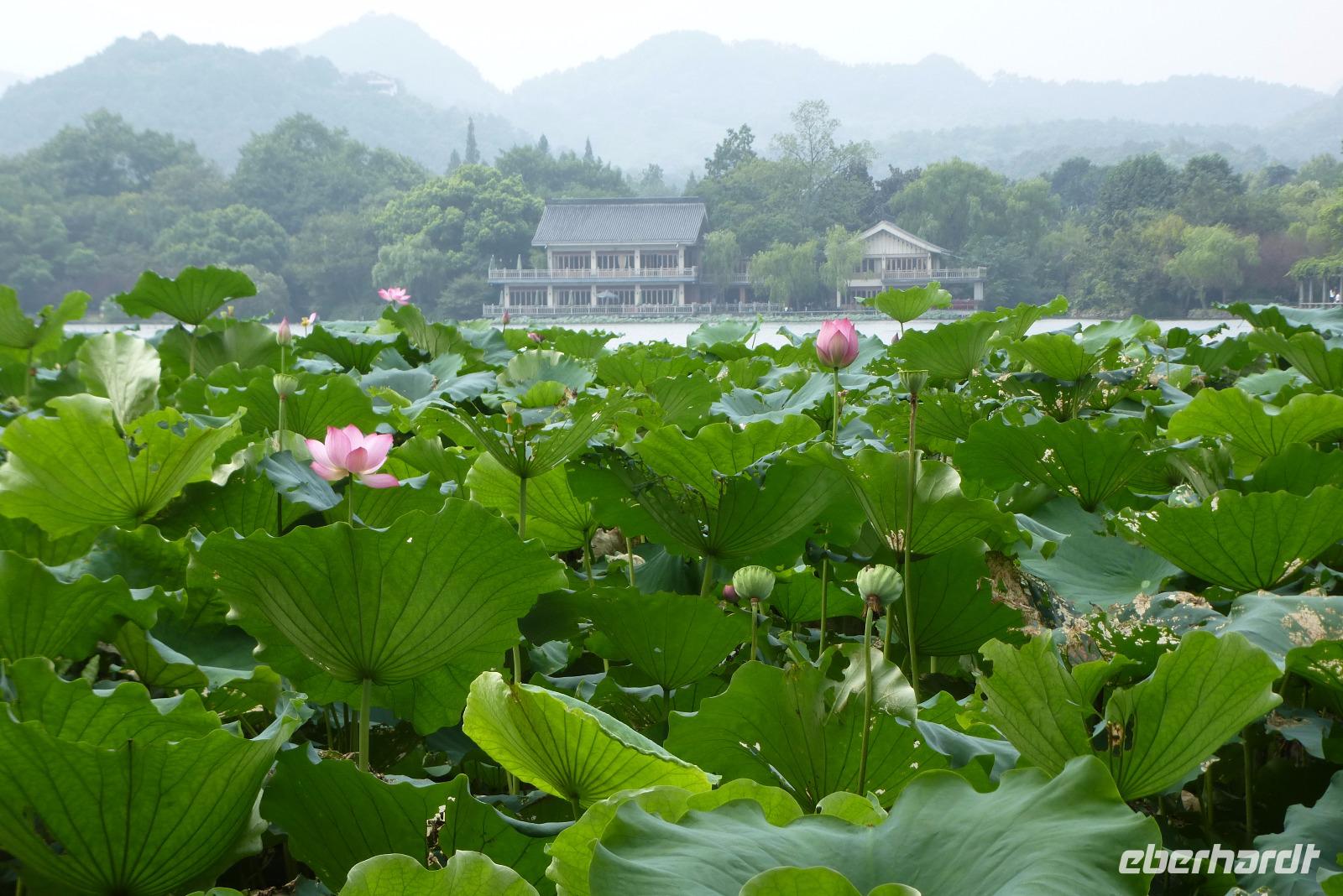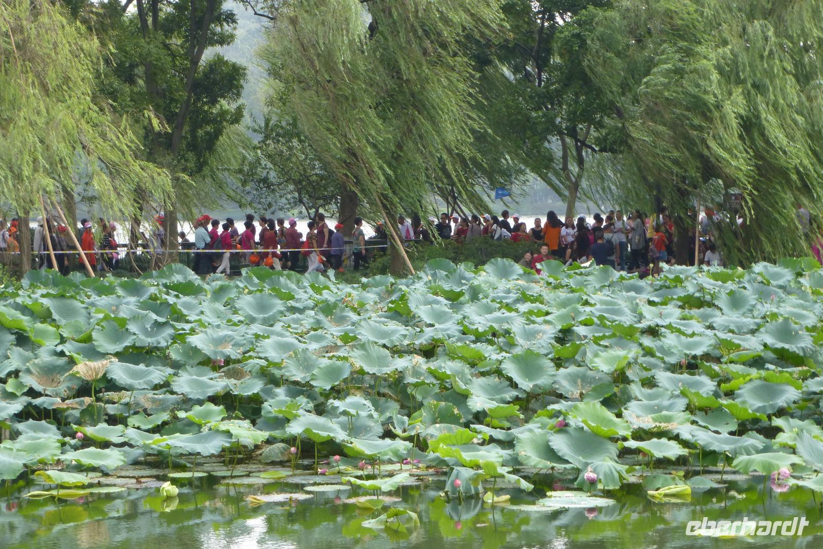 In der Siebenmillionenstadt Hangzhou tagte letzte Woche der G 20 Gipfel. Die alte Kaiserstadt hat sich für dieses große internationale Ereignis herausgeputzt. Überall neue Straßenzüge und die alten Alleen mit ihren französischen Platanen wurden mit wunderschönen Blumenarrangements aufgehübscht. Überall aber auch Überwachungskameras und versiegelte Kanaldeckel! Bei unserer Fahrt hinaus zum Westsee, einem der schönsten Orte der Welt, den schon Marco Polo als Paradies auf Erden bezeichnet hat, konnten wir uns von der prachtvollen Umgestaltung der Stadt für das internationale Großereignis überzeugen. Über viele Brücken fuhren wir auf einer breiten Einbahnstraße durch einen dichten Pflanzendschungel zum Parkplatz. Leider waren wir nicht die einzigen Besucher am See! Unzählige chinesische Touristengruppen, genau nach der Farbe ihrer Hüte sortiert, folgten ihren Guides, die mit quäkenden lautsprecherverstärkten Stimmen ihre Schäfchen zusammen hielten. Der Ort, wo früher die Dichter Ruhe suchten, ist heute ein Touristenmagnet geworden. Kreuz und quer tuckern kleine Ausflugsboote über den See. Vorbei an den drei Pagoden, die auf dem Ein-Yuan Schein abgebildet sind. Im Hintergrund des Sees sehen wir die berühmten Berge, die den See umgeben. An der Südostseite erscheint, wie eine Fata Morgana, die Skyline von Hangzhou. Über die Uferpromenade unter Trauerweiden wandelt eine nicht abreißende Menschenschlange entlang. Wir hatten den Eindruck, dass sämtliche Chinesen, für die der See wegen des G 20 Gipfels lange gesperrt war, ihn genau heute besuchen wollten.