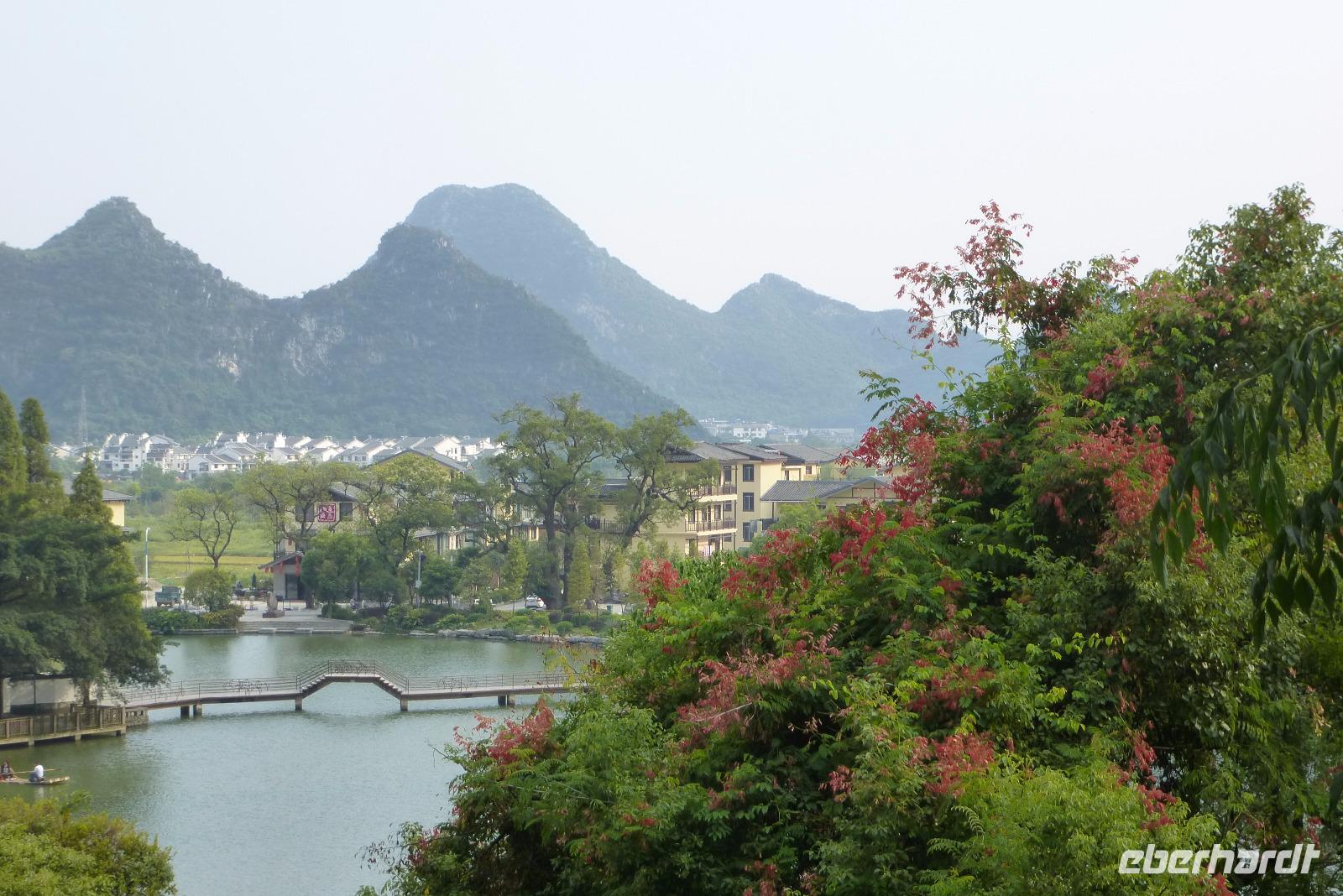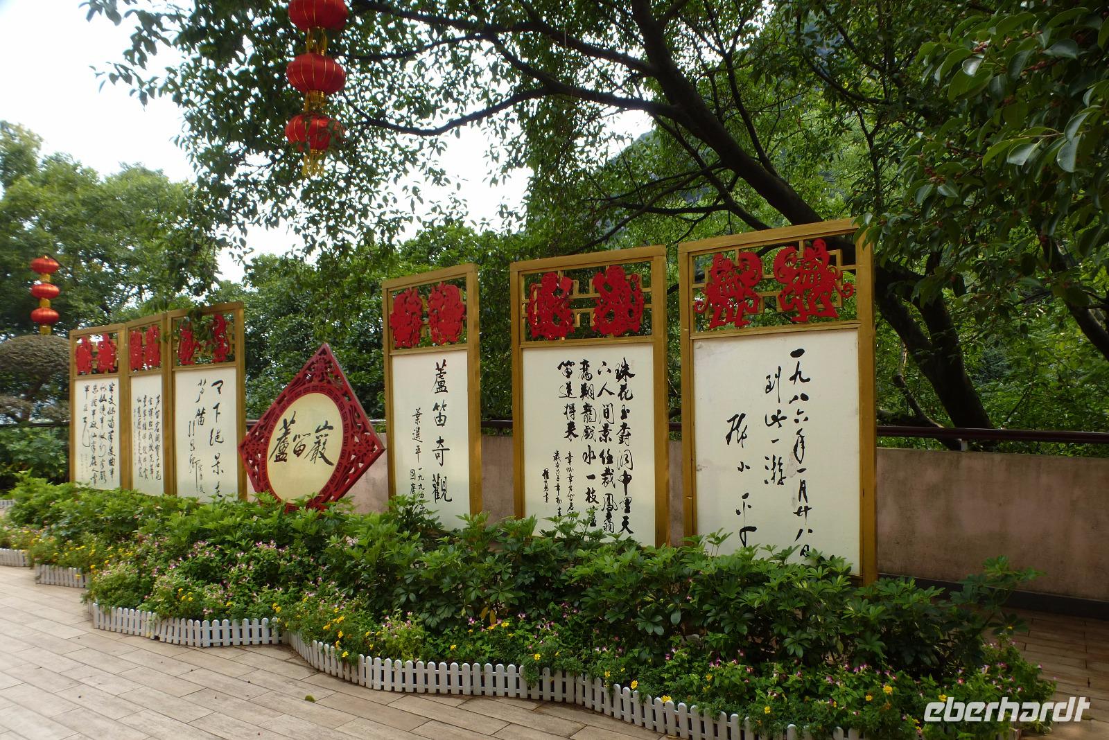 Nach einem ruhigen Flug erreichen wir zweieinhalb Stunden später unser nächstes Ziel: Guilin. Auch hier gepflegte Sauberkeit. Palmen, Oleander und Ginkgobäume in üppigen Rabatten längs der Hauptstraße wechseln sich ab. Alles von Hand gestutzt, abgezupft und gekehrt. Überhaupt ist uns China als ein sehr gefegtes Land erschienen: Viele fleißige Hände und Besen sorgen in öffentlichen Parks und Anlagen für Ordnung und Sauberkeit. Mit 30°Celsius und leichtem Wind war es heute in Guilin richtig angenehm. In diesem subtropischen Klima kann man dreimal im Jahr Reis ernten, hier gedeihen riesige Zimtbäume, Bananenstauden, Litschi- und Mangobäume sowie Kokospalmen, Kaffee, Zuckerrohr und riesige Bambuswälder. Im Herbst, wenn die Zimtbäume blühen, duftet die ganze Stadt! Nicht umsonst hat diese Stadt den Namen Gui Lin, was übersetzt Zimtwald heißt. Leider greifen auch hier die ersten Hochhäuser in den Himmel und konkurrieren mit den dahinter liegenden Bergen. Hoffentlich besinnt sich die chinesische Regierung bald auf ihre grössten Schatz: eine bizarre abwechslungsreiche Naturlandschaft, die unvergleichlich ist. Die berühmten Berge um Guilin, die fantasievollen Namen wie zum Beispiel Elefantenrüsselberg tragen, sind eine uralte Karstlandschaft, die vor 200 Millionen Jahren entstanden ist. Viele Berge sind von Tropfsteinhöhlen durchlöchert. Durch eine bunt blühende Dschungellandschaft steigen wir gemeinsam hinauf zur Schilfrohrflötenhöhle Luddiyan. Diese zweihundertvierzig Meter tiefe Tropfsteinhöhle ist effektvoll ausgeleuchtet und wir nehmen ein Bad im bunten Lichtermeer! Auf dem Rückweg bewundern wir noch einen gewaltigen Banyan Baum und spazieren gemächlich am kleinen See entlang auf dem unter Flötenklängen Bambusflöße gemächlich über´s Wasser dümpeln. Es war eine herrliche Ruhe am Fuße des Karstkegel: die fliegenden Händler und Budenbesitzer hatten längst schon Feierabend gemacht. Auch für uns neigte sich der Tag langsam dem Ende entgegen. Das Abendessen in einem chinesischen Restaurant mit köstlichem Buffet ließ keine Wünsche mehr offen.