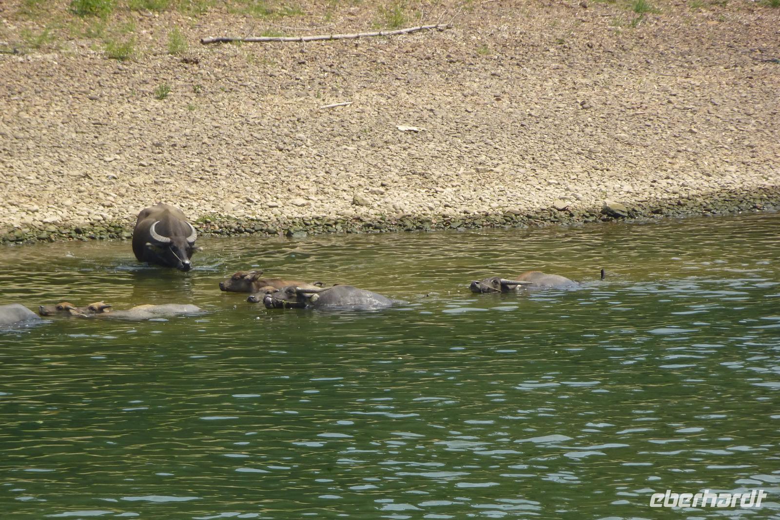 Schon früh ging es heute Morgen hinaus aus der Stadt Guilin zur Anlegestelle der Flussschiffe. Leider kamen wir in einen dichten Stau. Auf Tuchfühlung mit Motorrädern, dreirädrigen Kleintransportern, Bussen und PKWs der gehobenen Mittelklasse quälte sich unser Bus durch das Gedränge der anderen Verkehrsteilnehmer, die kreuz und quer versuchten das beste Plätzchen im Stau zu ergattern. Um unsere Verspätung wieder aufzuholen, machte unser Fahrer Michael Schumacher Konkurrenz und brauste mit 110 km/h über die topfebene neue dreispurige Schnellstraße. Ein echter Höllenritt! Mit etwas Verspätung erreichten wir unser Schiff. Die anderen Reisegruppen hatten wohl keinen Fahrer mit Rallyeambitionen und so legte das Schiff dann doch erst eine Viertelstunde später ab. Fast 5 Stunden tuckerten wir über den Li Fluss, vorbei an der herrlichen Kulisse der berühmten Karstberge. Gemächlich ließen wir die herrliche Landschaft flussabwärts an uns vorbei gleiten. Immer wieder trafen wir auf Fischer, Muschelsucher oder Händler, die an den größeren Booten mit ihrem Angebot an Früchten, Fischen, Krebsen und anderem Halt machten. Die subtropische Vegetation mit gewaltigen Bambuswäldern, riesigen Bananenstauden und Palmen vor den bizarren Berggipfeln war für uns bei blauem Himmel ein lohnendes Fotomotiv. Immer wieder sahen wir Wasserbüffel, Laufenten und zum Fischfang abgerichtete Kormorane. Die entfernteren Berge liegen im Dunst; schon die alten Maler und Dichter haben sich von dieser Landschaft zu ihren schönsten Kunstwerken inspirieren lassen. Märchenhafte Geschichten ranken sich um die Felsen, an denen schon die Urmenschen siedelten. Heute ist die Uferzone mit großen Gabionen befestigt, Anlegestellen und Leuchttürme erleichtern die Schifffahrt durch dieses sehr flache, aber durch seine Strudel doch gefährliche Gewässer. Der klassische BMW, Bauer mit Wasserbüffel, ist selten geworden. Eher sieht man Arbeiter mit Baggern. Auf dem Schiff gab es auch eine regionale Spezialität: Schlangenschnaps. Nur ein Mutiger aus unserer Gruppe hat ein kleines Gläschen davon probiert: schmeckt wie starker Wermut. Wer's nicht glaubt, muss es selber probieren!