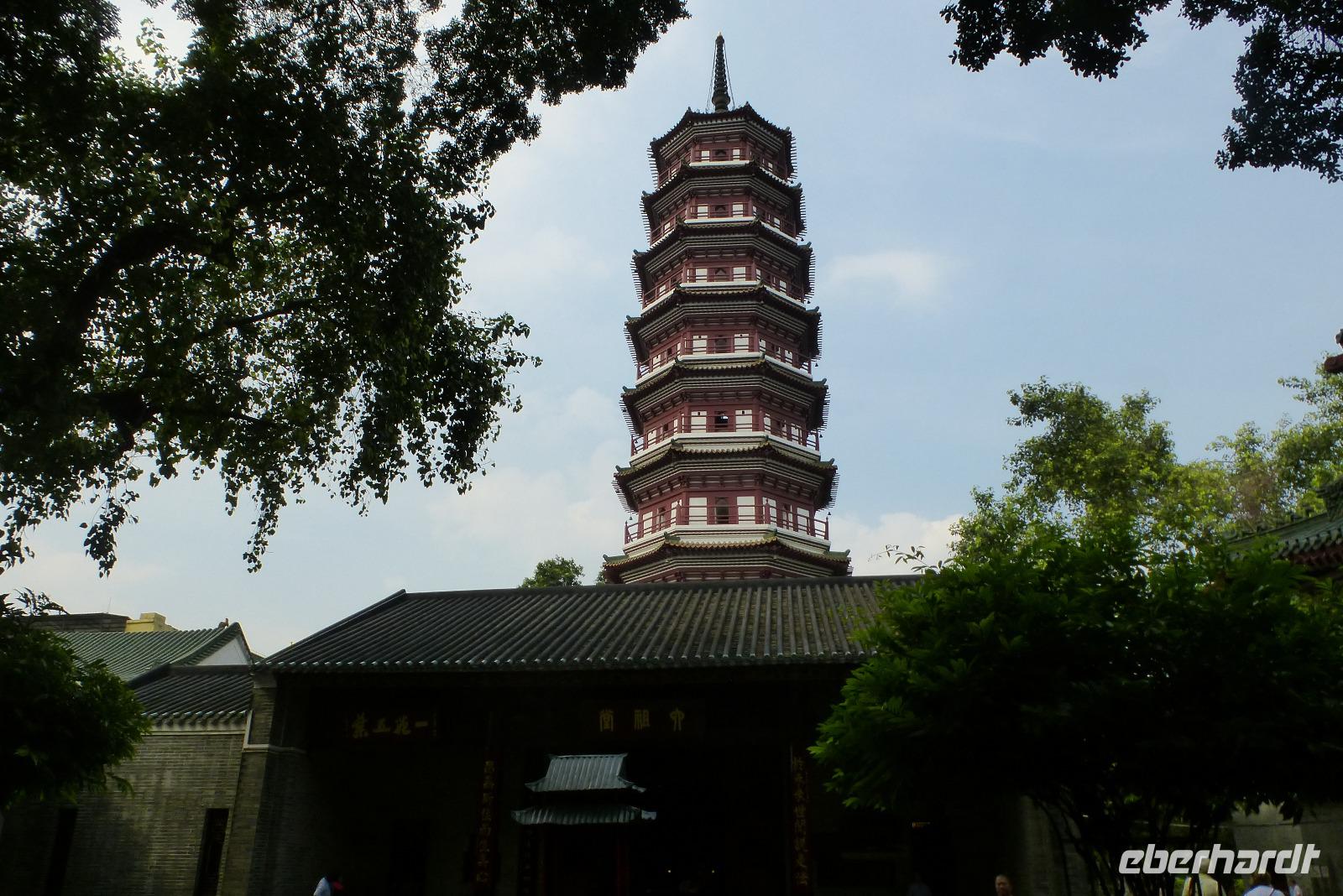 Weiter ging unsere Fahrt zur Sechs-Harmonien-Pagode. Der erste Anstieg zur Ebene der Pagode überraschte uns mit steilen hundert Treppenstufen. Oben angekommen stärken wir uns erst einmal bei einem kleinen Umtrunk. Viele Chinesen waren heute hier auch wegen der alljährlich wiederkehrenden großen Springflut am 15. Tag des achten Mondmonats. Hinter der sechzig Meter hohen Pagode ging es noch einmal reichlich zweihundert Stufen in die Höhe, vorbei an Nachbildungen der berühmtesten Pagoden aus ganz China. Je weiter man nach oben stieg, desto ruhiger wurde es... Nur der gewaltige Ton der riesigen Bronzeglocke, die wir natürlich auch angeschlagen haben, schallte vom Berg!