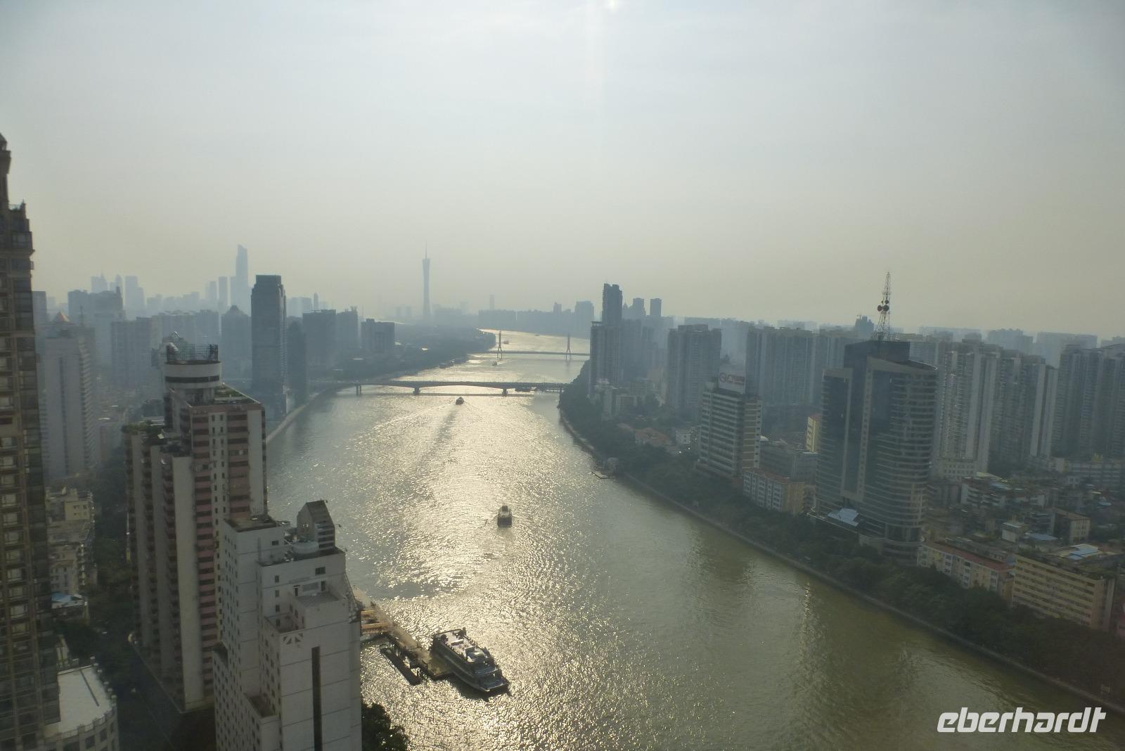 Bei tropischen Temperaturen feierten wir dann am Nachmittag wieder einen Geburtstag. Dieses Mal in einem wunderschönen Tropengarten. Bambus und Bananenstauden wuchsen in den Himmel und unter Palmen sangen wir gemeinsam ein Ständchen für unser Geburtstagskind. Und schon waren wir am Hotel, wo wir von unseren Zimmern im 21. Stockwerk, die Aussicht auf die Stadt und den Perlfluss, dem fünftgrößten Fluss Chinas, richtig genießen konnten! Bei der Rückkehr vom Abendessen bestaunten wir noch bei einer Lichterrundfahrt die Skyline von Kanton. Der 610 Meter hohe Fernsehturm der niederländischen Architekten Hemel und Quit, die mit der geschwungenen femininen Form des Bauwerks bewusst einen Akzent gegen die üblichen kantigen Hochhäuser setzten, steht da, wo vor 20 Jahren noch Ackerland und Obstgärten waren. Man fragt sich öfter, ob auch diese gewaltigen Büro- und Bankhochhäuser und die unendlichen Wohnhochhäuser (das höchste hier hat 58 Stockwerke!), tatsächlich alle nach den Kriterien des Feng Shui gebaut worden sind.