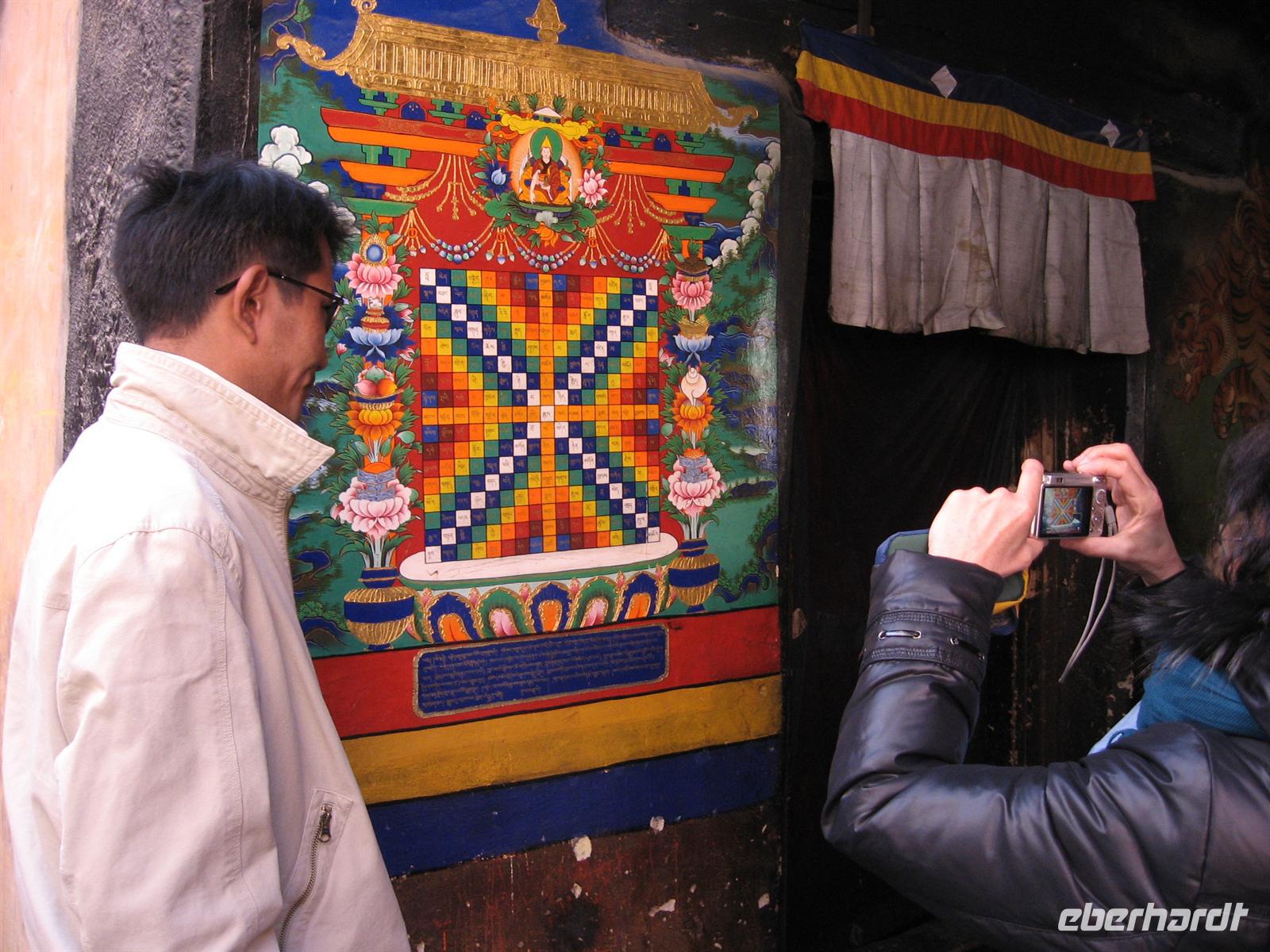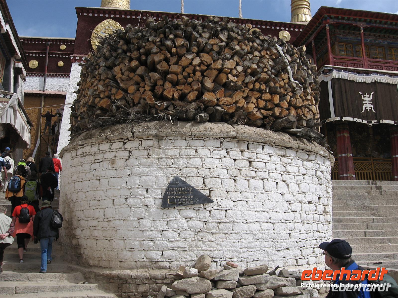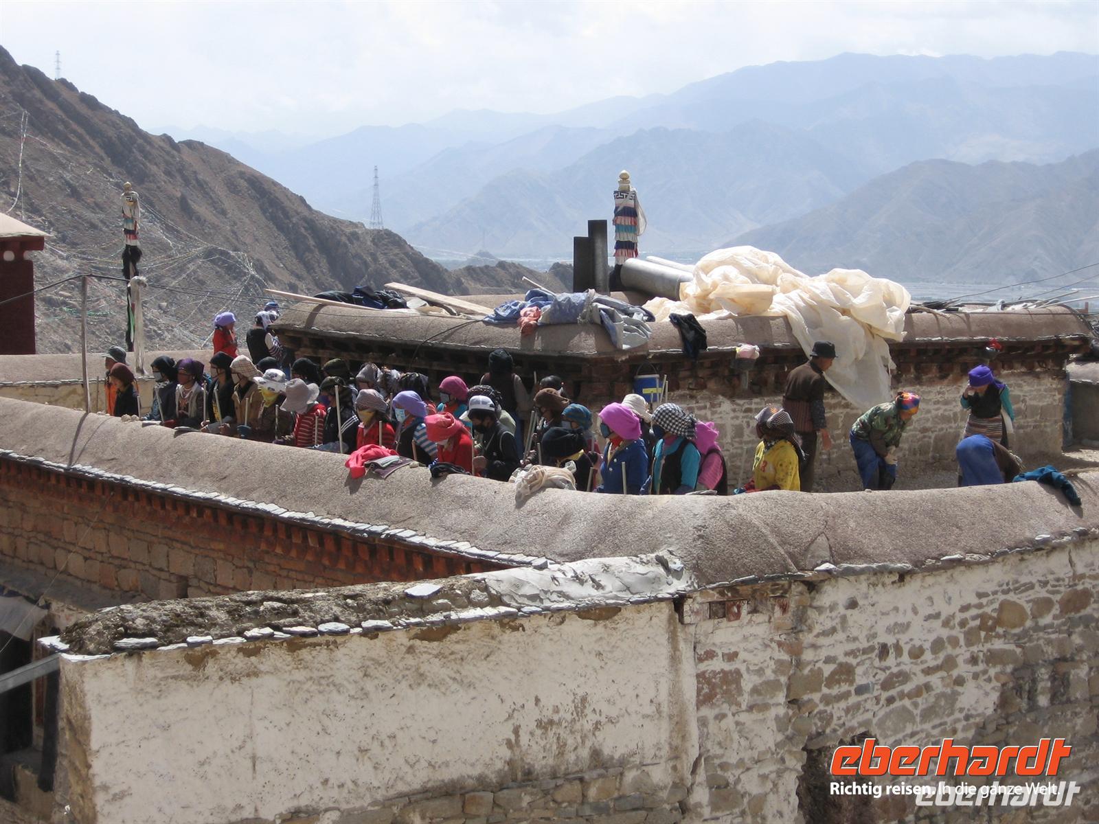 Nach einem guten Frühstück beginnen die ersten Besichtigungen. Mit dem Bus fahren wir zum etwas außerhalb des Stadtzentrums gelegenen Drepung-Kloster, gegründet im Jahre 1416. Einst war es eins von mehreren Klöstern, welche als Universität genutzt wurden. Früher waren mehr als 10.000 Mönche im Kloster, um zu studieren. Ebenfalls lebten der 2. bis 5. Dalai Lama im Drepung- Kloster. Auch heute gibt es drei Fakultäten und etwa 800 studierende Mönche. Sie können Astrologie, tantrische Ritualpraxis und Geheimnisvolles studieren. Das Drepung Kloster ist ebenfalls sehr bekannt für viele Feste, zum Beispiel das Joghurt-Fest oder das Leitern-Fest. So kann man an einem Felsen angemalte Leitern sehen, der Gläubige bittet daraum, das die Gottheit zu ihm hinabsteigen soll. Wir besichtigen die Privatgemächer des 5. Dalai Lama, die Halle der Vollversammlung und die Küche des Klosters. Oberhalb der Küche hören wir einen gleichmäßigen Chorgesang und sehen bald darauf Tibeter, welche bei der Arbeit singen. Sie stampfen nach alter Tradition einen Fußboden bzw. eine Dachfläche. Das Dach ist aus Stroh, Steinplatten, Sand, Zucker und Rapsöl aufgebaut und muss zur Verdichtung gestampft werden. Damit diese Arbeit nicht zu stupide wird singen sie. Während unseres Rundgangs erfahren wir auch Interessantes zu den Bestattungsriten der Tibeter. So ist es immer noch üblich, dass die Toten zur Luftbestattung gebracht werden. Durch einen speziellen Bestatter (Zerstückler) wird der Tote zerlegt und dann an einem speziellen Platz den Geiern übergeben. Solch ein spezieller Luftbestattungsplatz befindet sich auch in der Nähe des Drepung-Klosters. Eine Feuerbestattung, so wie wir sie kennen, hatten die Tibeter nicht. Erst durch den vermehrten Zuzug von Chinesen wurde ein Krematorium eingerichtet. Wird heute ein Tibeter zur Feuerbestattung gebracht, wird seine Asche in die Luft geworfen.
