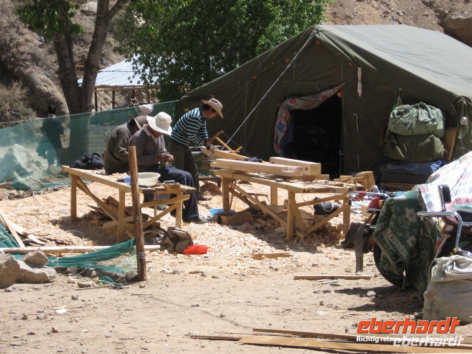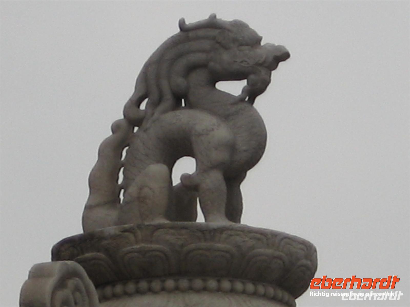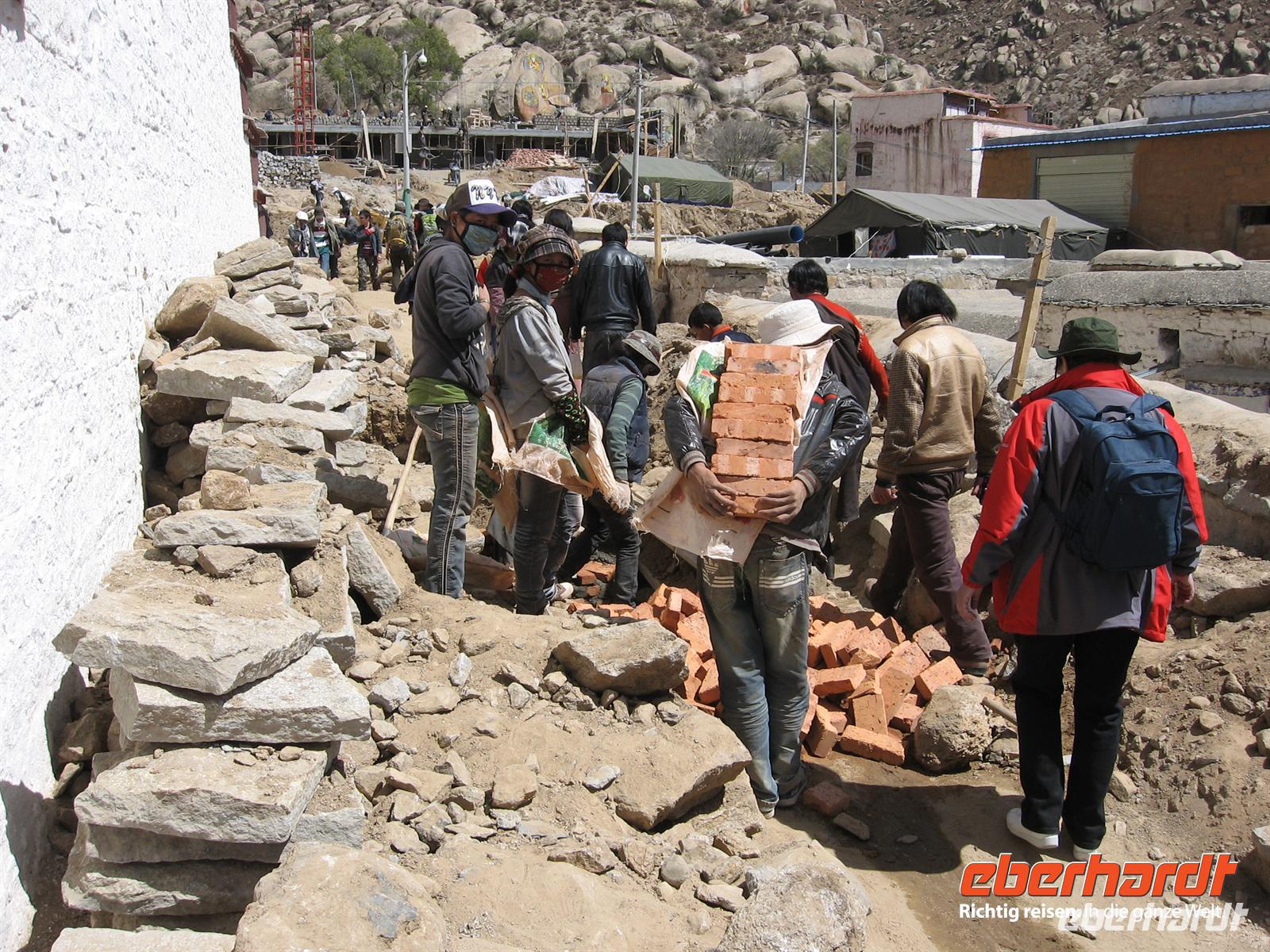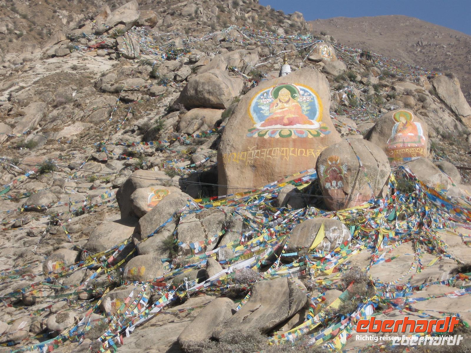 Nach einem guten Frühstück beginnen die ersten Besichtigungen. Mit dem Bus fahren wir zum etwas außerhalb des Stadtzentrums gelegenen Drepung-Kloster, gegründet im Jahre 1416. Einst war es eins von mehreren Klöstern, welche als Universität genutzt wurden. Früher waren mehr als 10.000 Mönche im Kloster, um zu studieren. Ebenfalls lebten der 2. bis 5. Dalai Lama im Drepung- Kloster. Auch heute gibt es drei Fakultäten und etwa 800 studierende Mönche. Sie können Astrologie, tantrische Ritualpraxis und Geheimnisvolles studieren. Das Drepung Kloster ist ebenfalls sehr bekannt für viele Feste, zum Beispiel das Joghurt-Fest oder das Leitern-Fest. So kann man an einem Felsen angemalte Leitern sehen, der Gläubige bittet daraum, das die Gottheit zu ihm hinabsteigen soll. Wir besichtigen die Privatgemächer des 5. Dalai Lama, die Halle der Vollversammlung und die Küche des Klosters. Oberhalb der Küche hören wir einen gleichmäßigen Chorgesang und sehen bald darauf Tibeter, welche bei der Arbeit singen. Sie stampfen nach alter Tradition einen Fußboden bzw. eine Dachfläche. Das Dach ist aus Stroh, Steinplatten, Sand, Zucker und Rapsöl aufgebaut und muss zur Verdichtung gestampft werden. Damit diese Arbeit nicht zu stupide wird singen sie. Während unseres Rundgangs erfahren wir auch Interessantes zu den Bestattungsriten der Tibeter. So ist es immer noch üblich, dass die Toten zur Luftbestattung gebracht werden. Durch einen speziellen Bestatter (Zerstückler) wird der Tote zerlegt und dann an einem speziellen Platz den Geiern übergeben. Solch ein spezieller Luftbestattungsplatz befindet sich auch in der Nähe des Drepung-Klosters. Eine Feuerbestattung, so wie wir sie kennen, hatten die Tibeter nicht. Erst durch den vermehrten Zuzug von Chinesen wurde ein Krematorium eingerichtet. Wird heute ein Tibeter zur Feuerbestattung gebracht, wird seine Asche in die Luft geworfen.