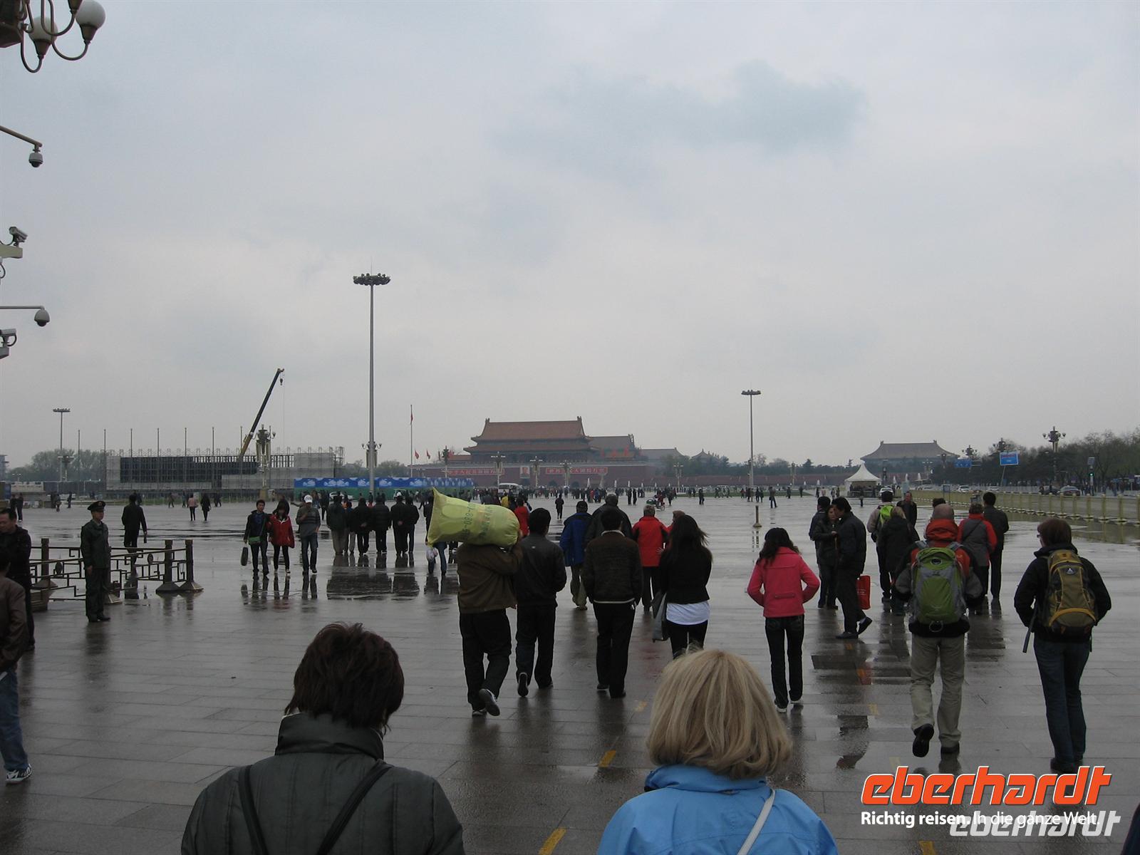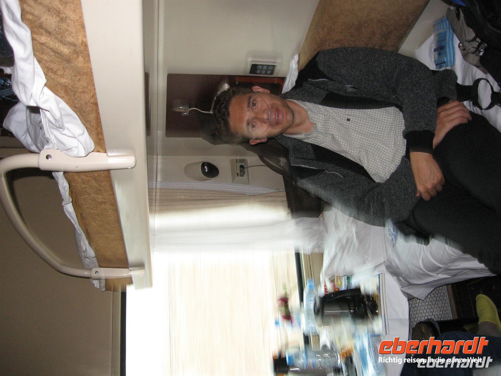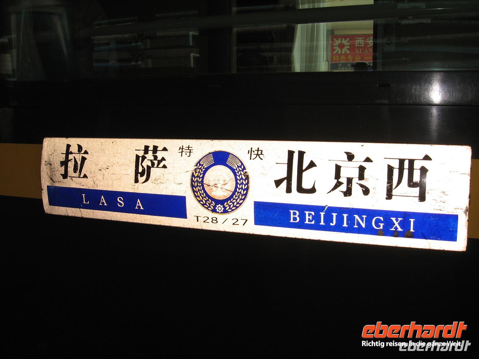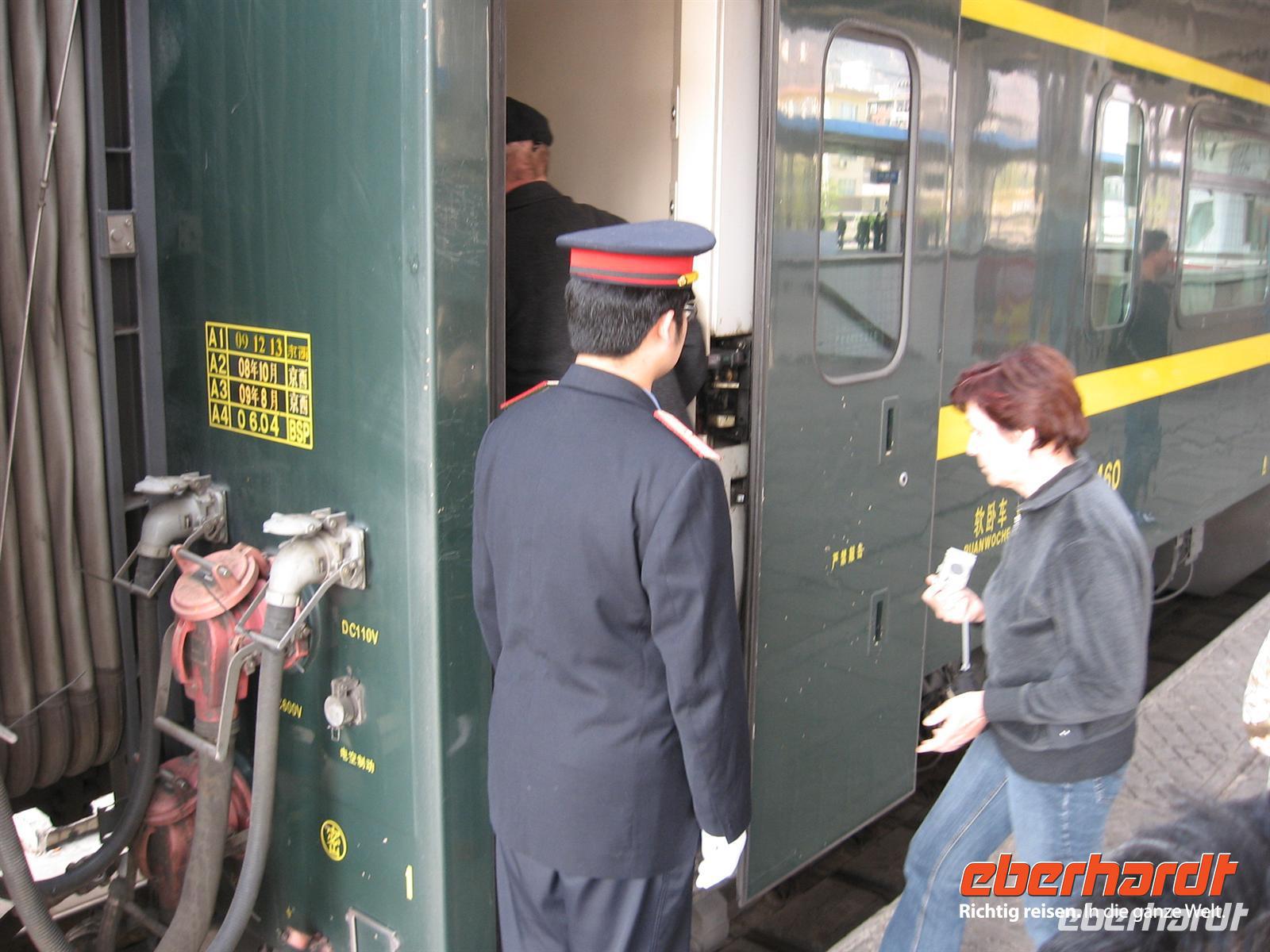 Mit dem Bus fahren wir dann ins Zentrum von Peking, der Hauptstadt der Volksrepublik China. Ich selbst war das letzte Mal 2004 in Peking und erkenne die Stadt nicht wieder. Hochhäuser prägen heute mehrheitlich das Bild. Wir fahren zum Platz den Himmlischen Friedens. Dort sehen Sie das Mausoleum von Mao und das Gebäude des Volkskongresses. In diesem gibt es einen Plenarsaal wo 10000 Gäste Platz finden. Auf der anderen Seite der Straße sehen wir schon den Eingang zum Kaiserpalast, über dem Eingang prangt nach wie vor das Bild des großen Vorsitzenden Mao. Das Bild wird jedes Jahr ausgetauscht, damit er auch immer schön jung und strahlend aussieht. Anschließend laufen wir durch das Areal der Kaiserstadt und besichtigen einige der Paläste. Etwas Abseits können wir auch die ehemaligen Privatgemächer des Kaisers und seines Personals sehen. Das Wetter meinte es nicht so gut mit uns, es war recht kalt und trüb an diesem Tag. Zur Entspannung besuchten wir danach das Zentrum für traditionelle chinesische Medizin. Alle Gäste, die es wollten, konnten sich bei einer Fußmassage entspannen. Dazu bekamen wir einige Grundregeln der Traditionellen Chinesischen Medizin vermittelt und wer wollte, konnte einen Professor konsultieren. Und einige Gäste verließen das Haus auch mit kleinen blauen Beuteln, was da wohl so drin war? Anschließend waren wir Abendessen - unsere erste Begegnung mit der chinesischen Küche. Allerdings war das Essen auf uns Europäer zugeschnitten. Gegessen wurde an einem Drehtisch, das macht Freude, immer wenn ich mich entschieden hatte, war das Essen schon wieder einen Platz weiter. Satt geworden sind wir alle. Nun fahren wir zum Westbahnhof von Peking, um mit dem Zug T27 nach Lhasa zu fahren. Auf dem Bahnhof herrscht ein unwahrscheinliches Gedränge, aber unser Reiseleiter Herr Meng hat den Durchblick und so kommen wir sicher zum Zug. Bereits im Bus habe ich die Gäste auf die einzelnen 4-Bett Kabinen verteilt, wir fahren erste Klasse. In der zweiten Klasse schlafen immer 6 Personen in einer Kabine. Zuerst kommt es uns allen ein wenig eng vor. Nachdem wir uns alle eingefädelt haben, geht es und die Reise kann beginnen. Im Speisewagen bekommen wir etwas zu trinken, bevor wir alle müde in unser Bett sinken.