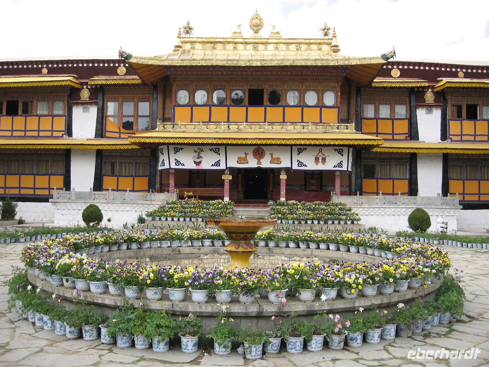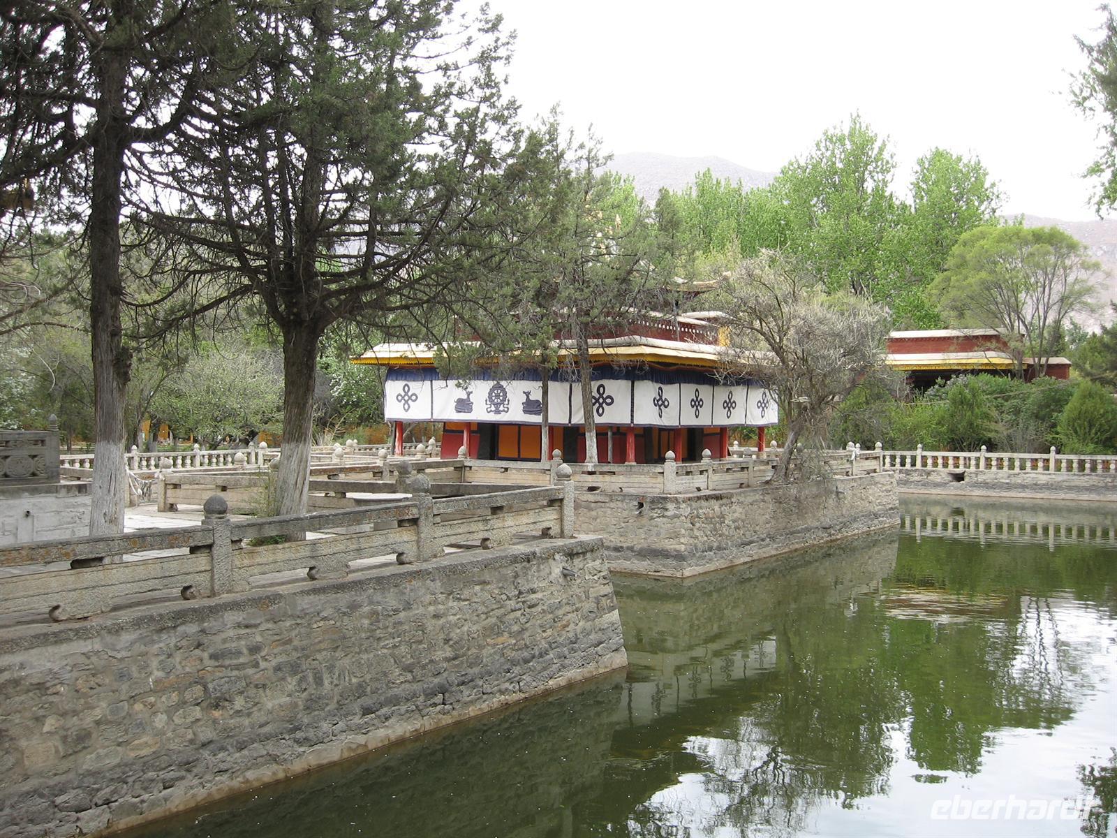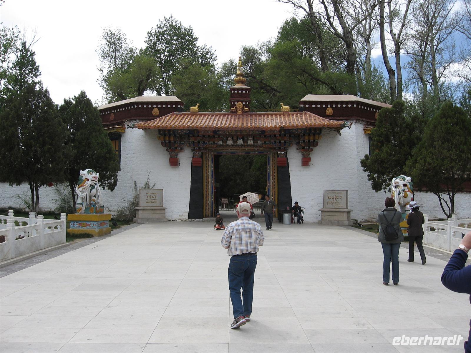 Norbulinka, der Sommerpalast des bzw. der Dalai Lamas wird am Nachmittag besucht. Das riesige Gelände dient heute als Volksgarten. Es gibt mehrere Parzellen mit den Sommerpalästen des 7. und 8. sowie des 13. und 14. Dalai Lama. Der 14. Dalai Lama, also der jetzige, hat hier bis 1959, seinem Aufbruch ins Exil nach Indien, gewohnt. In seinem erst 1956 fertiggestellten Palast besuchen wir alle zugänglichen Räume. Für tibetische Gläubige ist dieser Ort ein sehr wichtiger. Hier können sie ihrem Dalai Lama am nächsten sein, denn sein Geist weht auch heute durch diese Räume. Das ganze wunderbare Areal mit seiner schönen und gepflegten Gartenanlage gehört zum UNESCO-Weltkulturerbe.