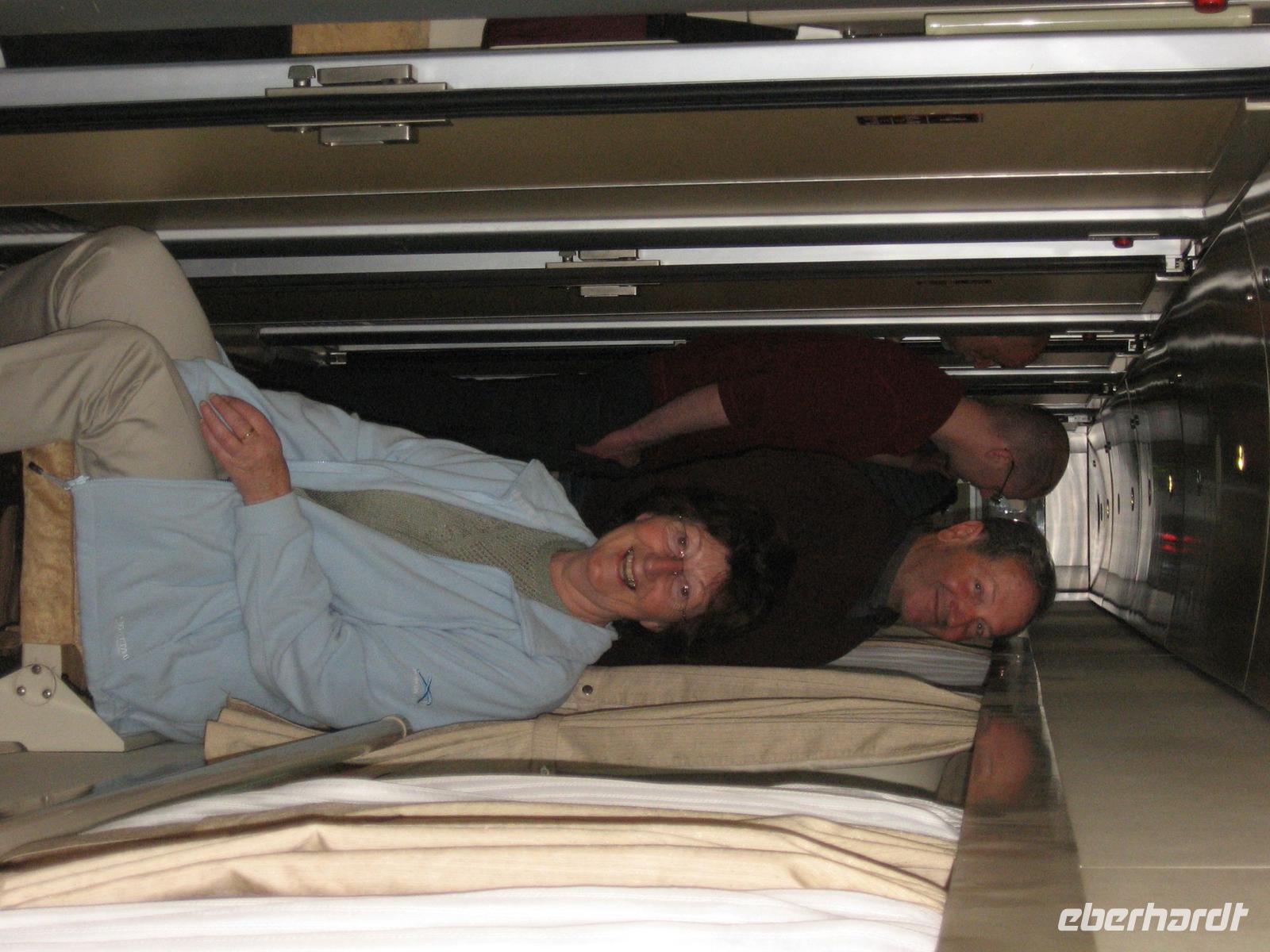 Dreimal hält unser Zug auf seiner Fahrt, immer Gelegenheit kurz auszusteigen und an einem der vielen Servicewagen etwas zu kaufen. 18 Uhr treffen wir uns im Speisewagen zum Abendessen. Das Essen ist wieder gut, obwohl es zum Beispiel Bittergurke mit Knoblauch gibt, was nicht so unser Fall ist, probiert haben wir trotzdem. Das Zugpersonal bietet zudem Joghurt zum Kaufen an, gemacht aus Jakmilch, sehr lecker. Vor dem schlafen erhalten wir alle Sauerstoffschläuche, die direkt über dem Bett angeschlossen werden können. Also sind wir für den Notfall versorgt, die meisten Gäste und auch ich haben keine Erfahrung mit Höhen ab 3.500 Metern und in solchen werden wir uns bald bewegen.
