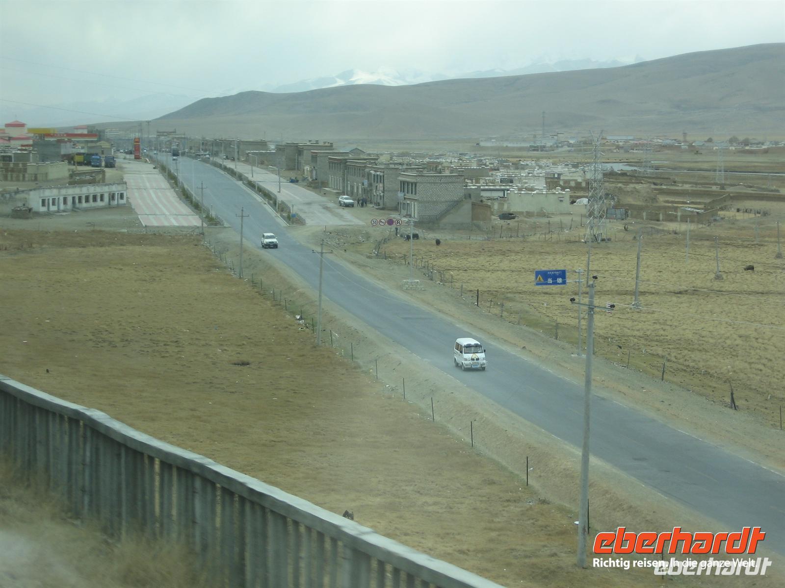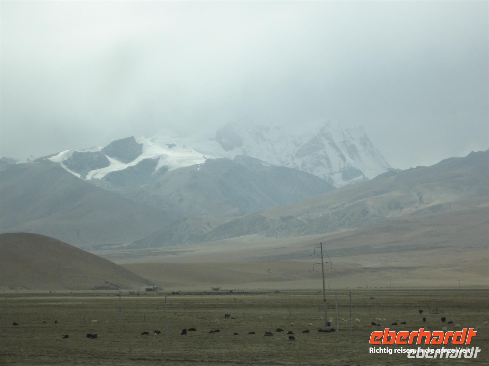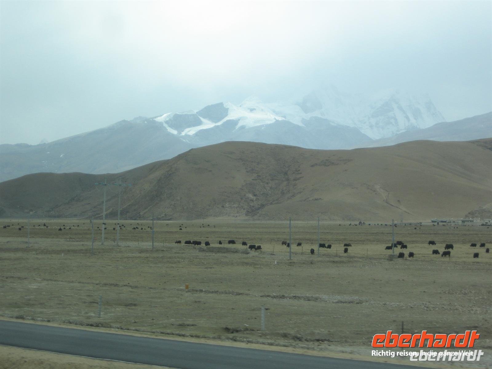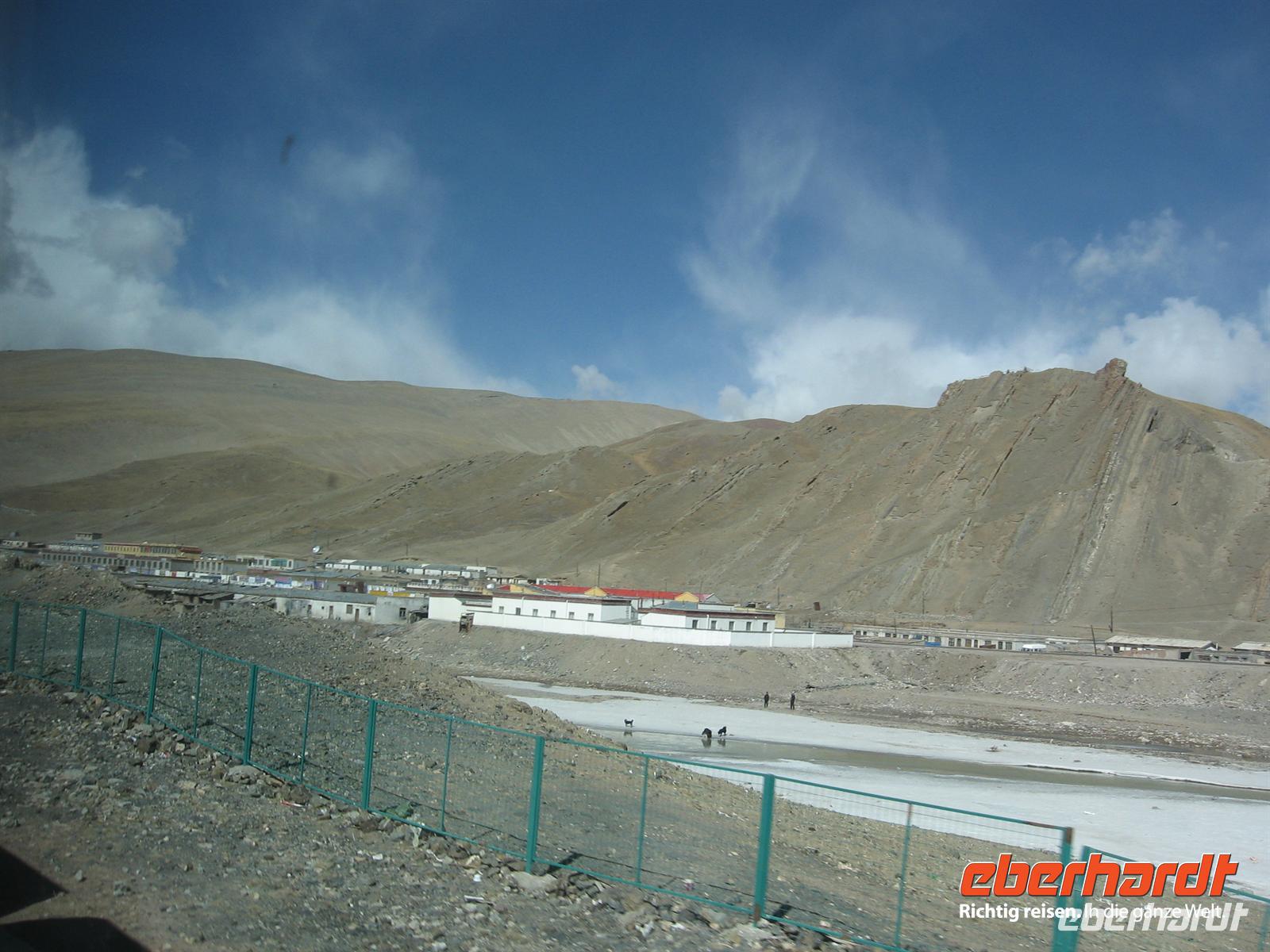 In der Nacht passieren wir den Bahnhof Golmud. Jetzt beginnt der interessantere Teil der Strecke, die eigentliche Tibetbahn. Die nächsten knapp 1.000 Kilometer sind erst im Jahr 2006 fertiggestellt worden und führen teilweise über Dauerfrostboden. Die Landschaft ändert sich auch, sie wird weiter, einsamer. Hohe, zum Teil schneebedeckte Berge ziehen an uns vorüber. Immer wieder sehen wir kleine Siedlungen und erste tibetische Gebetsfahnen. Manchmal mutet es schon komisch an, das daneben auch die chinesische Staatsflagge weht. Gegen Mittag passieren wir den höchst gelegenen Bahnhof der Welt, Tanggula auf 5.068 Metern. Der gleichnamige Pass ist noch 4 Meter höher. Leider sagt uns das Zugpersonal die falsche Seite, so dass wir nicht alle das kleine Bahnhofsgebäude sehen können. Und wie sind wir mit der Höhe klargekommen? Eigentlich alle sehr gut, bei manchem hat sich etwas Druck im Stirnbereich bemerkbar gemacht, aber der Sauerstoff hilft dagegen. Nur ein Gast hatte am Morgen ein wenig Probleme, die im Zug mitreisende Ärztin war aber sofort zur Stelle, so dass es ihm schnell wieder besser ging. Sie hat den Sauerstoffgehalt im Blut gemessen und auch Blutdruck und einige Regeln zum weiteren Verhalten gegeben. Ein kurzer Zwischenstopp in Na Qu erlaubt uns einen kurzen Sprung an die frische Luft, um ein Foto zu machen, dann klingelt am Bahnsteig schon das Signal zum Einsteigen und es geht weiter. Noch gut drei Stunden bis Lhasa.