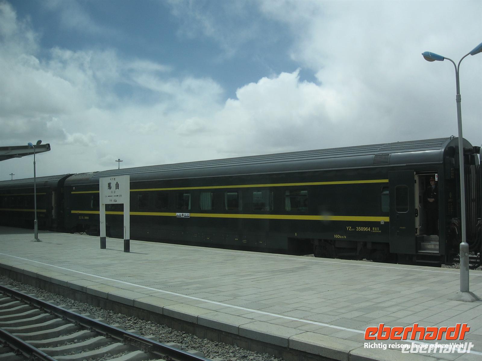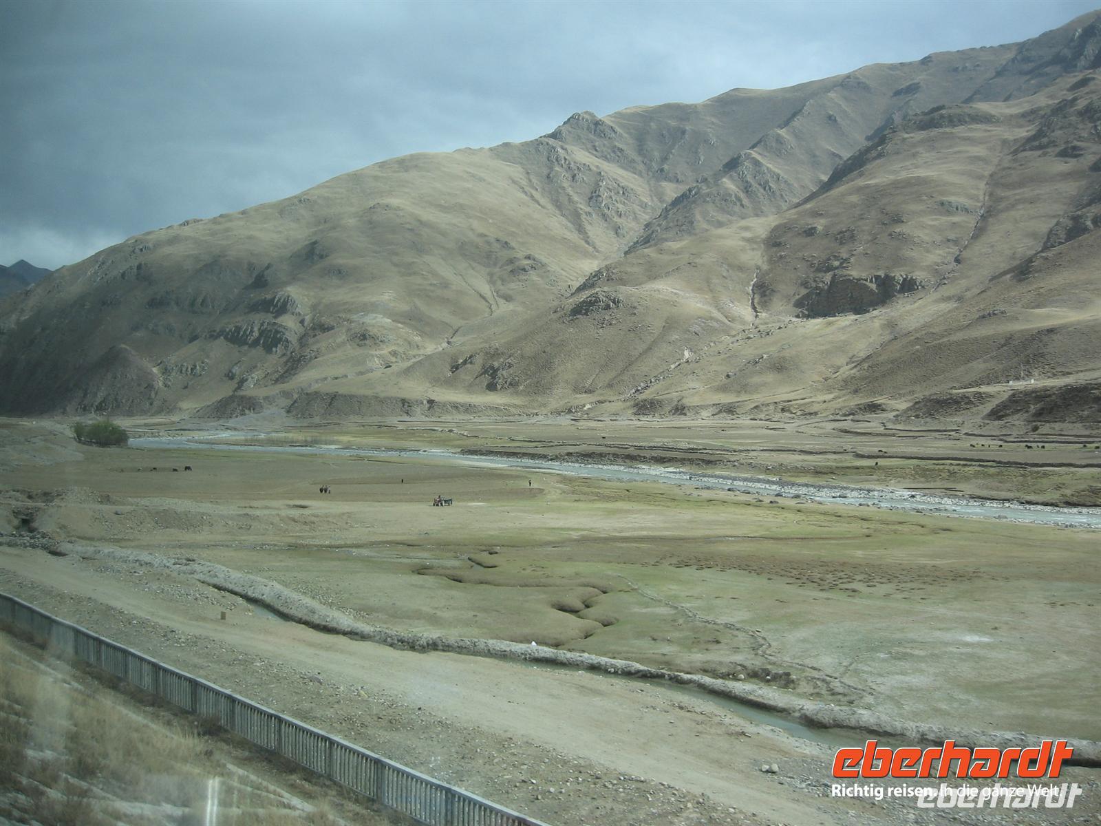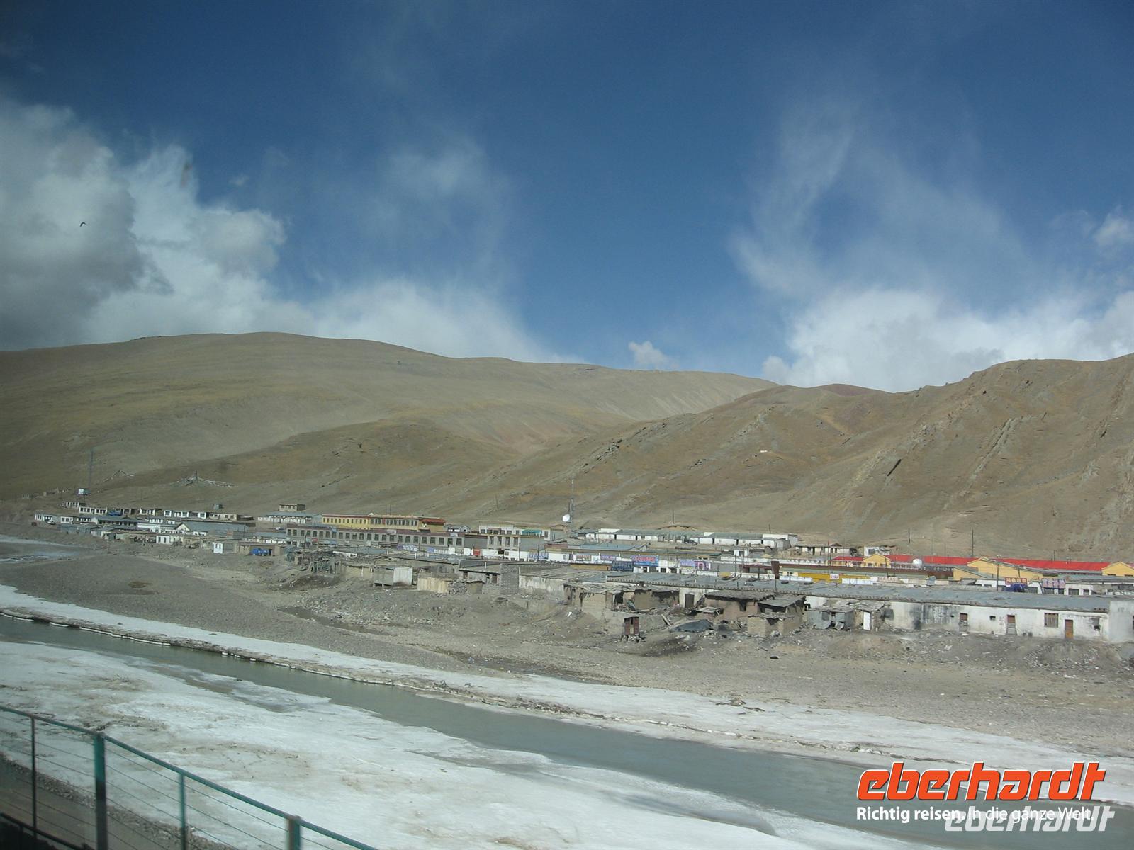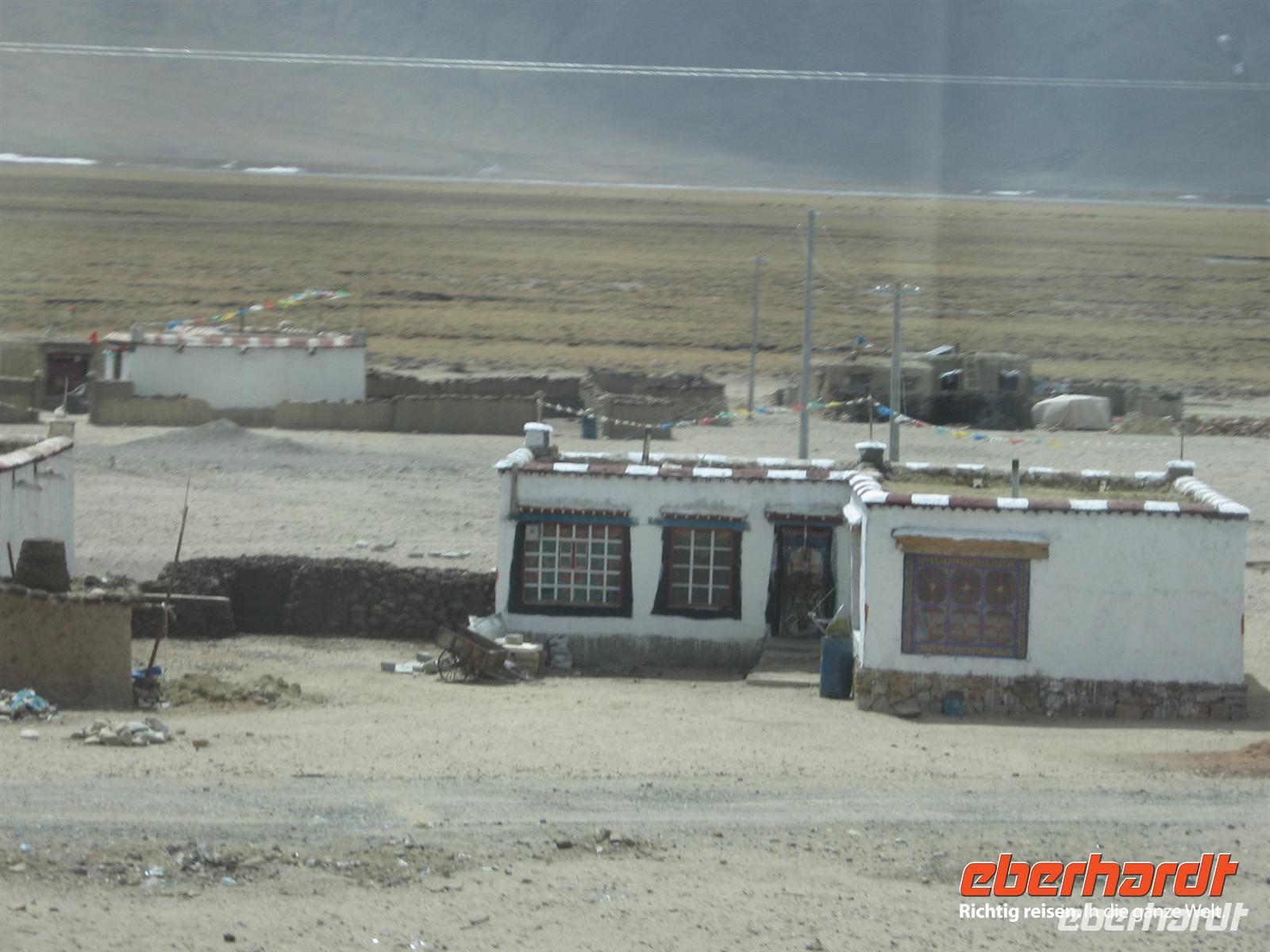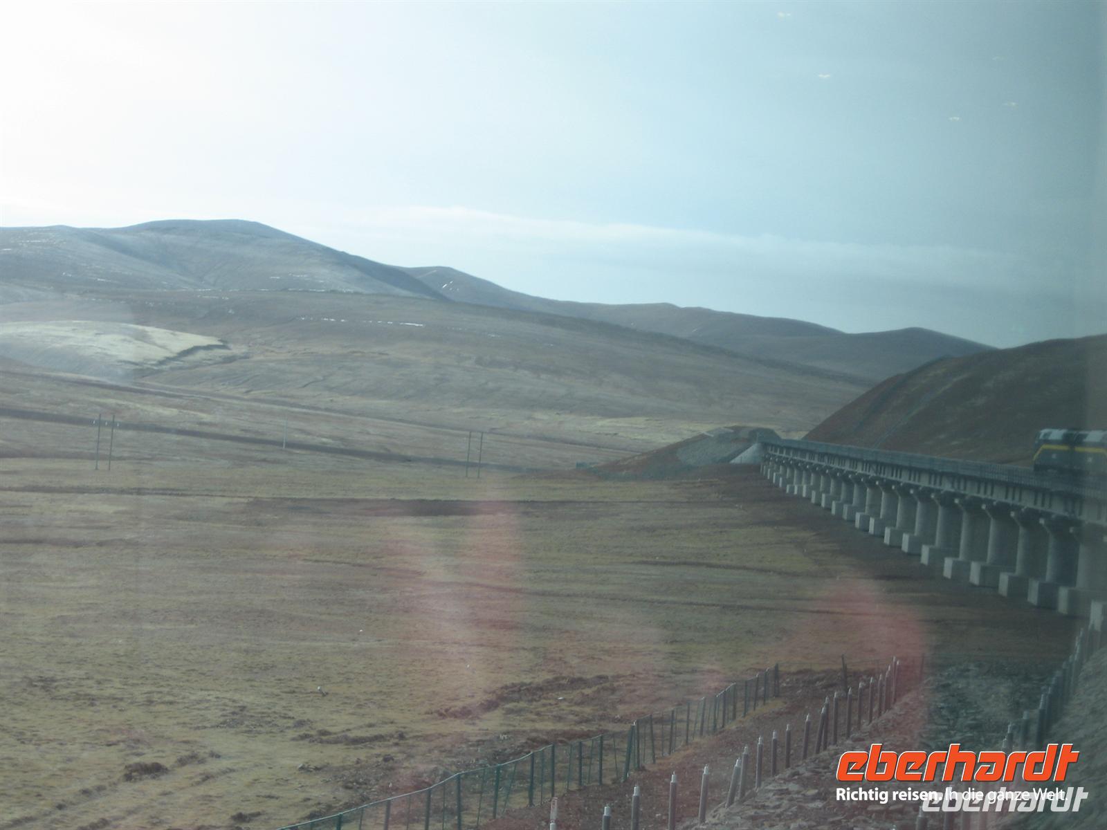 In der Nacht passieren wir den Bahnhof Golmud. Jetzt beginnt der interessantere Teil der Strecke, die eigentliche Tibetbahn. Die nächsten knapp 1.000 Kilometer sind erst im Jahr 2006 fertiggestellt worden und führen teilweise über Dauerfrostboden. Die Landschaft ändert sich auch, sie wird weiter, einsamer. Hohe, zum Teil schneebedeckte Berge ziehen an uns vorüber. Immer wieder sehen wir kleine Siedlungen und erste tibetische Gebetsfahnen. Manchmal mutet es schon komisch an, das daneben auch die chinesische Staatsflagge weht. Gegen Mittag passieren wir den höchst gelegenen Bahnhof der Welt, Tanggula auf 5.068 Metern. Der gleichnamige Pass ist noch 4 Meter höher. Leider sagt uns das Zugpersonal die falsche Seite, so dass wir nicht alle das kleine Bahnhofsgebäude sehen können. Und wie sind wir mit der Höhe klargekommen? Eigentlich alle sehr gut, bei manchem hat sich etwas Druck im Stirnbereich bemerkbar gemacht, aber der Sauerstoff hilft dagegen. Nur ein Gast hatte am Morgen ein wenig Probleme, die im Zug mitreisende Ärztin war aber sofort zur Stelle, so dass es ihm schnell wieder besser ging. Sie hat den Sauerstoffgehalt im Blut gemessen und auch Blutdruck und einige Regeln zum weiteren Verhalten gegeben. Ein kurzer Zwischenstopp in Na Qu erlaubt uns einen kurzen Sprung an die frische Luft, um ein Foto zu machen, dann klingelt am Bahnsteig schon das Signal zum Einsteigen und es geht weiter. Noch gut drei Stunden bis Lhasa.