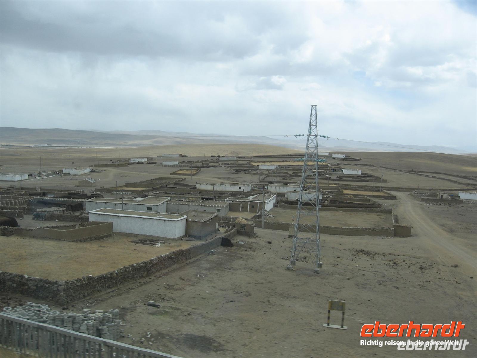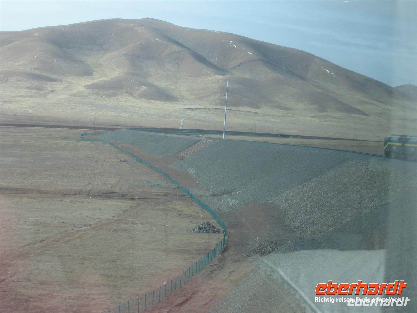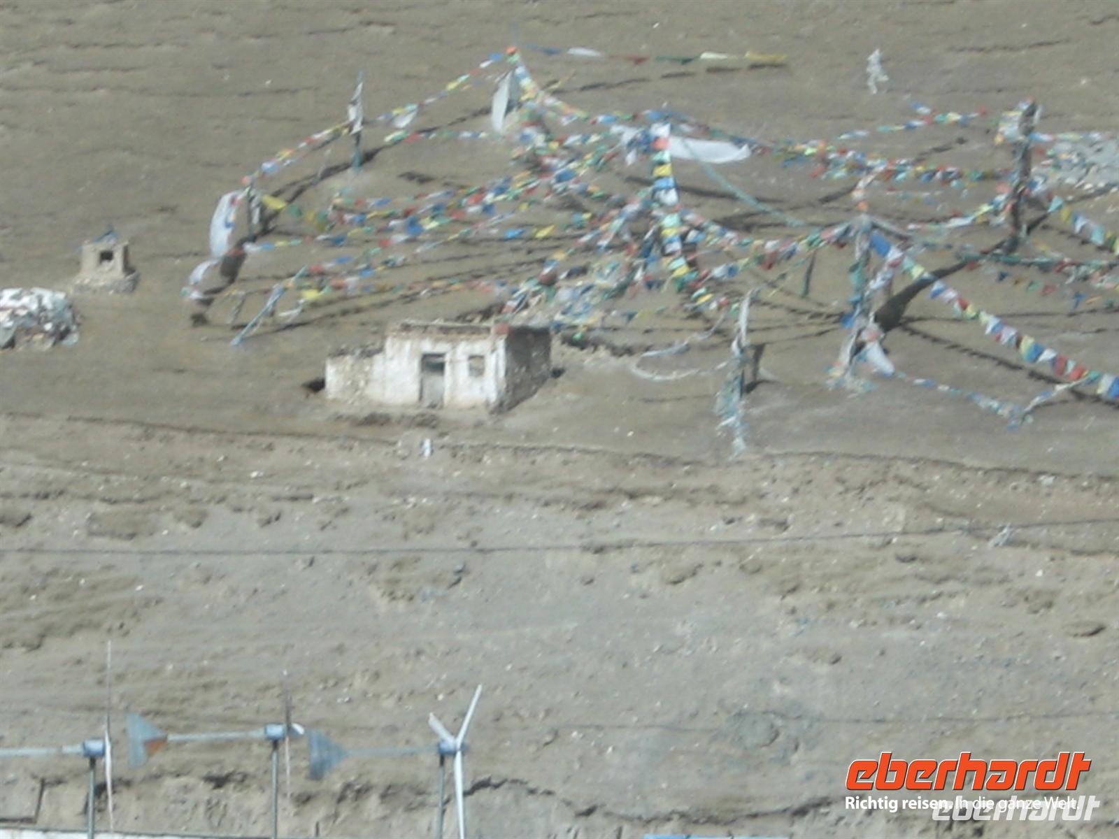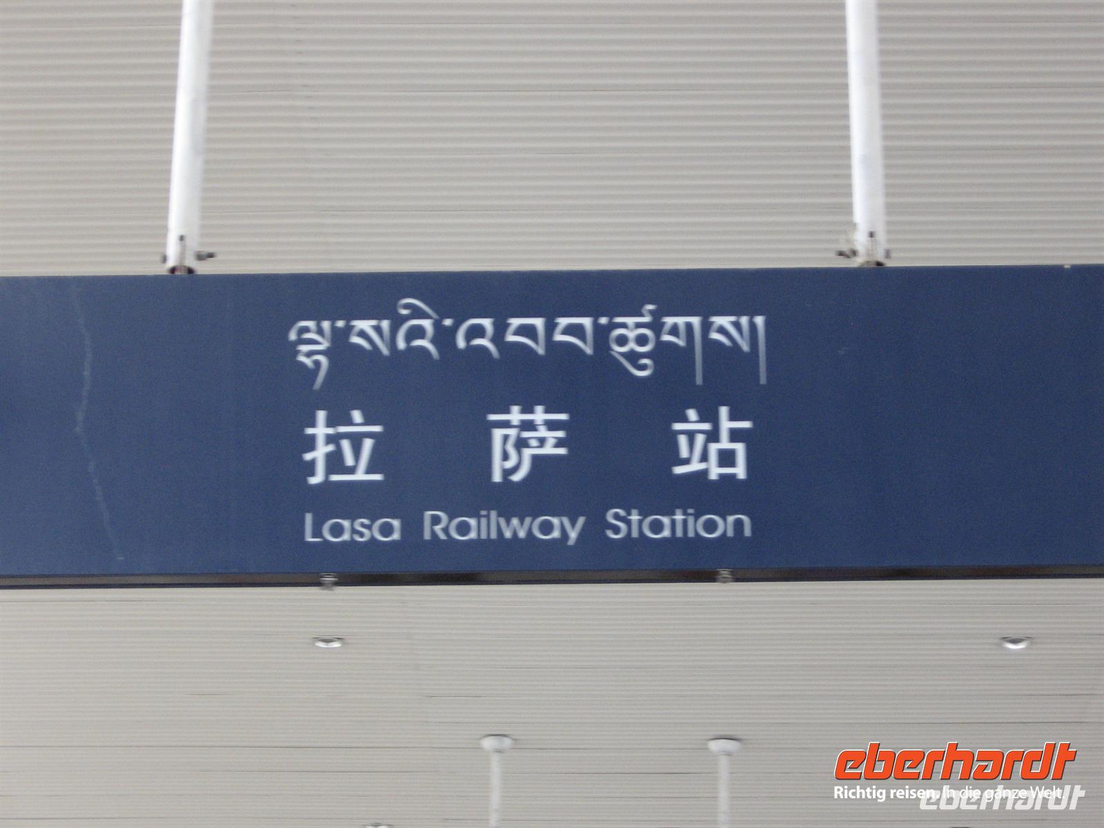 In der Nacht passieren wir den Bahnhof Golmud. Jetzt beginnt der interessantere Teil der Strecke, die eigentliche Tibetbahn. Die nächsten knapp 1.000 Kilometer sind erst im Jahr 2006 fertiggestellt worden und führen teilweise über Dauerfrostboden. Die Landschaft ändert sich auch, sie wird weiter, einsamer. Hohe, zum Teil schneebedeckte Berge ziehen an uns vorüber. Immer wieder sehen wir kleine Siedlungen und erste tibetische Gebetsfahnen. Manchmal mutet es schon komisch an, das daneben auch die chinesische Staatsflagge weht. Gegen Mittag passieren wir den höchst gelegenen Bahnhof der Welt, Tanggula auf 5.068 Metern. Der gleichnamige Pass ist noch 4 Meter höher. Leider sagt uns das Zugpersonal die falsche Seite, so dass wir nicht alle das kleine Bahnhofsgebäude sehen können. Und wie sind wir mit der Höhe klargekommen? Eigentlich alle sehr gut, bei manchem hat sich etwas Druck im Stirnbereich bemerkbar gemacht, aber der Sauerstoff hilft dagegen. Nur ein Gast hatte am Morgen ein wenig Probleme, die im Zug mitreisende Ärztin war aber sofort zur Stelle, so dass es ihm schnell wieder besser ging. Sie hat den Sauerstoffgehalt im Blut gemessen und auch Blutdruck und einige Regeln zum weiteren Verhalten gegeben. Ein kurzer Zwischenstopp in Na Qu erlaubt uns einen kurzen Sprung an die frische Luft, um ein Foto zu machen, dann klingelt am Bahnsteig schon das Signal zum Einsteigen und es geht weiter. Noch gut drei Stunden bis Lhasa.
