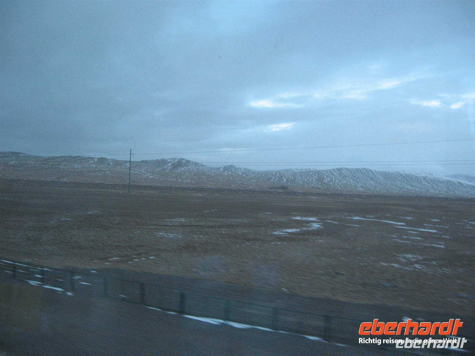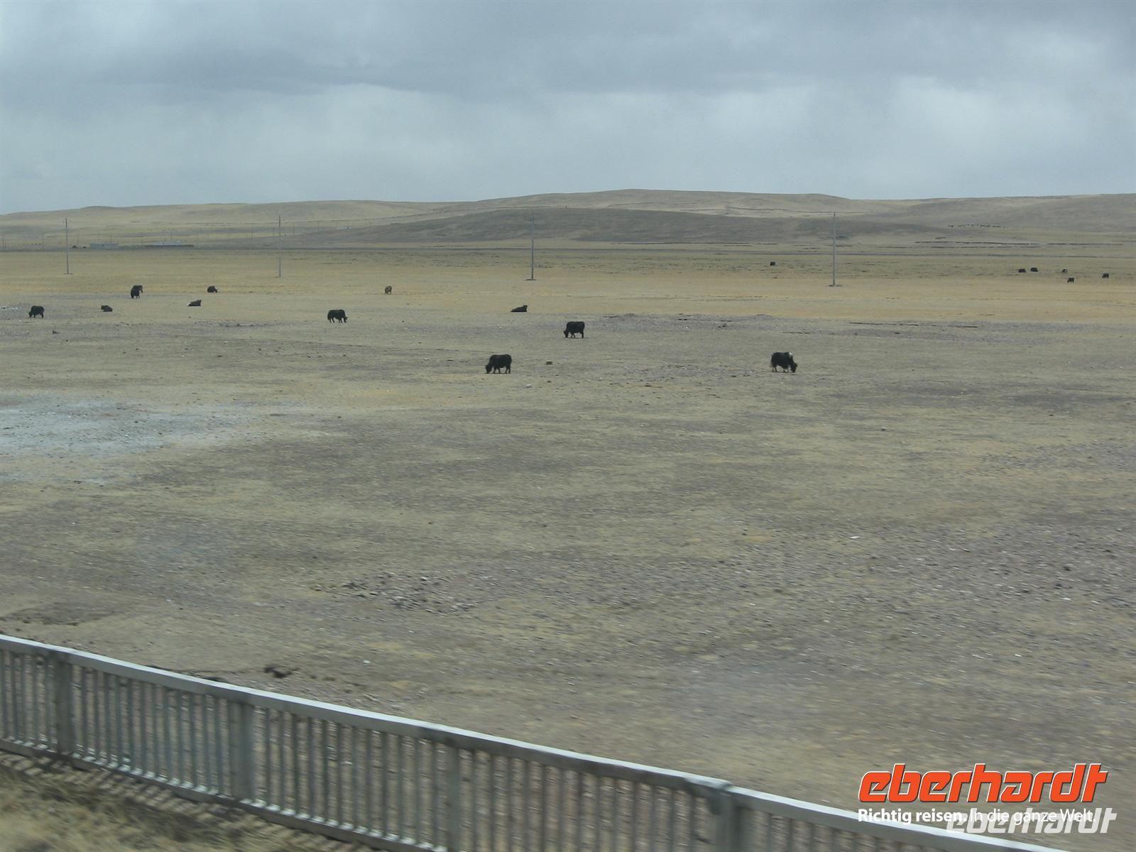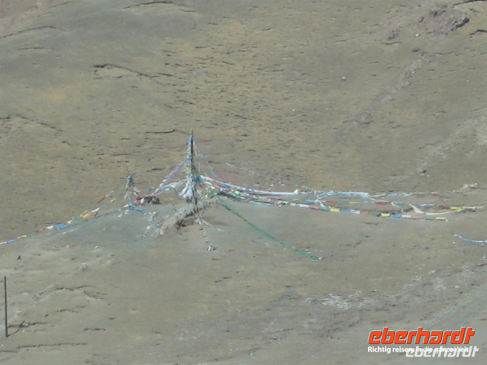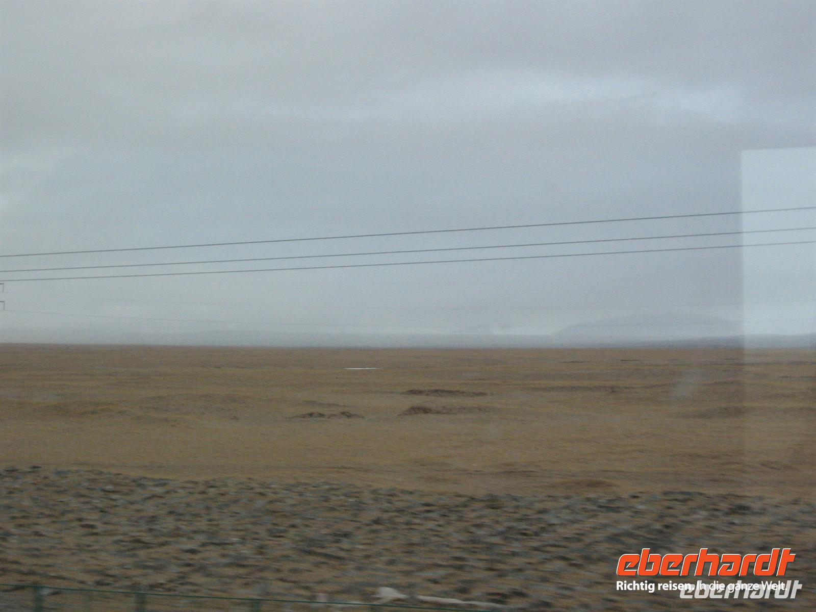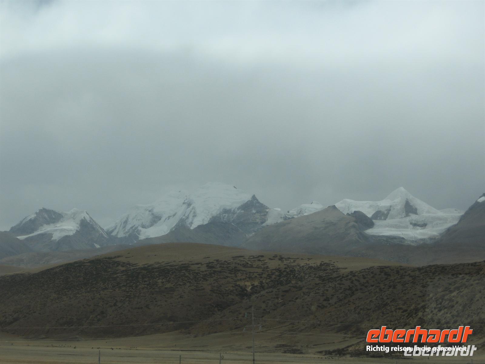 In der Nacht passieren wir den Bahnhof Golmud. Jetzt beginnt der interessantere Teil der Strecke, die eigentliche Tibetbahn. Die nächsten knapp 1.000 Kilometer sind erst im Jahr 2006 fertiggestellt worden und führen teilweise über Dauerfrostboden. Die Landschaft ändert sich auch, sie wird weiter, einsamer. Hohe, zum Teil schneebedeckte Berge ziehen an uns vorüber. Immer wieder sehen wir kleine Siedlungen und erste tibetische Gebetsfahnen. Manchmal mutet es schon komisch an, das daneben auch die chinesische Staatsflagge weht. Gegen Mittag passieren wir den höchst gelegenen Bahnhof der Welt, Tanggula auf 5.068 Metern. Der gleichnamige Pass ist noch 4 Meter höher. Leider sagt uns das Zugpersonal die falsche Seite, so dass wir nicht alle das kleine Bahnhofsgebäude sehen können. Und wie sind wir mit der Höhe klargekommen? Eigentlich alle sehr gut, bei manchem hat sich etwas Druck im Stirnbereich bemerkbar gemacht, aber der Sauerstoff hilft dagegen. Nur ein Gast hatte am Morgen ein wenig Probleme, die im Zug mitreisende Ärztin war aber sofort zur Stelle, so dass es ihm schnell wieder besser ging. Sie hat den Sauerstoffgehalt im Blut gemessen und auch Blutdruck und einige Regeln zum weiteren Verhalten gegeben. Ein kurzer Zwischenstopp in Na Qu erlaubt uns einen kurzen Sprung an die frische Luft, um ein Foto zu machen, dann klingelt am Bahnsteig schon das Signal zum Einsteigen und es geht weiter. Noch gut drei Stunden bis Lhasa.