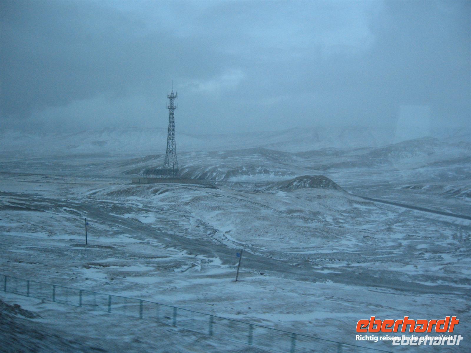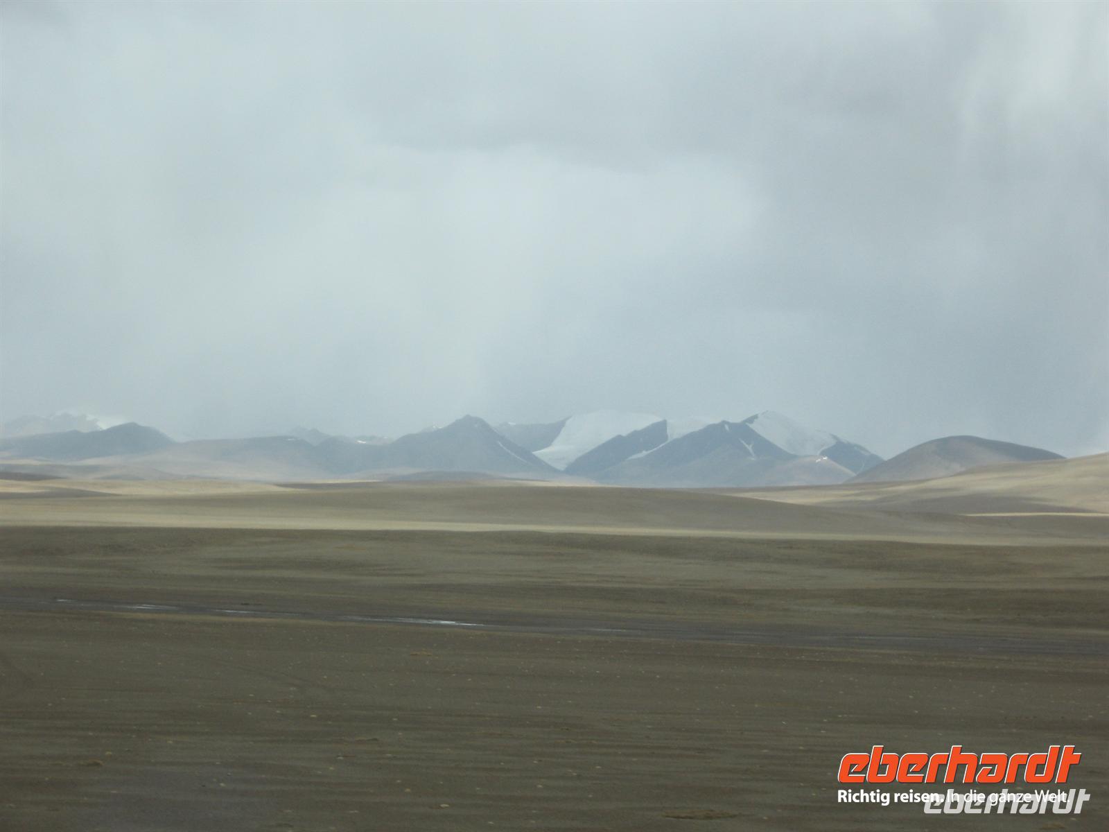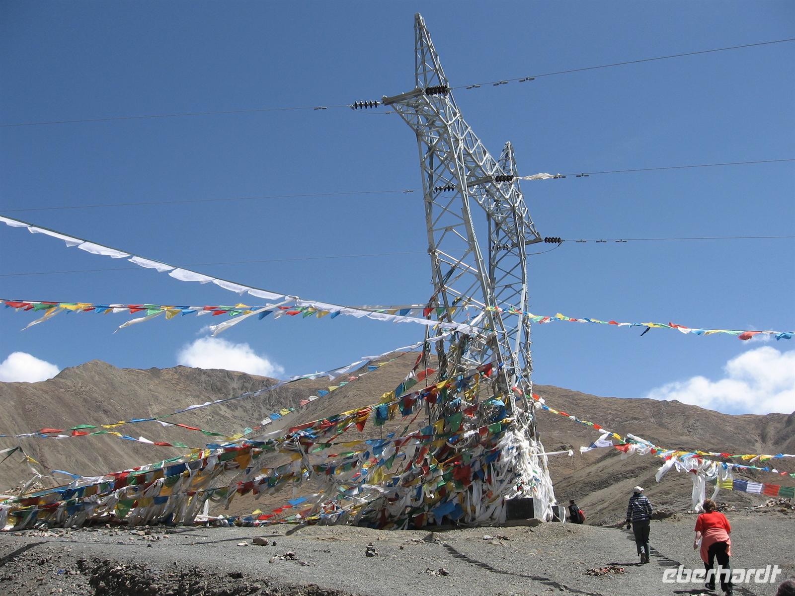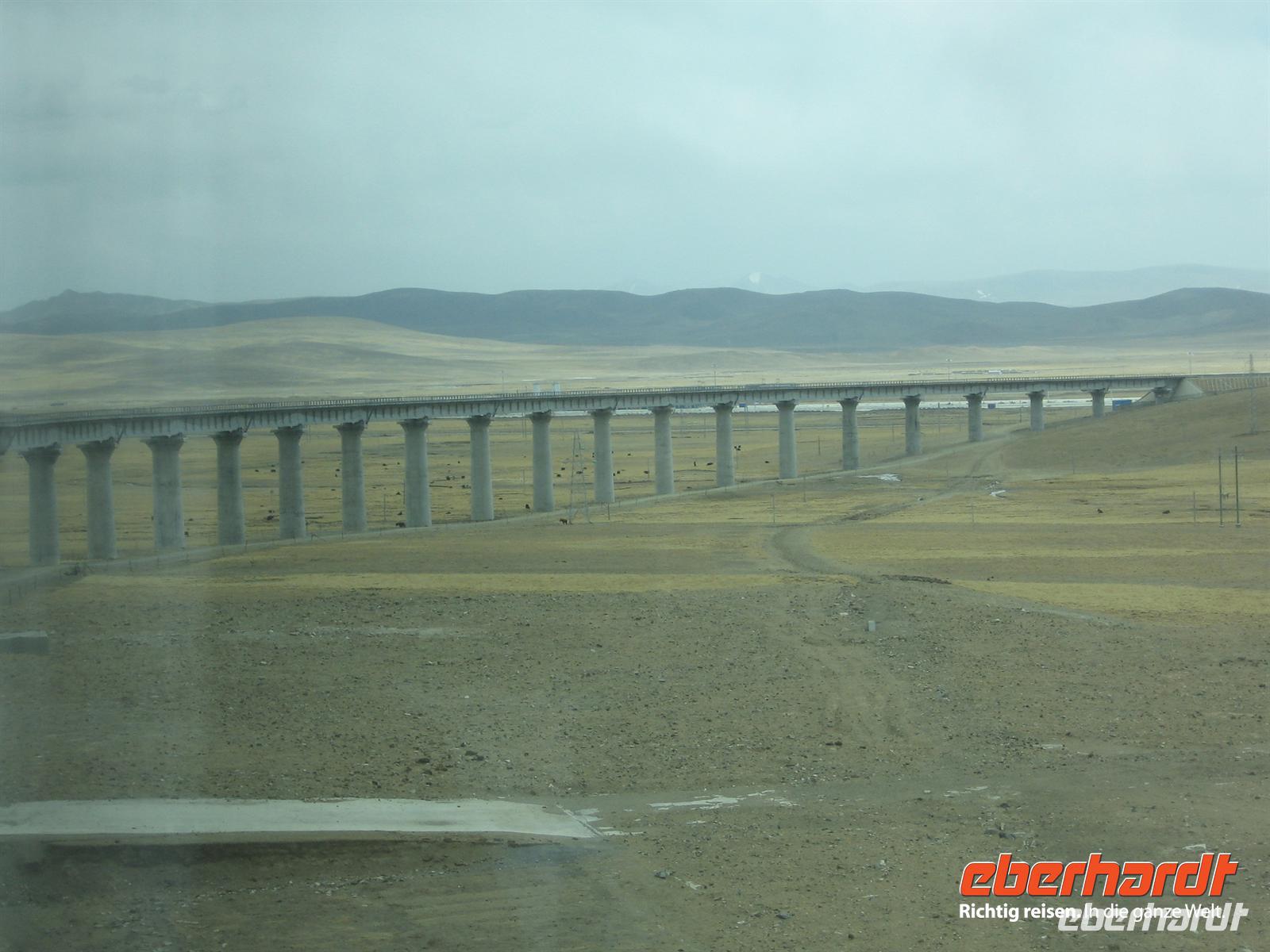 In der Nacht passieren wir den Bahnhof Golmud. Jetzt beginnt der interessantere Teil der Strecke, die eigentliche Tibetbahn. Die nächsten knapp 1.000 Kilometer sind erst im Jahr 2006 fertiggestellt worden und führen teilweise über Dauerfrostboden. Die Landschaft ändert sich auch, sie wird weiter, einsamer. Hohe, zum Teil schneebedeckte Berge ziehen an uns vorüber. Immer wieder sehen wir kleine Siedlungen und erste tibetische Gebetsfahnen. Manchmal mutet es schon komisch an, das daneben auch die chinesische Staatsflagge weht. Gegen Mittag passieren wir den höchst gelegenen Bahnhof der Welt, Tanggula auf 5.068 Metern. Der gleichnamige Pass ist noch 4 Meter höher. Leider sagt uns das Zugpersonal die falsche Seite, so dass wir nicht alle das kleine Bahnhofsgebäude sehen können. Und wie sind wir mit der Höhe klargekommen? Eigentlich alle sehr gut, bei manchem hat sich etwas Druck im Stirnbereich bemerkbar gemacht, aber der Sauerstoff hilft dagegen. Nur ein Gast hatte am Morgen ein wenig Probleme, die im Zug mitreisende Ärztin war aber sofort zur Stelle, so dass es ihm schnell wieder besser ging. Sie hat den Sauerstoffgehalt im Blut gemessen und auch Blutdruck und einige Regeln zum weiteren Verhalten gegeben. Ein kurzer Zwischenstopp in Na Qu erlaubt uns einen kurzen Sprung an die frische Luft, um ein Foto zu machen, dann klingelt am Bahnsteig schon das Signal zum Einsteigen und es geht weiter. Noch gut drei Stunden bis Lhasa.