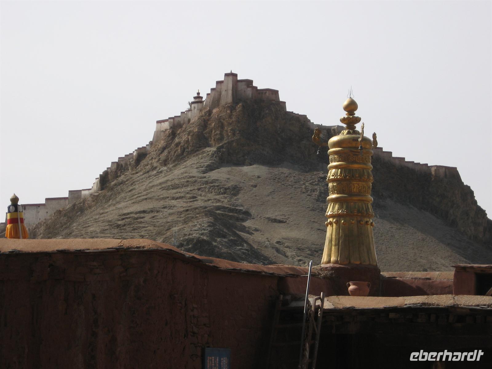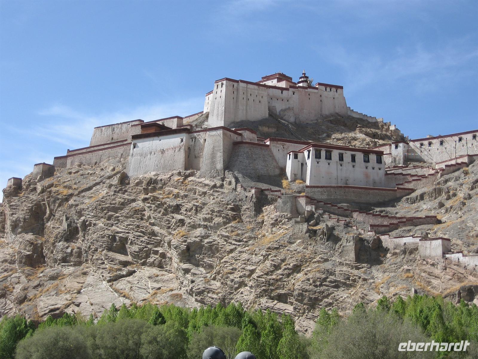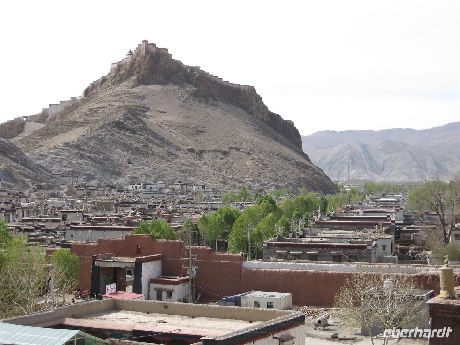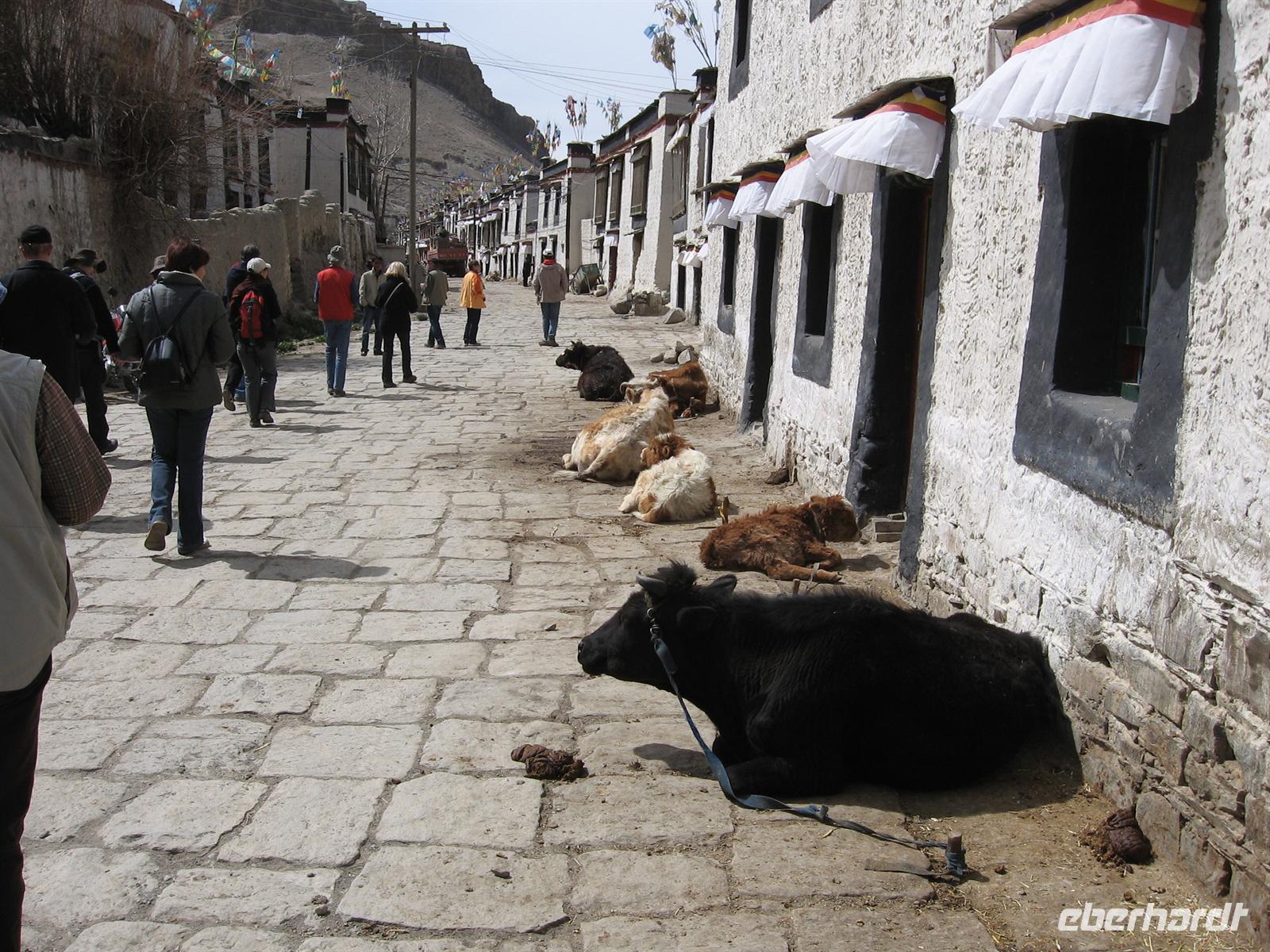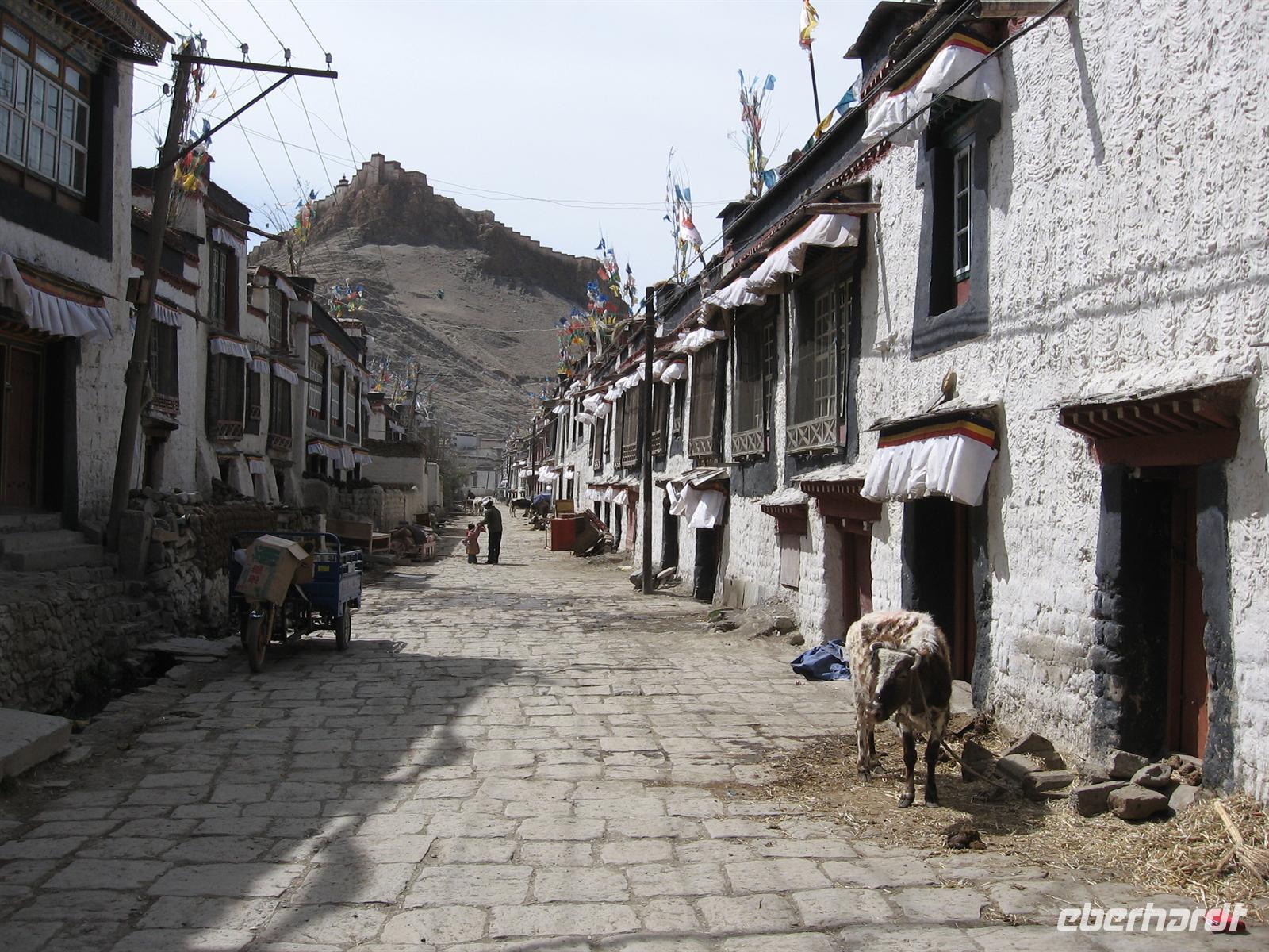 Oberhalb des Klosters befindet sich die einzige noch erhaltene Festungsanlage Tibets, genannt Dzong. Vom Kloster aus laufen wir durch die noch weitgehend erhaltene Altstadt von Gyantse mit ihren weiß getünchten Fassaden und farbenfroh dekorierten Gesimsen, Fenstern und Türen. Wie in früheren Zeiten lebt das Vieh vor den Häusern, sehr schön auch die Begegnung mit Einheimischen.