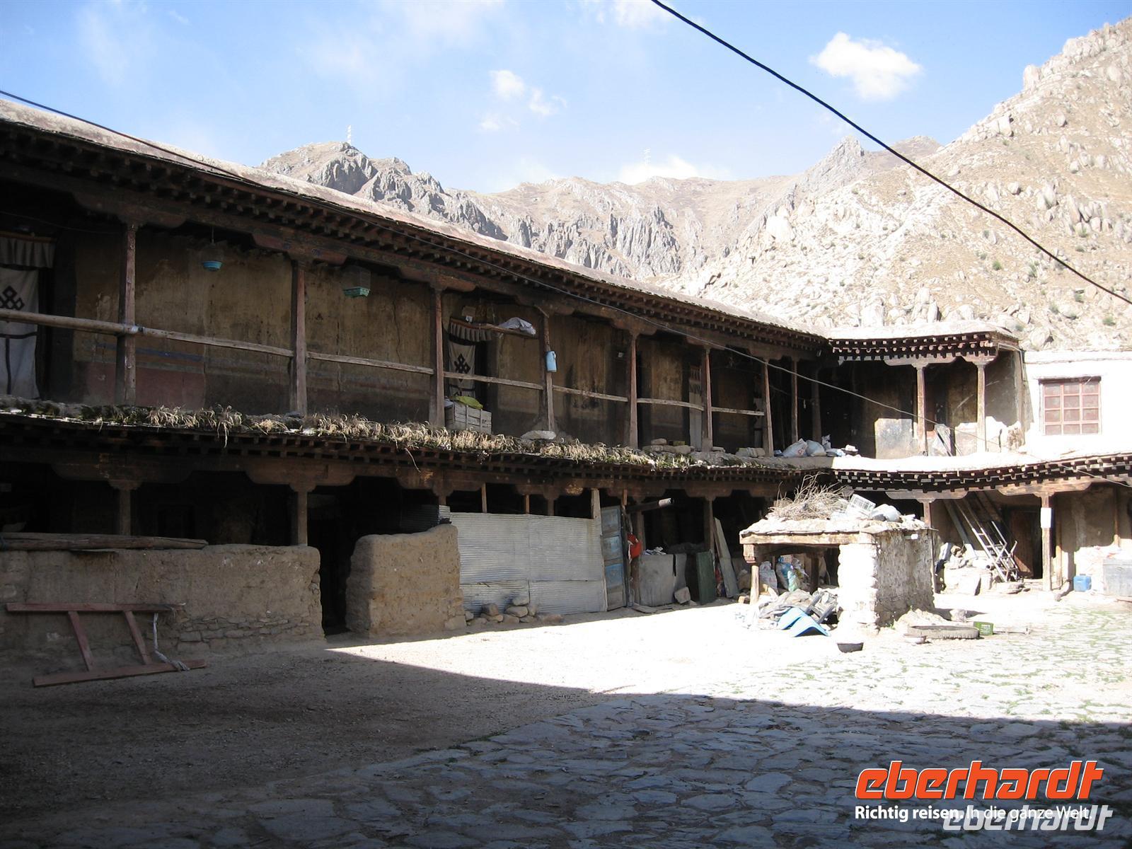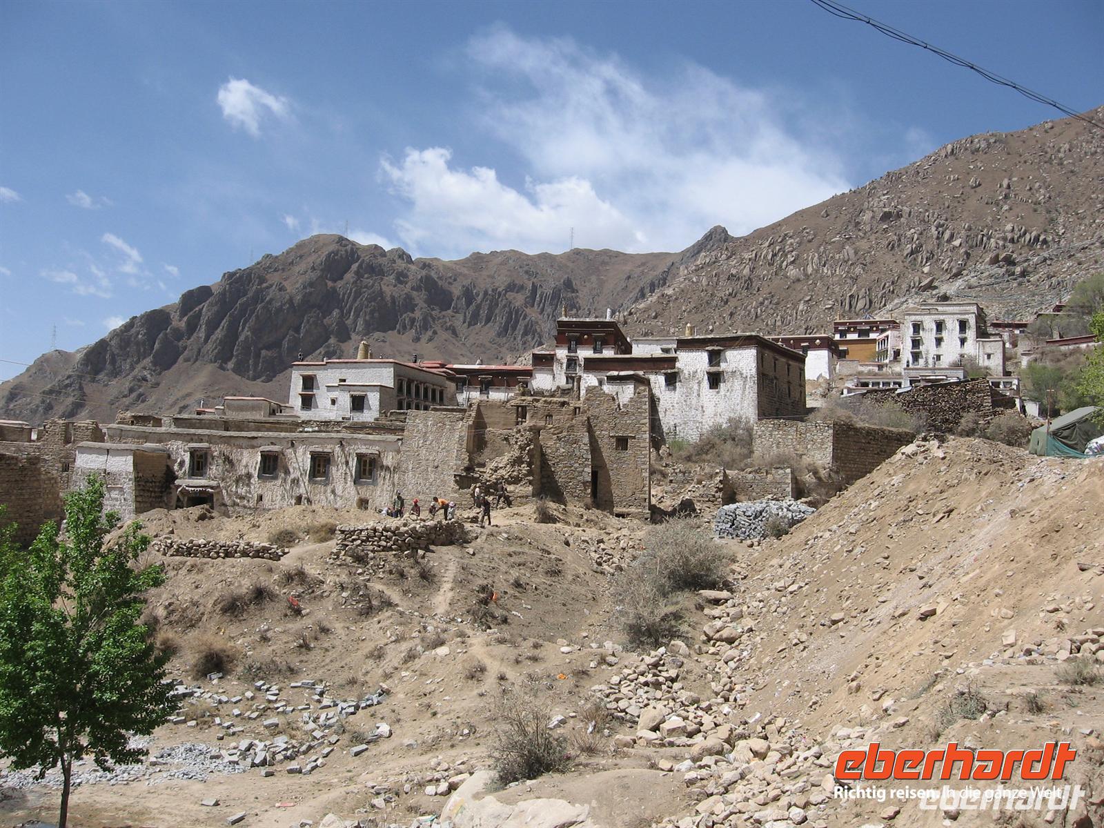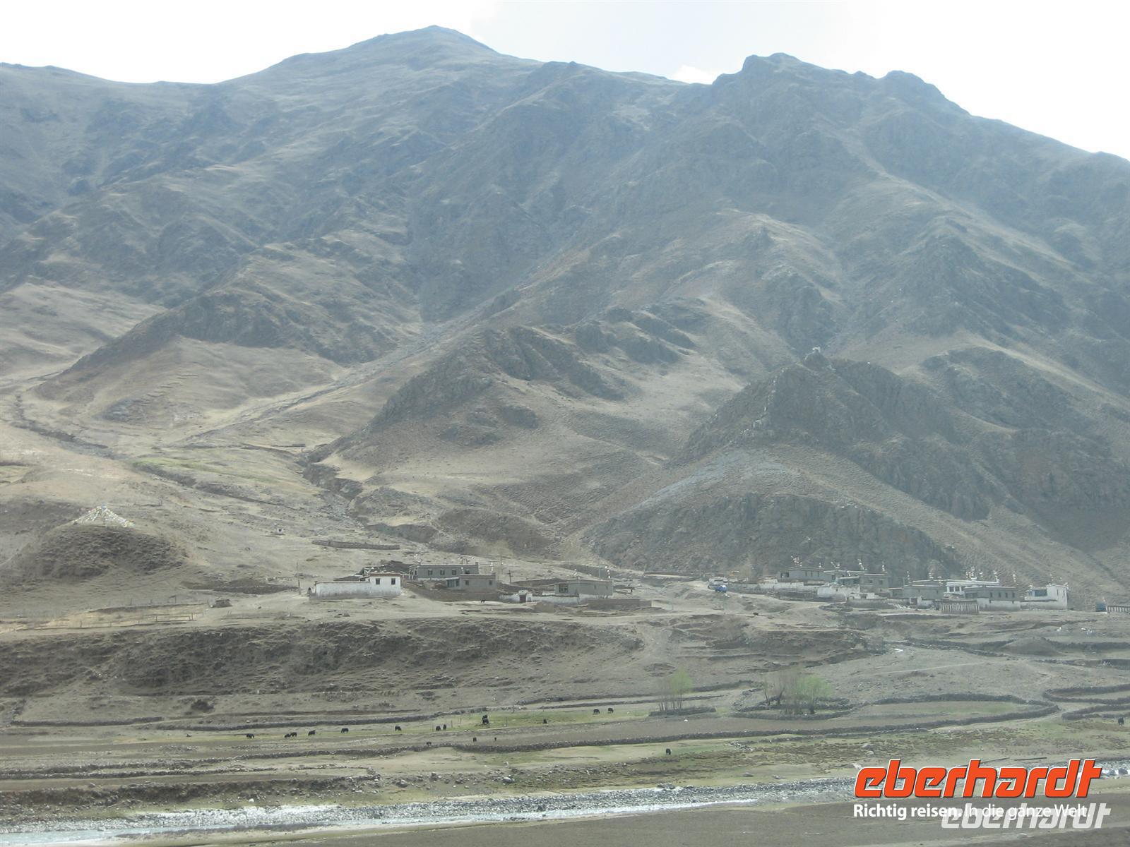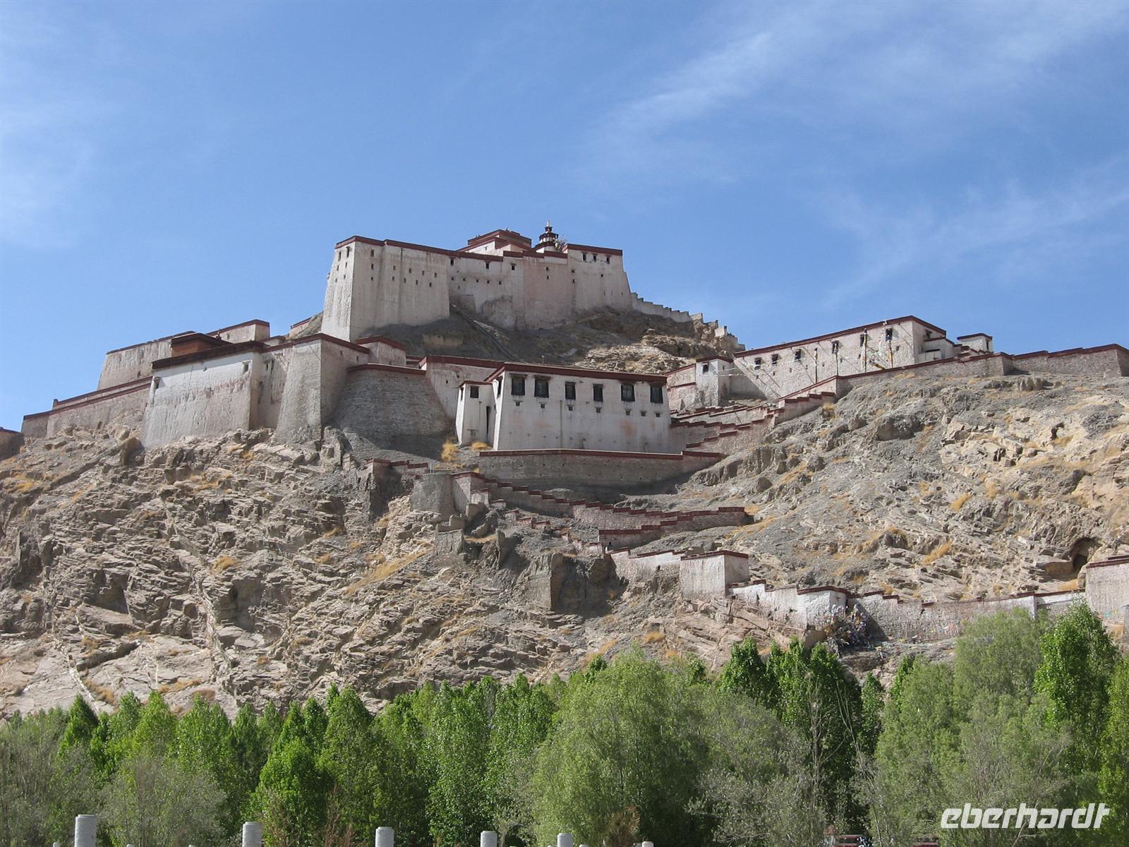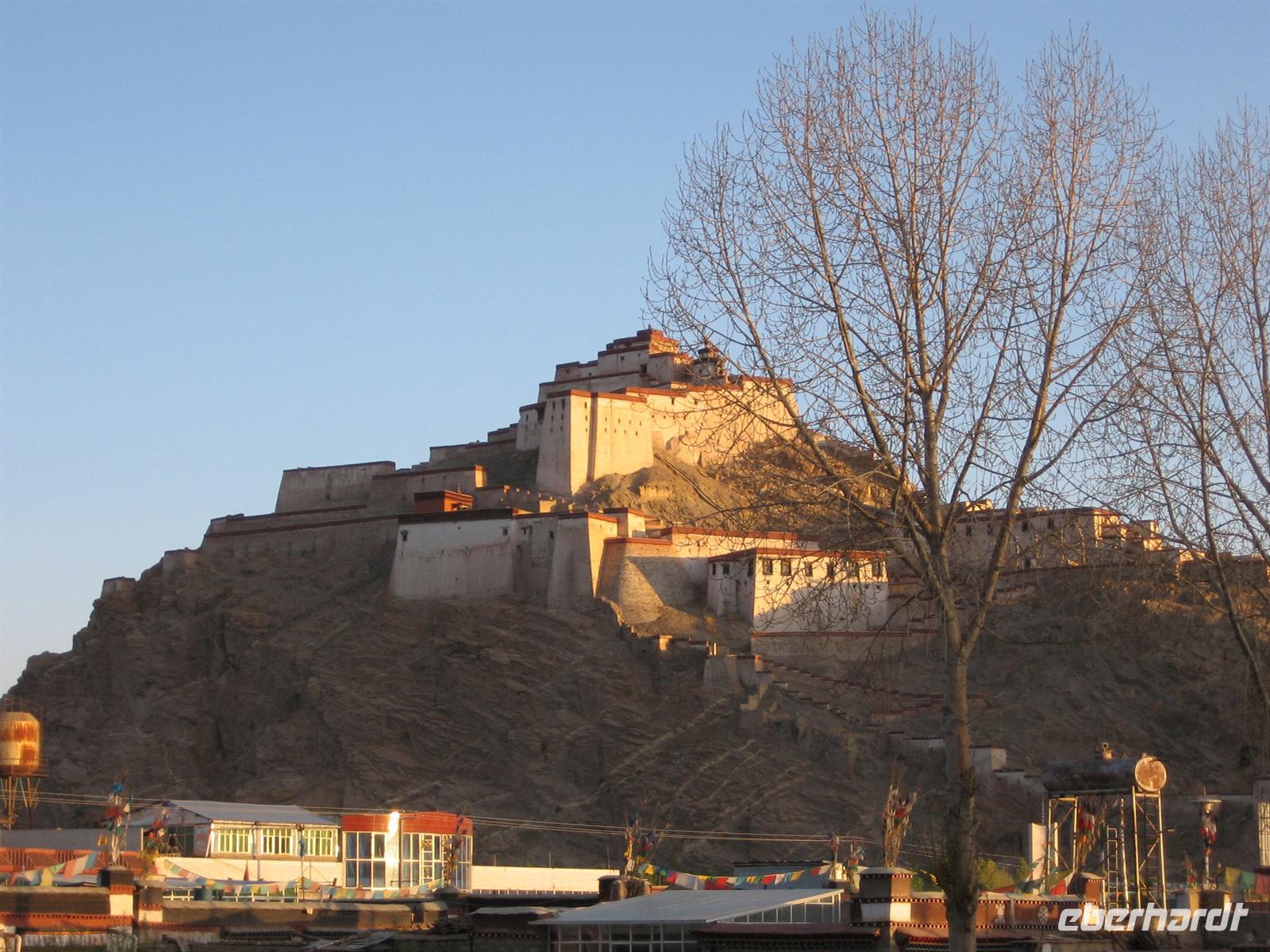 Oberhalb des Klosters befindet sich die einzige noch erhaltene Festungsanlage Tibets, genannt Dzong. Vom Kloster aus laufen wir durch die noch weitgehend erhaltene Altstadt von Gyantse mit ihren weiß getünchten Fassaden und farbenfroh dekorierten Gesimsen, Fenstern und Türen. Wie in früheren Zeiten lebt das Vieh vor den Häusern, sehr schön auch die Begegnung mit Einheimischen.