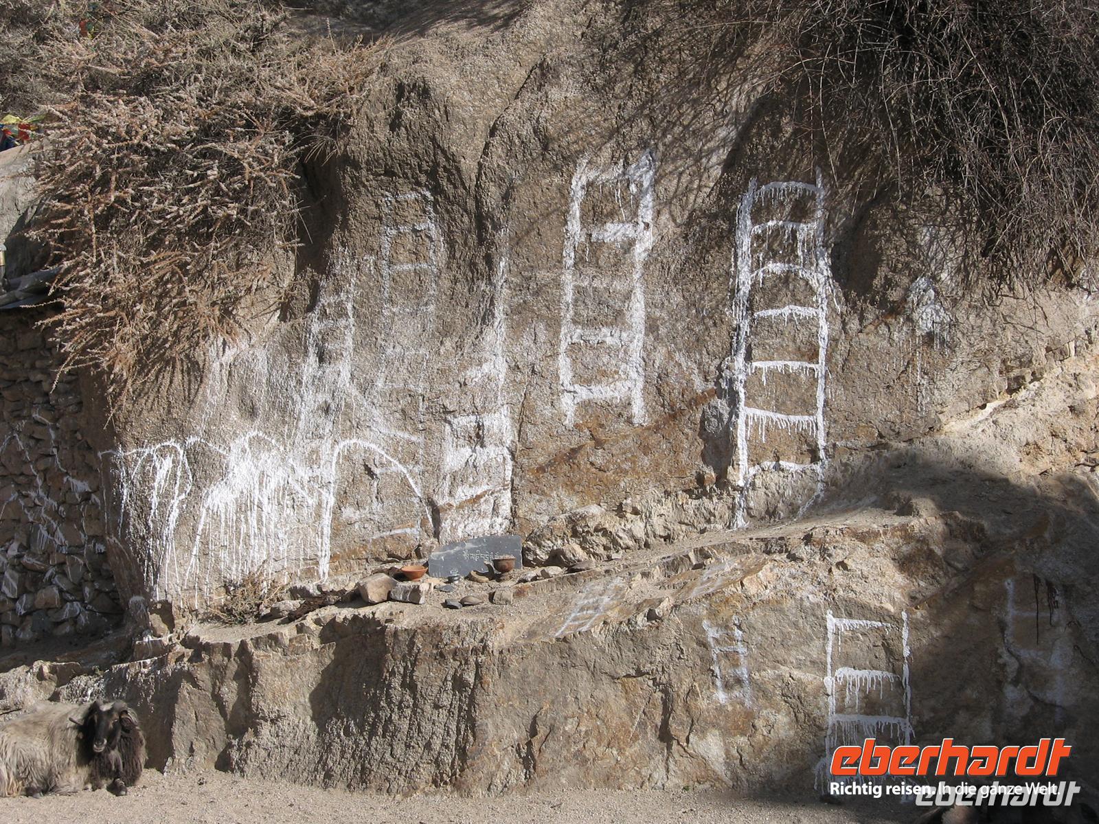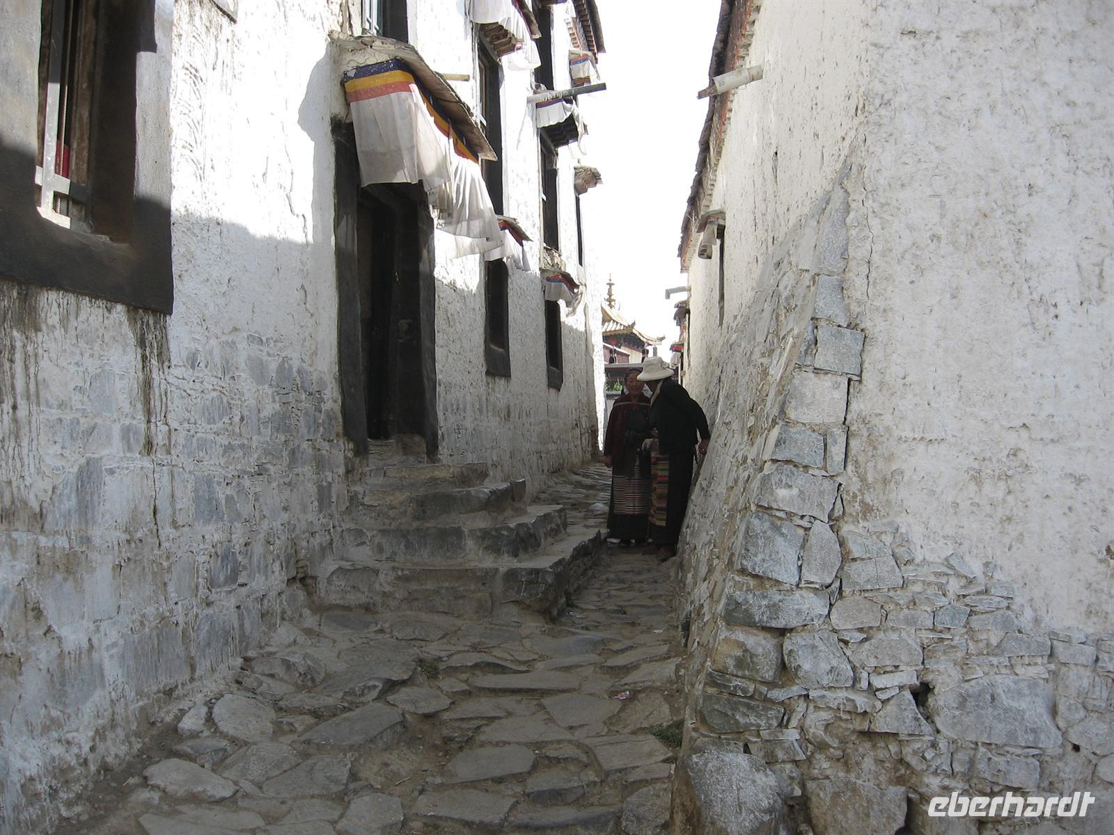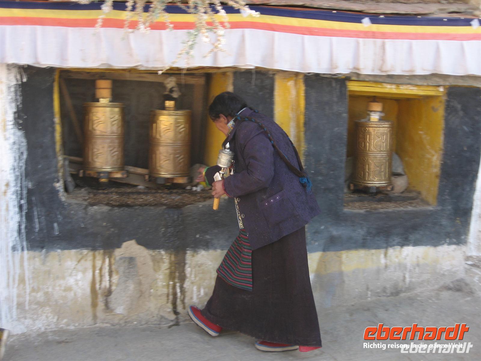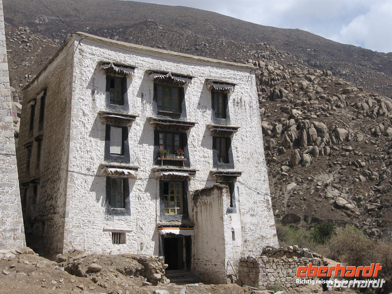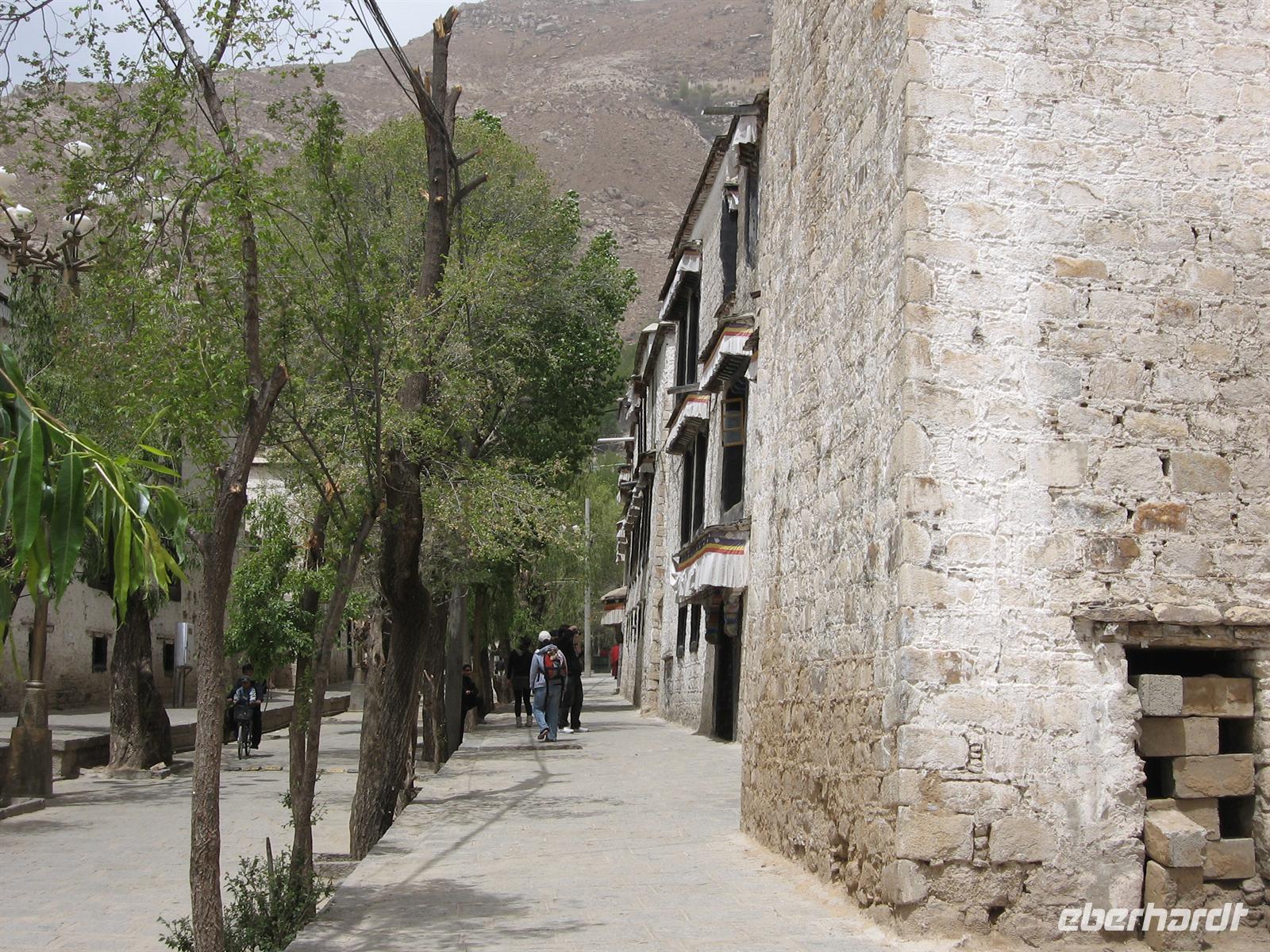 Oberhalb des Klosters befindet sich die einzige noch erhaltene Festungsanlage Tibets, genannt Dzong. Vom Kloster aus laufen wir durch die noch weitgehend erhaltene Altstadt von Gyantse mit ihren weiß getünchten Fassaden und farbenfroh dekorierten Gesimsen, Fenstern und Türen. Wie in früheren Zeiten lebt das Vieh vor den Häusern, sehr schön auch die Begegnung mit Einheimischen.