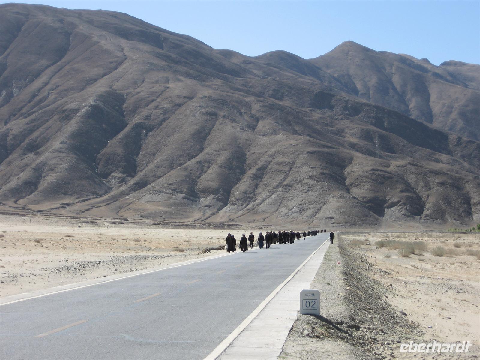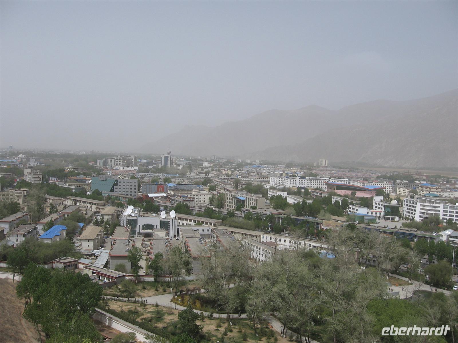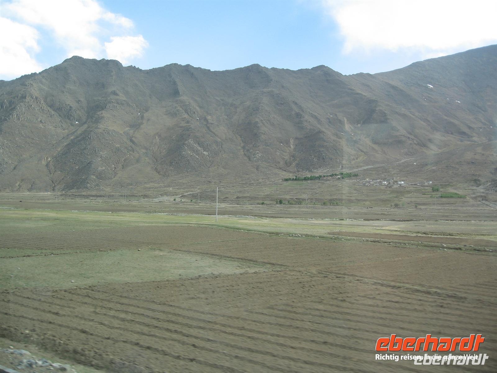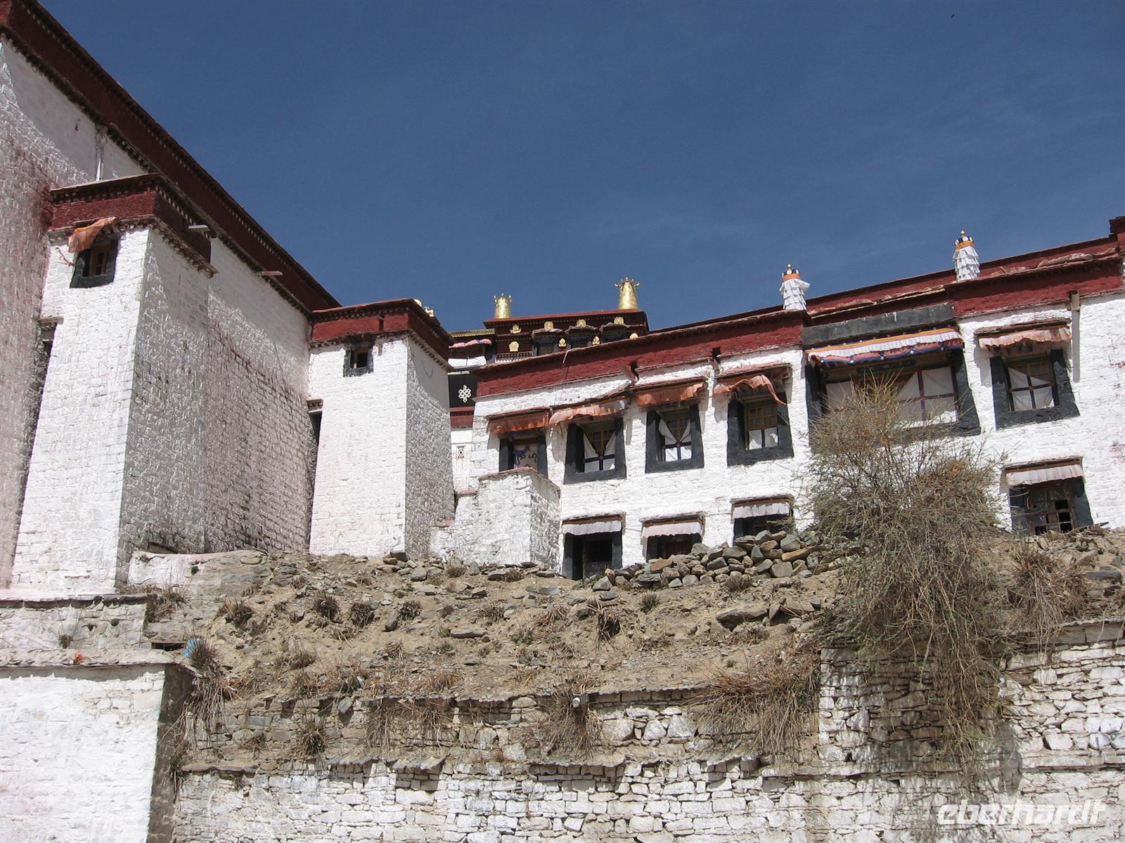 Heute besuchen wir das gut 60 Kilometer außerhalb von Lhasa gelegene Ganden-Kloster. Zuerst überqueren wir auf einer der neuen Brücken den Lhasa-Fluss, um dann an dessen Südufer entlang zu fahren. Weithin sichtbar ist der Potala-Palast zu sehen. Denkt man sich 20 oder 30 Jahre zurück, eine Zeit als es die moderne Stadt Lhasa noch nicht gab, dann lässt sich die beeindruckende Erscheinung und Wirkung auf die buddhistischen Pilger sehr gut nachvollziehen. Entlang der Straße sehen wir immer wieder Dörfer und zahlreich Menschen bei der Arbeit auf dem Feld, aber auch kleine Industrien sind zu sehen.