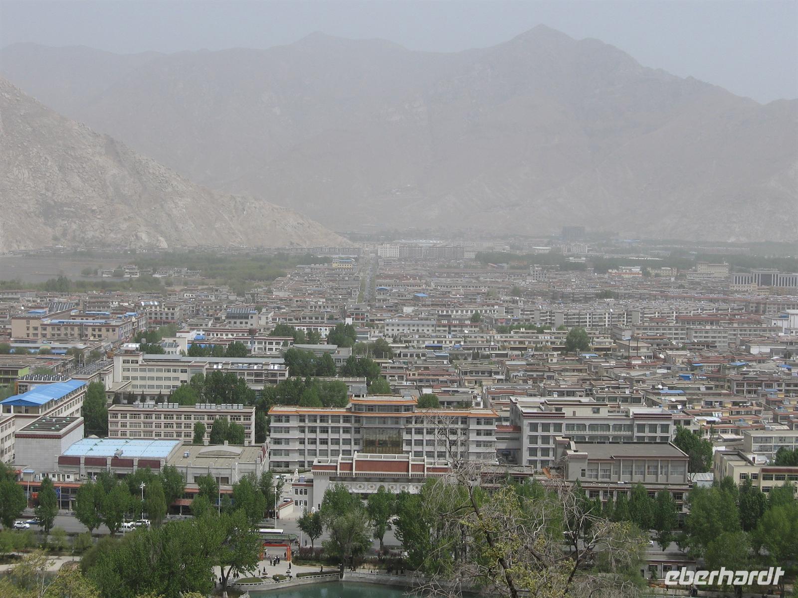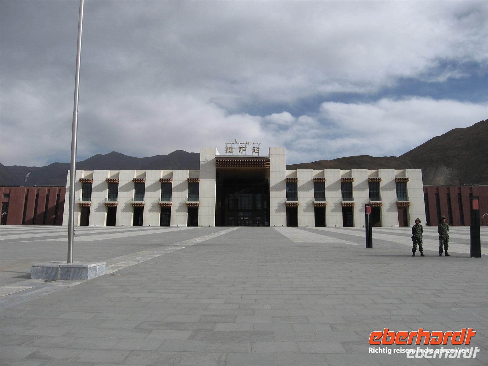 Jetzt passieren wir das Nianging Tanggula-Gebirge, dessen höchster Gipfel mit gleichem Namen, 7.160 Meter hoch. Es ist ein faszinierender Anblick. Von Weitem können wir dann schon den Potala sehen, das heißt wir sind gleich in Lhasa. Gegen 18 Uhr kommen wir an, in einem riesigen modernen Bahnhofsgebäude. Dieses muss schnellstmöglich verlassen werden, so dass die Eisenbahnfreunde unter uns nicht einmal die Lokomotive richtig fotografieren können. Das Gebäude ist streng bewacht, überall ist Militär zu sehen. Wir gehen zum Bus und werden von unserem tibetischen Reiseleiter, Herrn Lotze, herzlich begrüßt. Als symbolisches Begrüßungsgeschenk erhält jeder von uns ein weißes Tuch, Taka genannt. Unser Hotel liegt sehr zentral und ist schnell erreicht. Nach der Schlüsselausgabe sehnen sich alle nach einer Dusche und später nach einem guten Abendessen. Letzteres ist sehr lecker und übertrifft unsere Erwartungen. Einige gehen noch etwas auf Erkundungstour, doch die meisten von uns freuen sich auf ihr Bett.